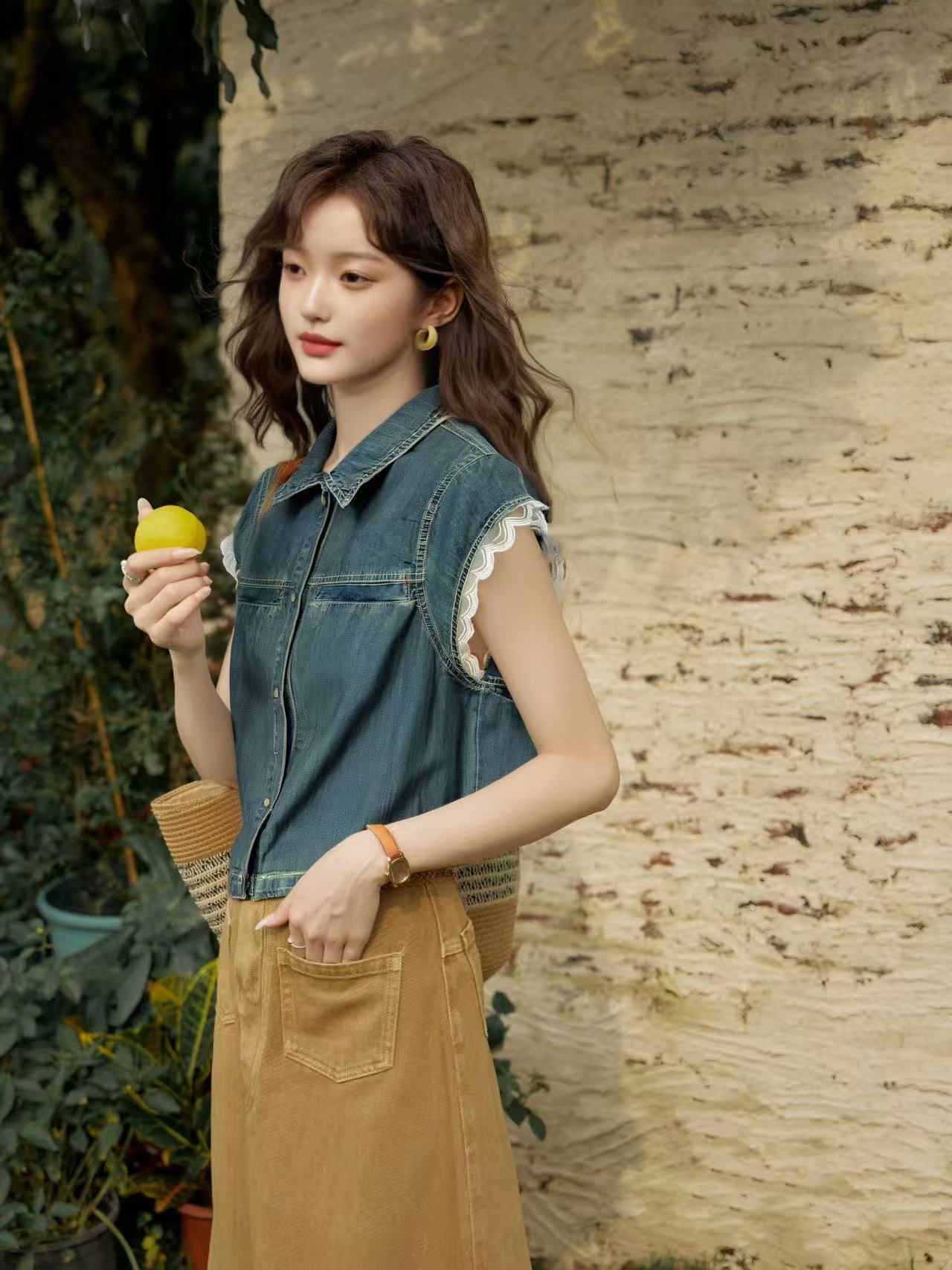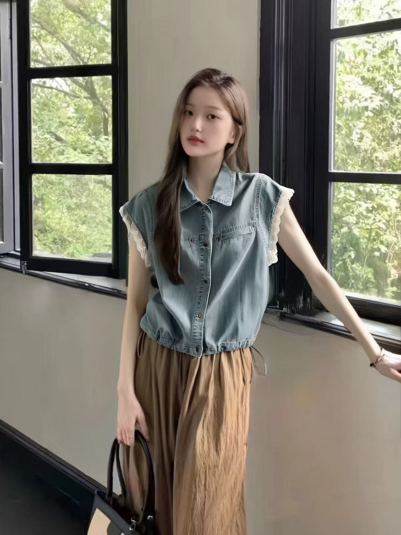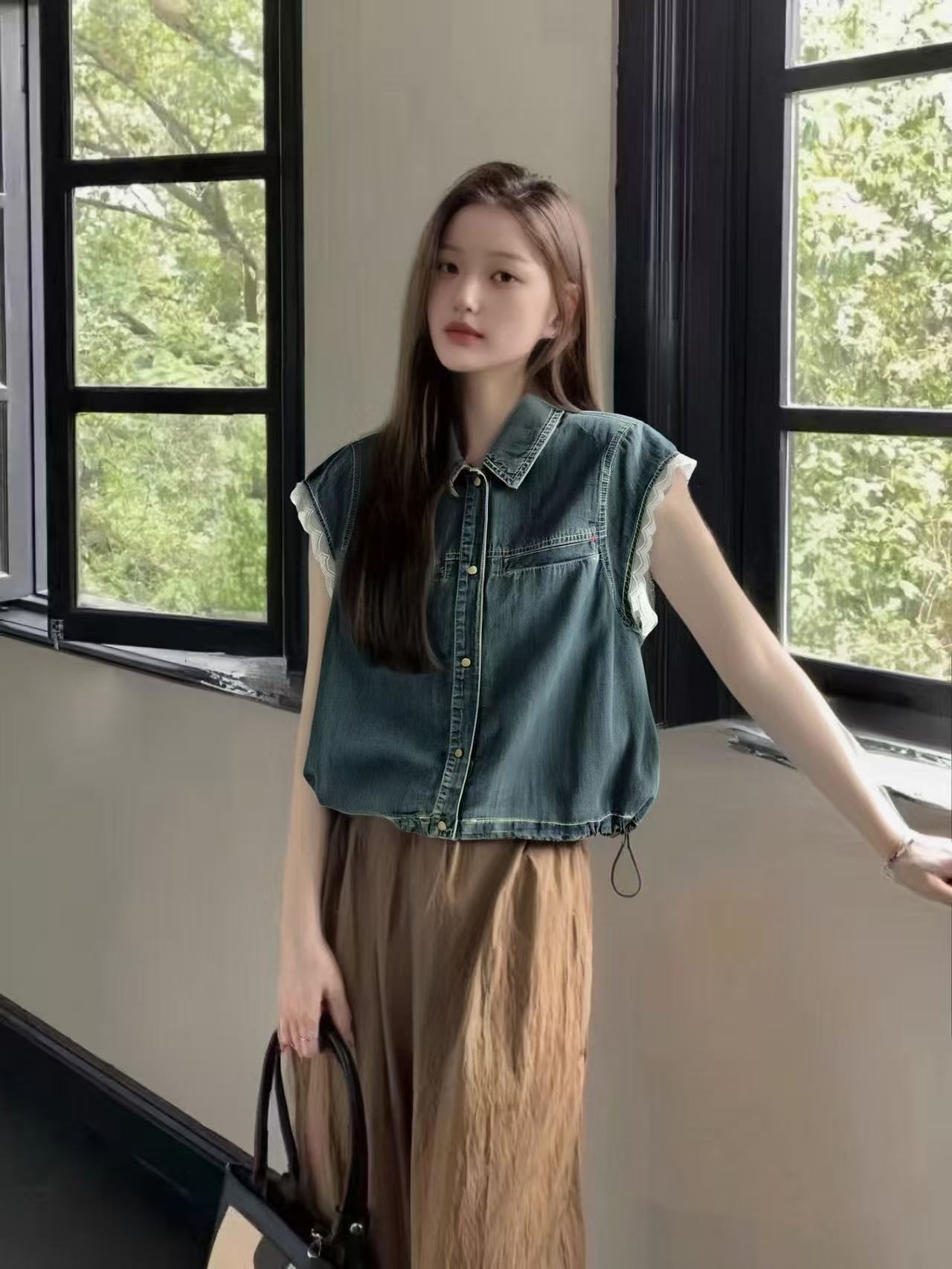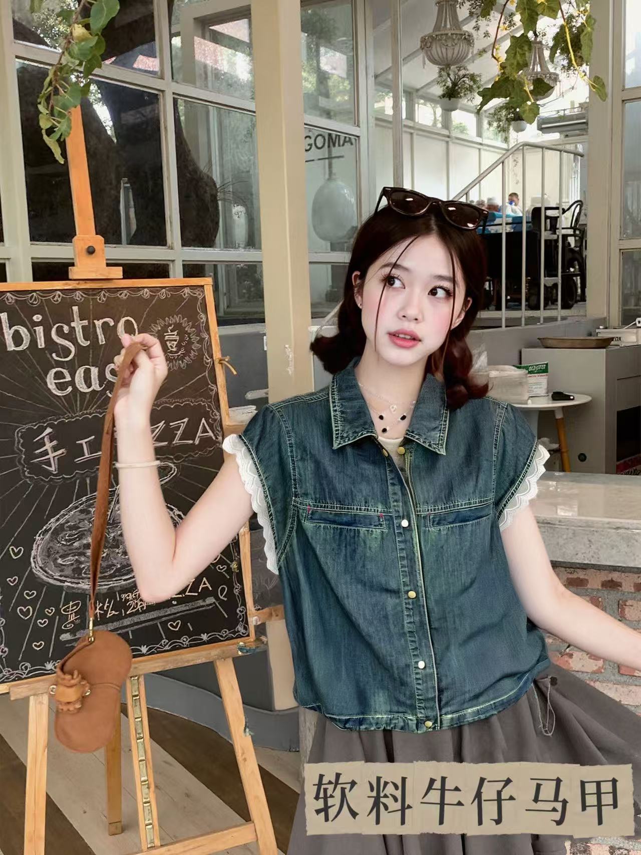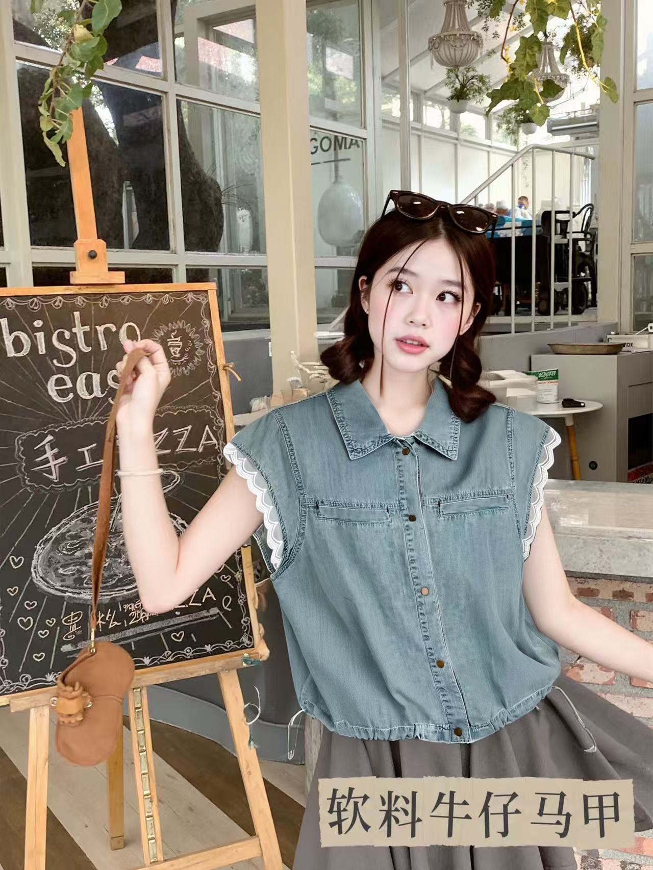 【时装系列】ME TOWN'S (三季可穿)E3199可抽绳100%棉翻领蕾丝袖软料牛仔马甲M1-2-喜出