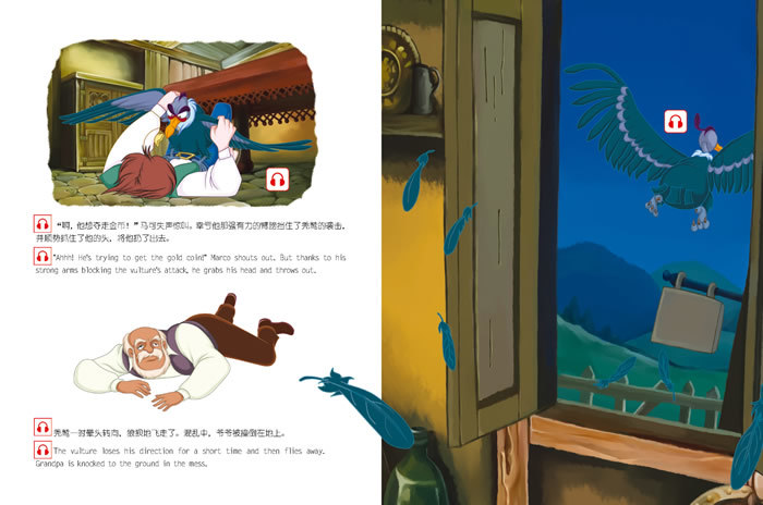 “啊,他想夺走金币!”马可失声惊叫。幸亏他那强有力的臂膀挡住了秃鹫的袭击,并顺势抓住了他的头,将他扔了出去。