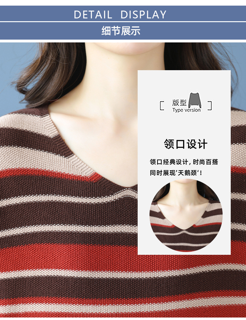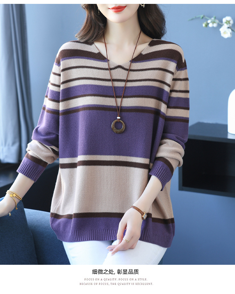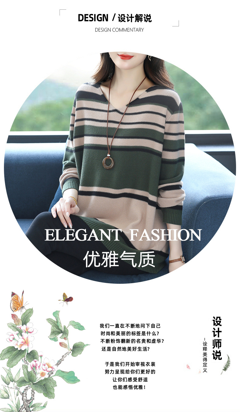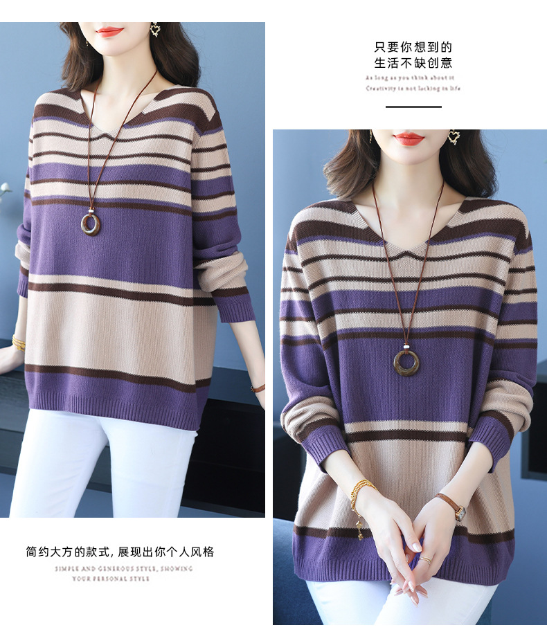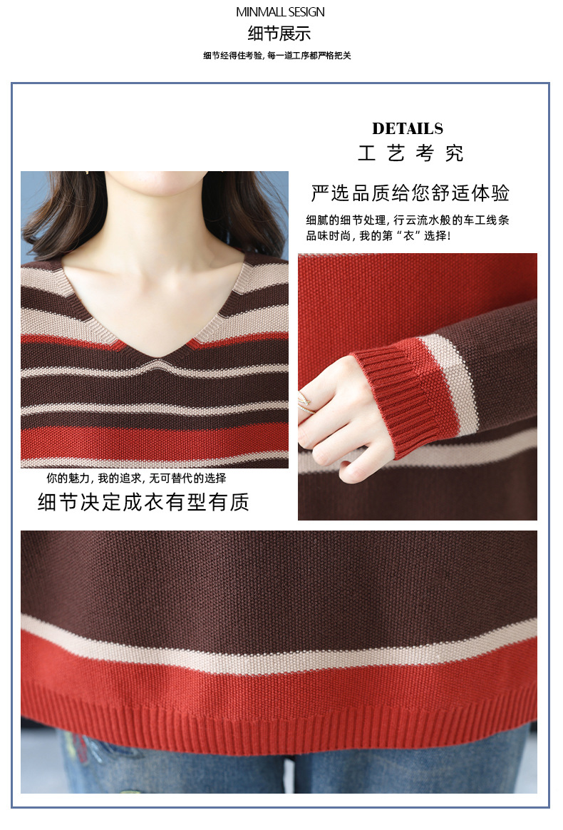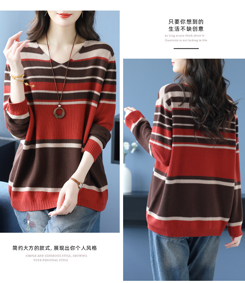 CC37-3126 大码洋气v领内搭针织打底衫女装早秋好看显瘦条纹长袖上衣女
