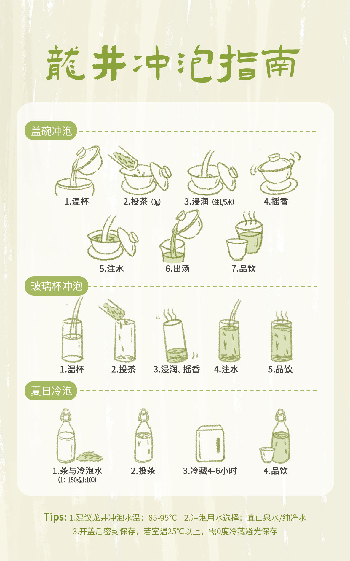 注:西湖龙井冷藏存放后拿出来再喝要先放到室内常温半小时左右,让茶叶恢复再进行冲泡。