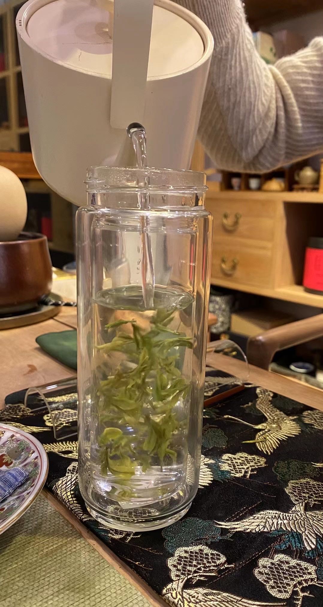 西湖龙井色绿、形美,欣赏这种形之美也是品饮西湖龙井的一部分,从这点来说,透明的玻璃杯是最合适的。透过透明的杯子,可以看到水和茶相遇后的翩翩舞姿。一边品茶,一边欣赏茶在水中的舞姿,非常惬意。不足之处在于茶水不能分离,茶叶一直浸泡在水中,泡久了以后茶汤难免就浓了。