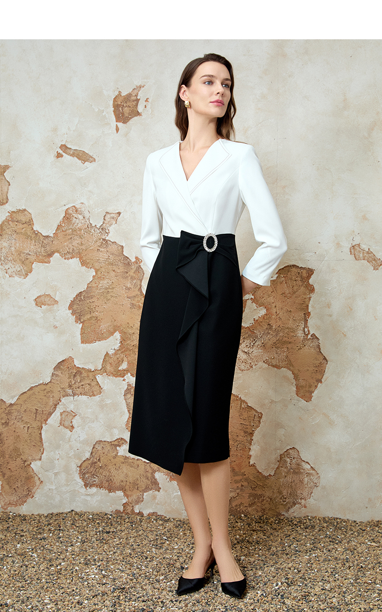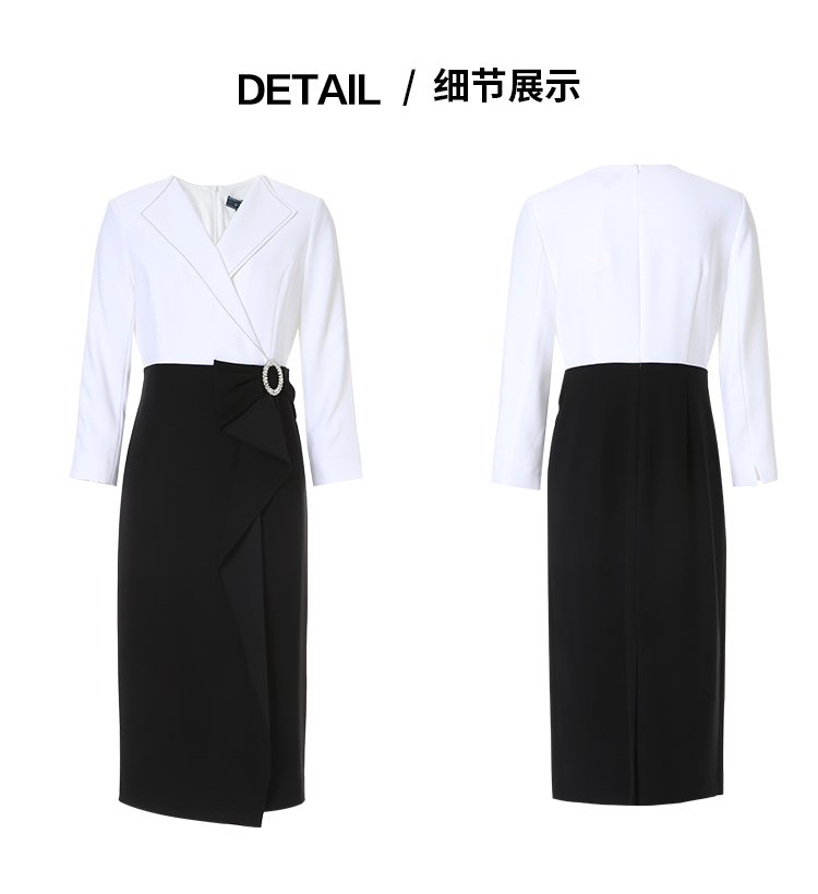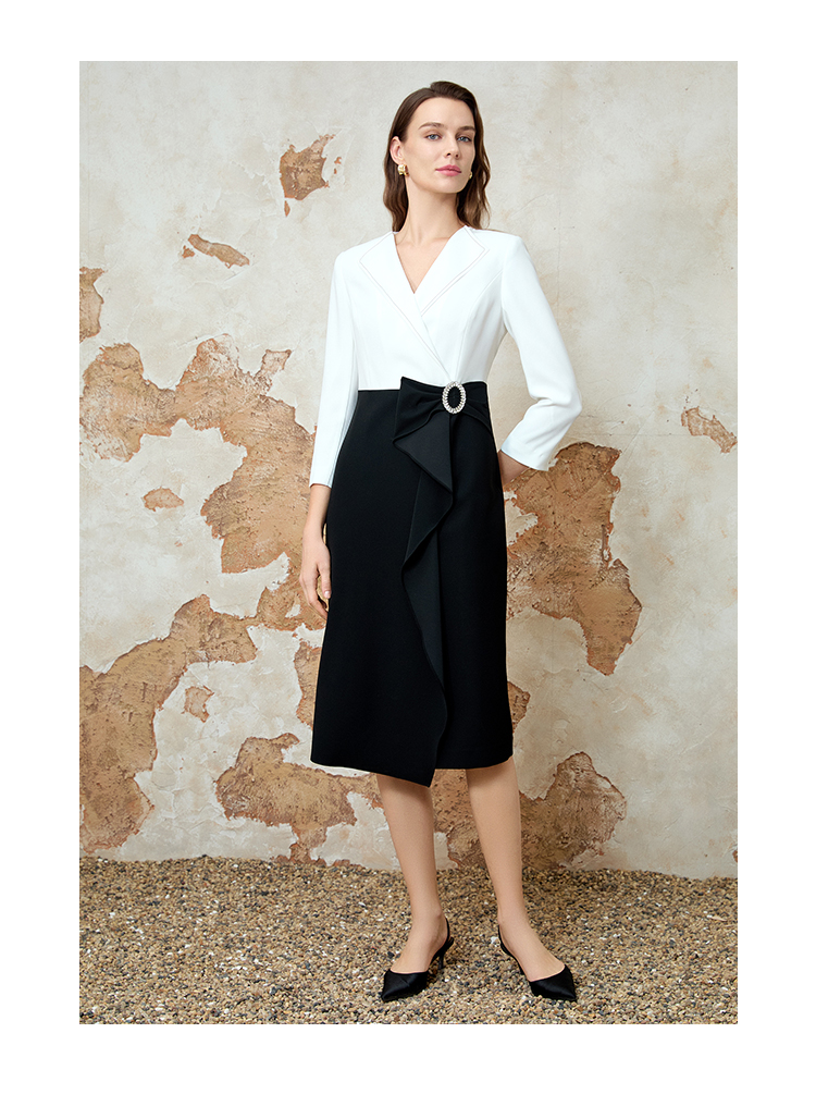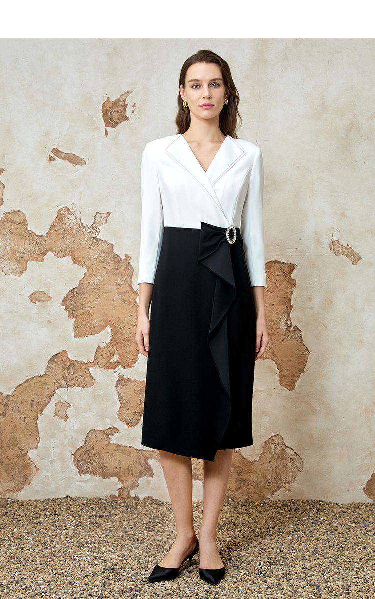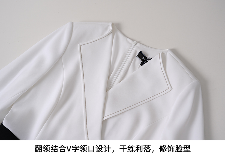 EITIE爱特爱春新款优雅翻领高腰显瘦撞色a字连衣裙礼服8177806