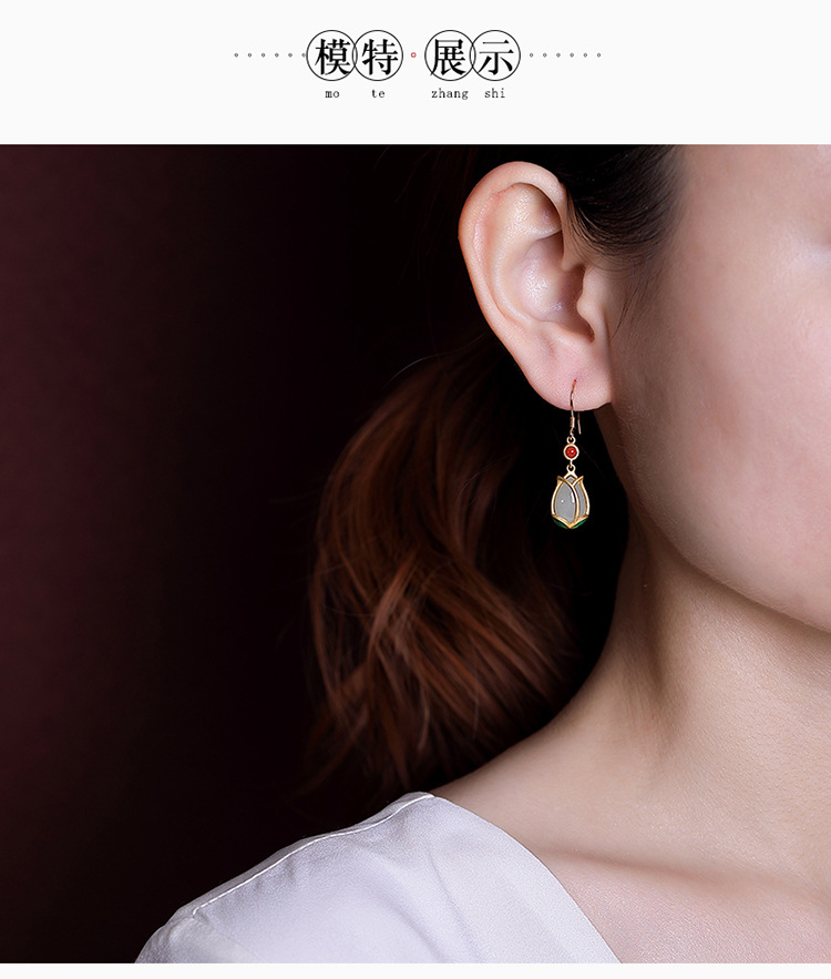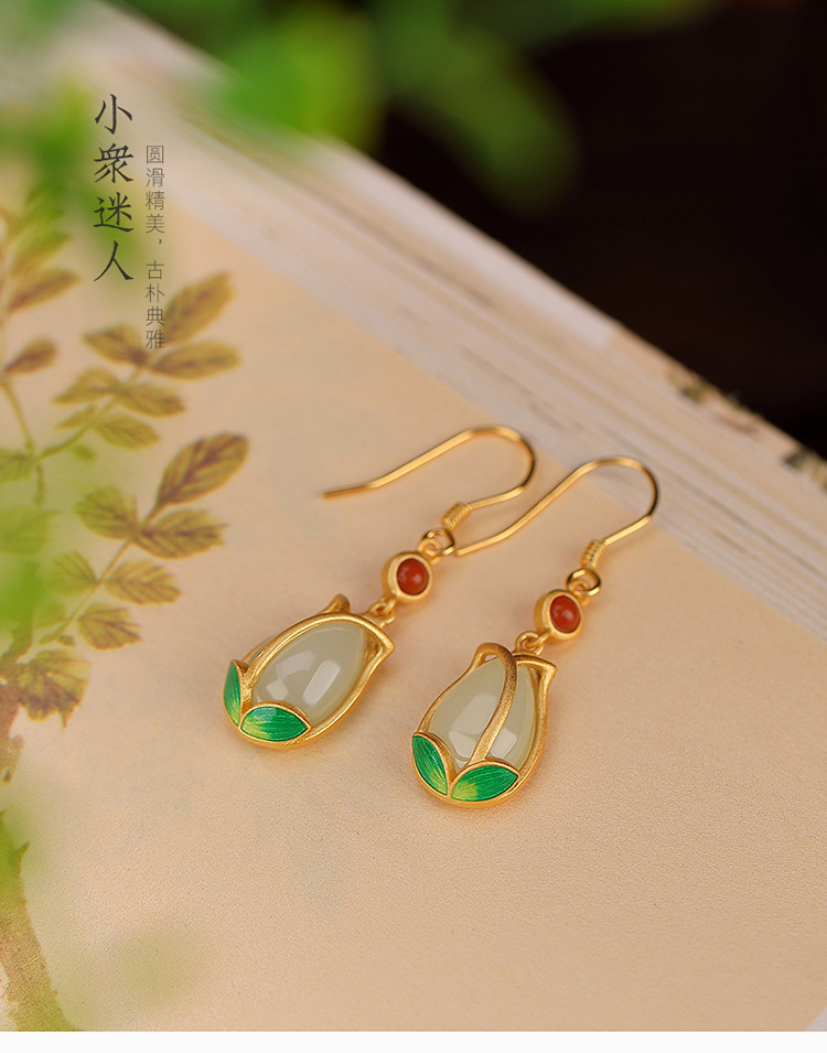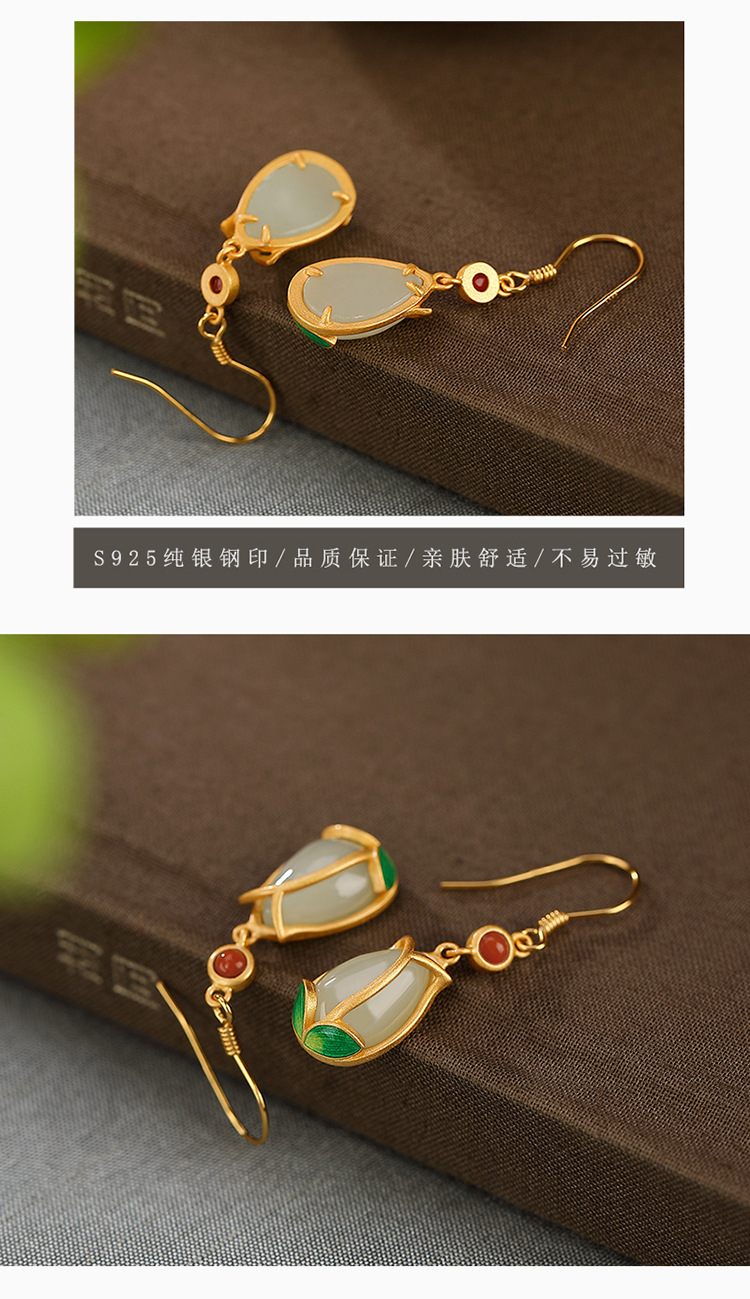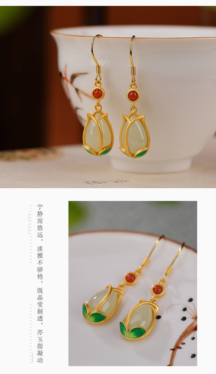 S925纯银镀金,景泰蓝和田玉耳环复古个性郁金香气质耳坠CW-137