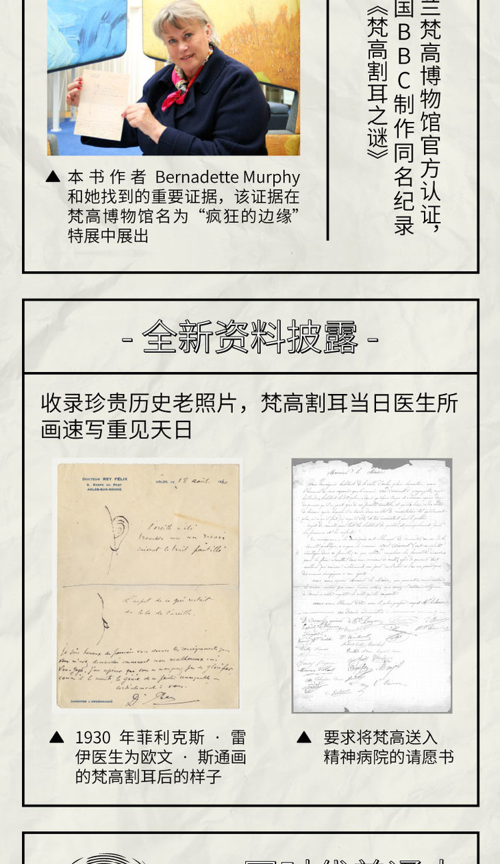 5. 收录珍贵历史老照片,包括梵高割耳当日收治他的医师所画梵高耳朵速写、梵高之家“黄房子”被炸毁之前的样子、阿尔勒市民要求送梵高去精神病院的请愿书等。