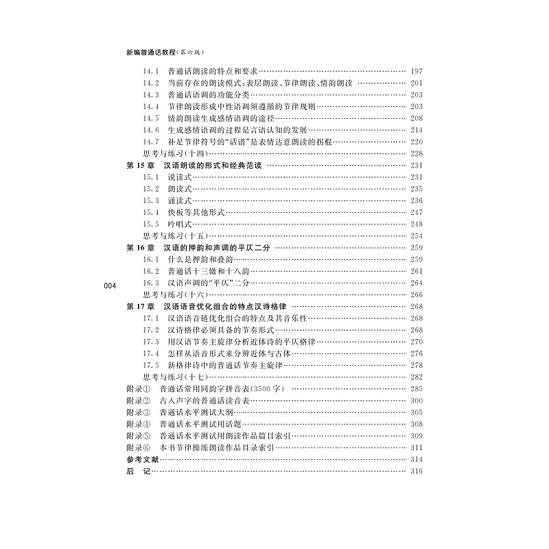 本书是十二五修订教材。全书共16章,包括绪论,语音概论,普通话的单韵母和声调,普通话声母和声母辨证,普通话开口呼复韵母和鼻韵母,普通话齐齿呼韵母及其辨证,合口呼、撮口呼和特别韵母及拼写规则,音变,普通话的停延,普通话的重音,普通话的句调和句调群组合规律,普通话的节奏,汉语的基调,从节律朗读到情韵母的朗读和名家经典朗读,汉语的押韵和声调的平仄二分,汉语语音的组合特点和汉诗格律。吸收了语音研究的zuixin成果,注重教材的科学性,系统性,实用性和趣味性。适合中文,旅游,法律,文秘,教育,广播,外语,管理等专业学生使用。