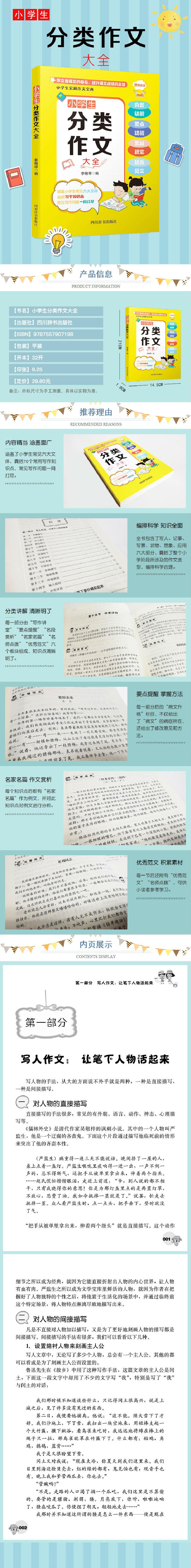《小学生分类作文大全》包含了写人、记事、写景、状物、想象、应用六大部分,囊括了整个小学阶段所涉及的作文类型。写人作文,主要从描写方法进行讲解,如人物描写、侧面描写、环境描写,分类合理,逻辑清晰;记事作文从叙事方法入手,如叙事顺序、叙事线索,讲解通俗,例文有代表性;写景作文中提出了“景物有特征”“写景有顺序”“写景有主次”等写作手法;状物作文,用动静结合的方法展开全章,使读者便于理解与掌握,如“物体静态之美”“动静中显变化”;想象作文从修辞手法切入,列出“比喻的形象化”“拟人的人格化”等方法;应用作文例举了小学阶段有的应用文体,如日记、书信、读后感,详细地讲解了每一种文体的含义、内容、以及写作方法。每一部分由“写作讲堂”“要点提醒”“名段赏析”“名家名篇”“名师点拨”“优秀范文”六个板块组成;每一部分后都设了“病文升格”栏目,肯定病文的优点,指出缺点以及给出改正意见,并附有改后的文章。