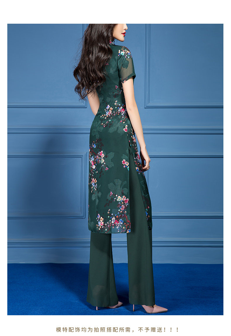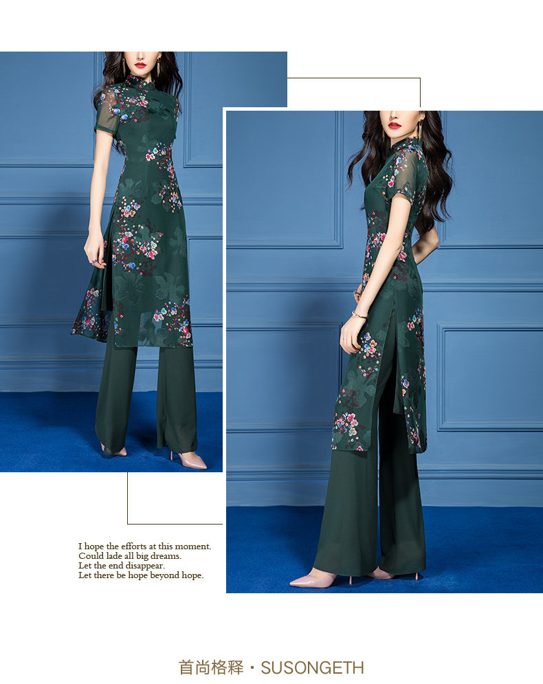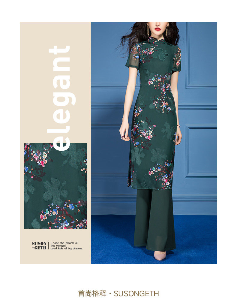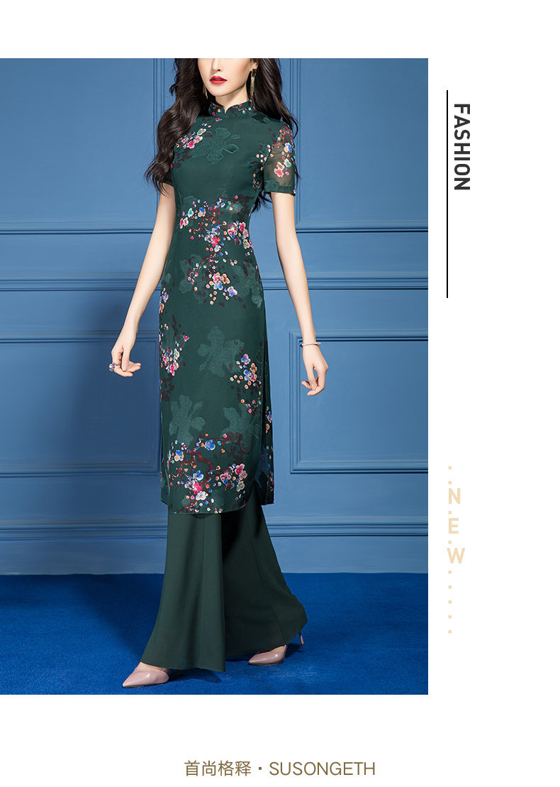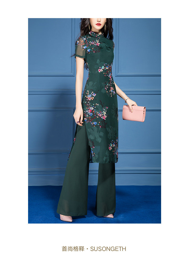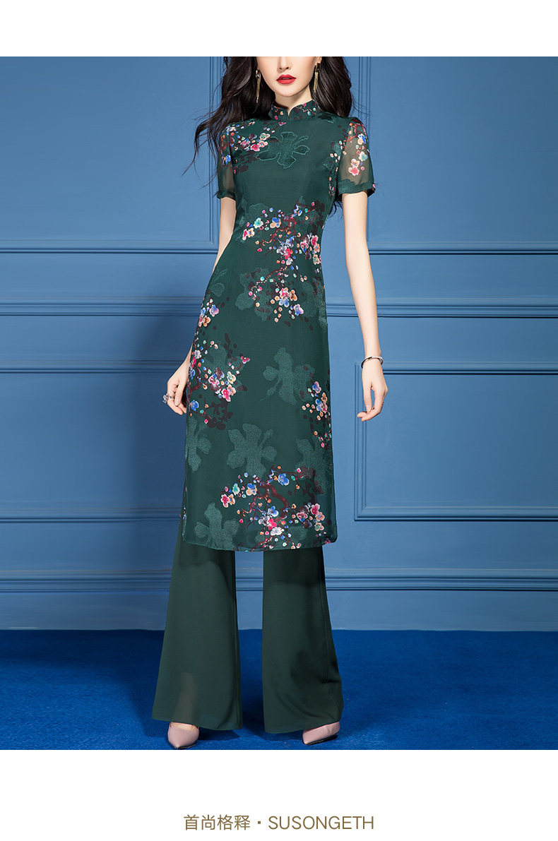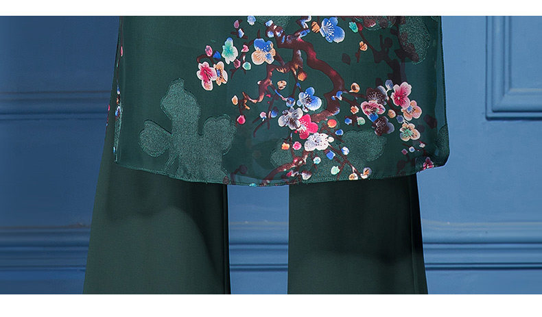 SSGS-T166新款典雅洋气绿色印花雪纺衫喇叭裤两件套
