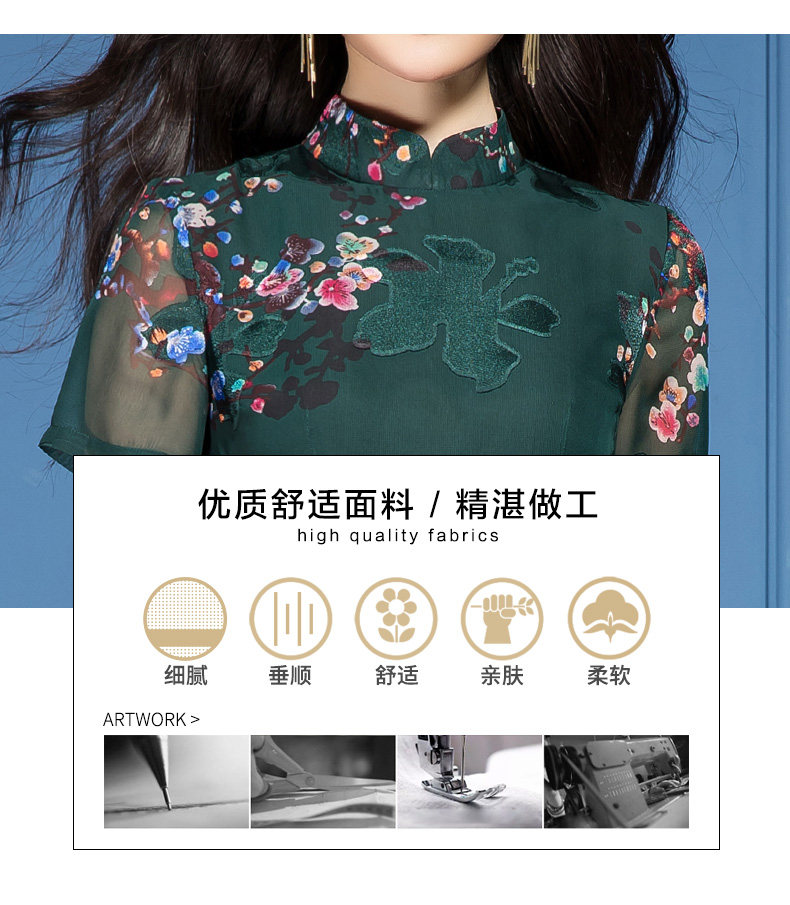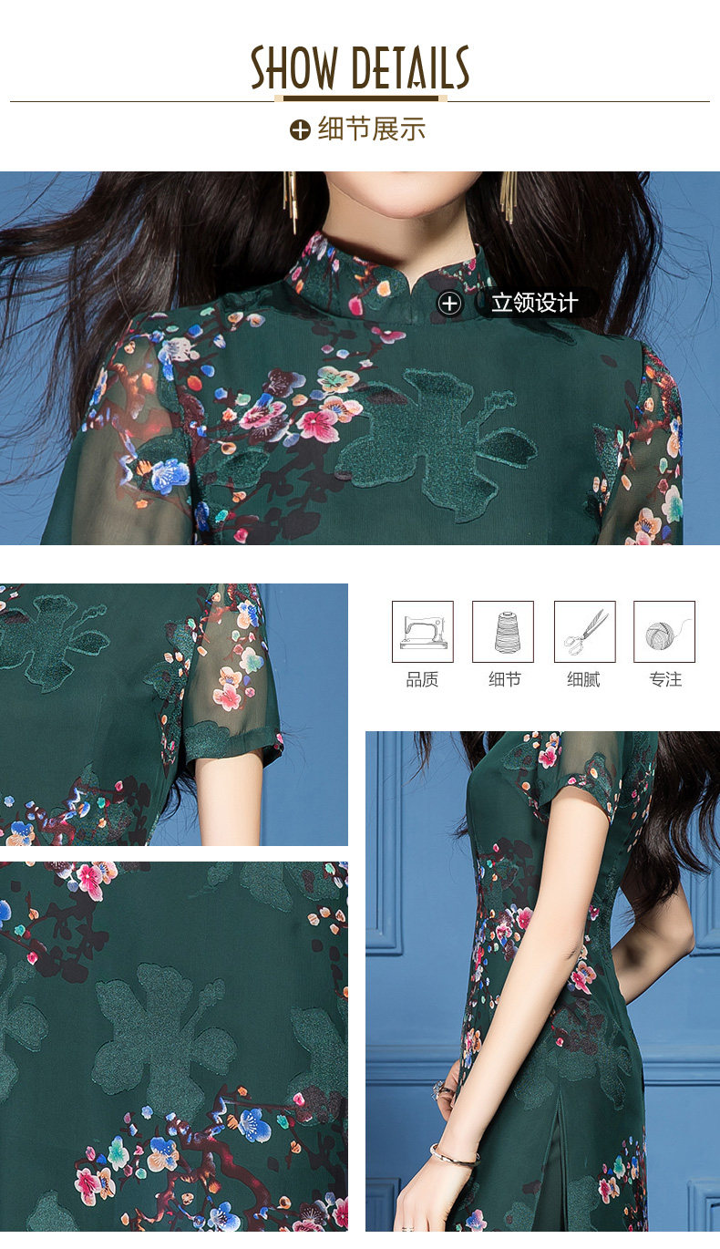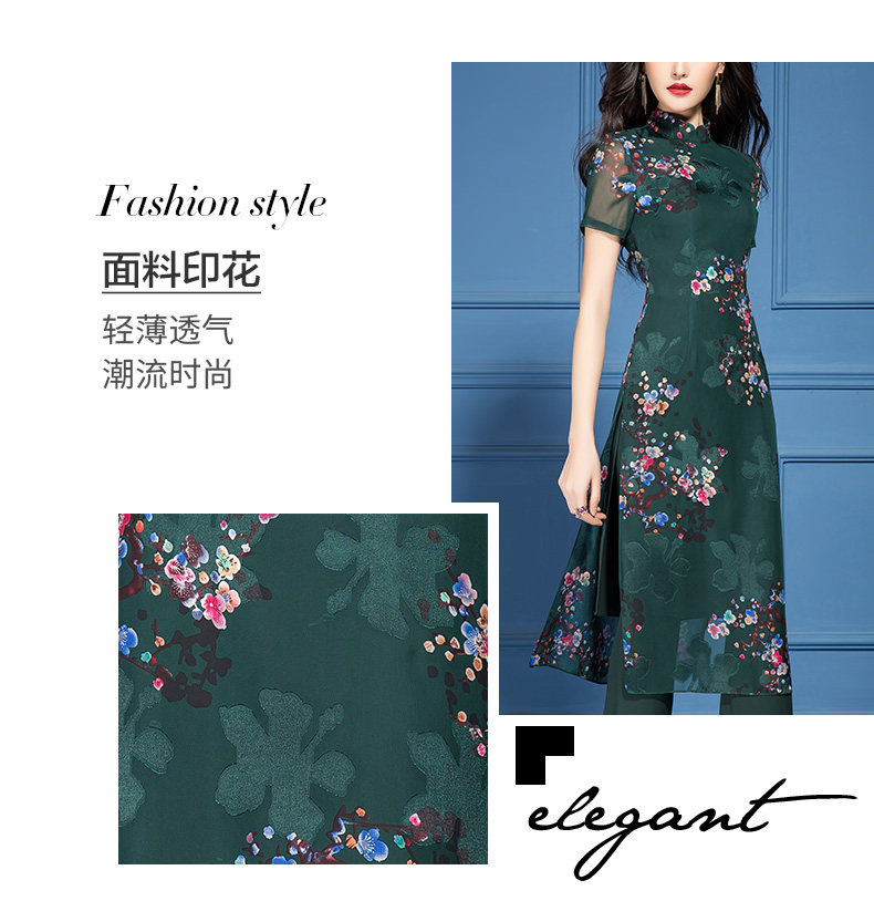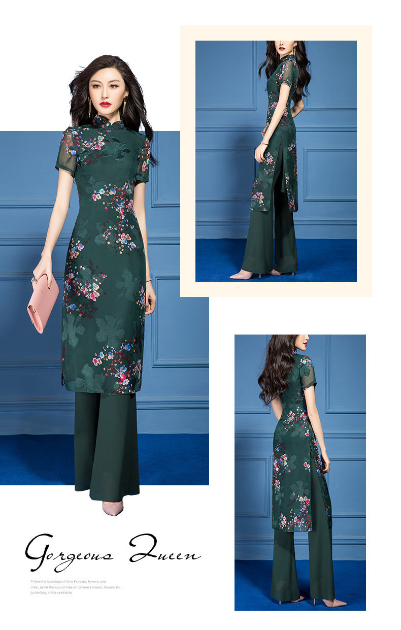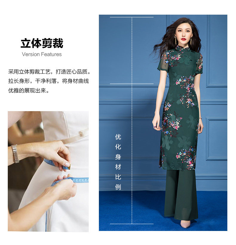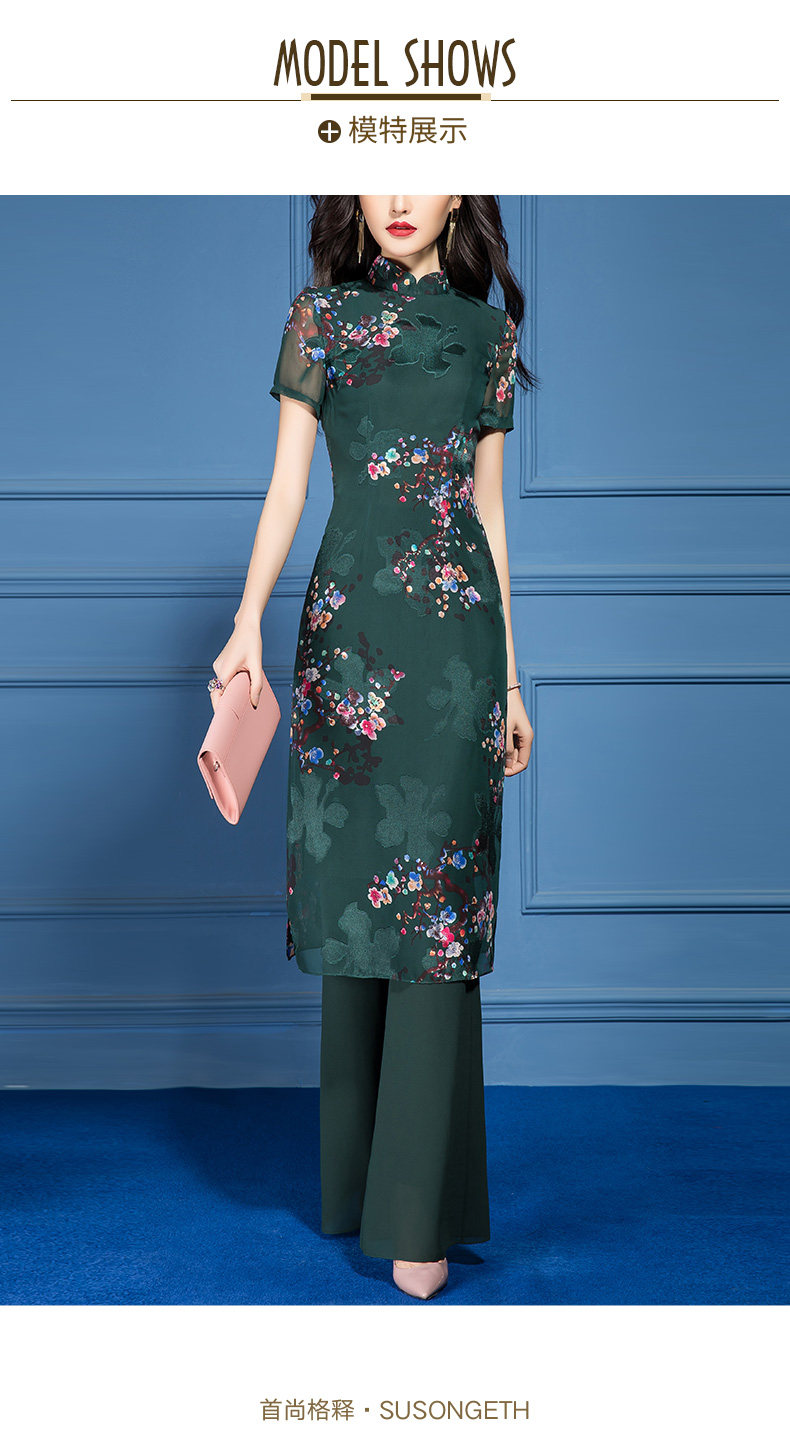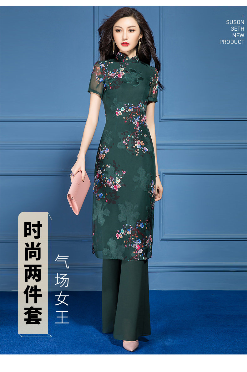 SSGS-T166新款典雅洋气绿色印花雪纺衫喇叭裤两件套