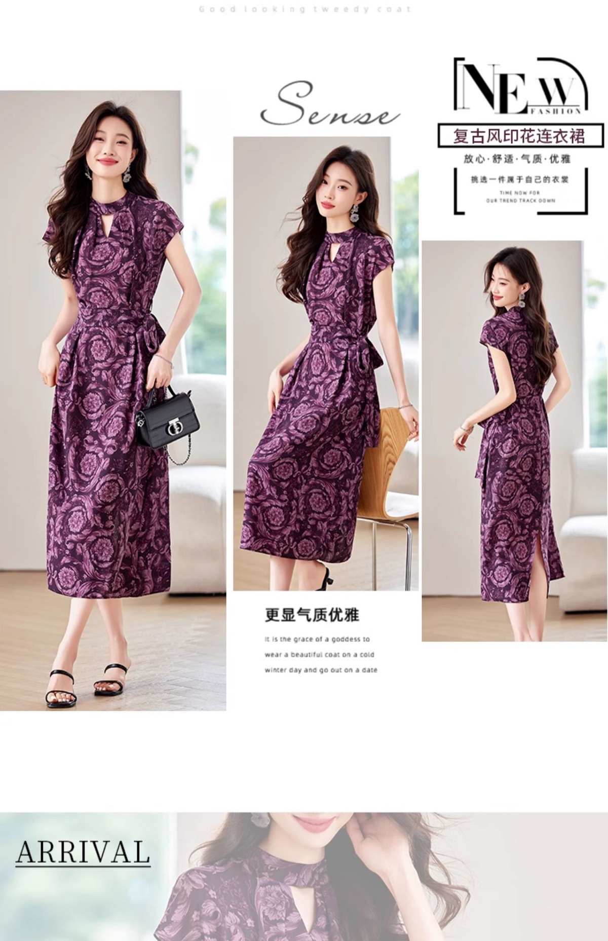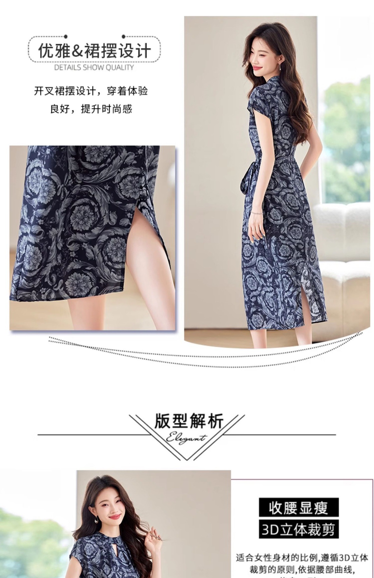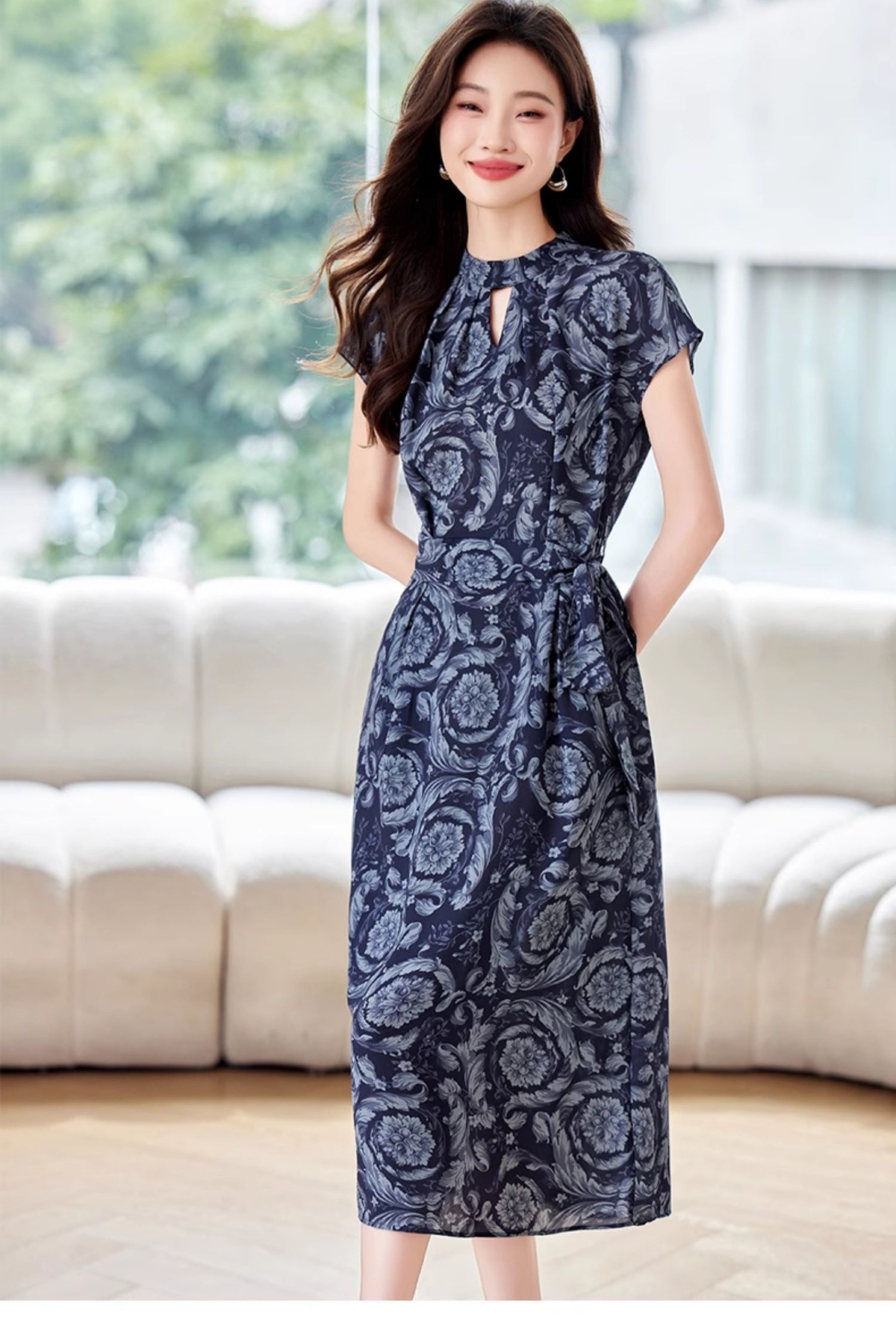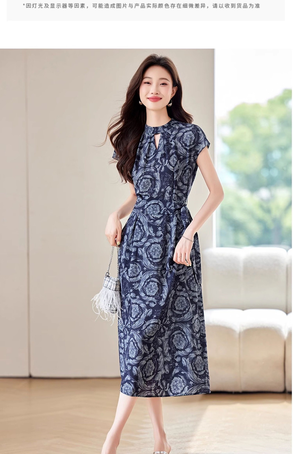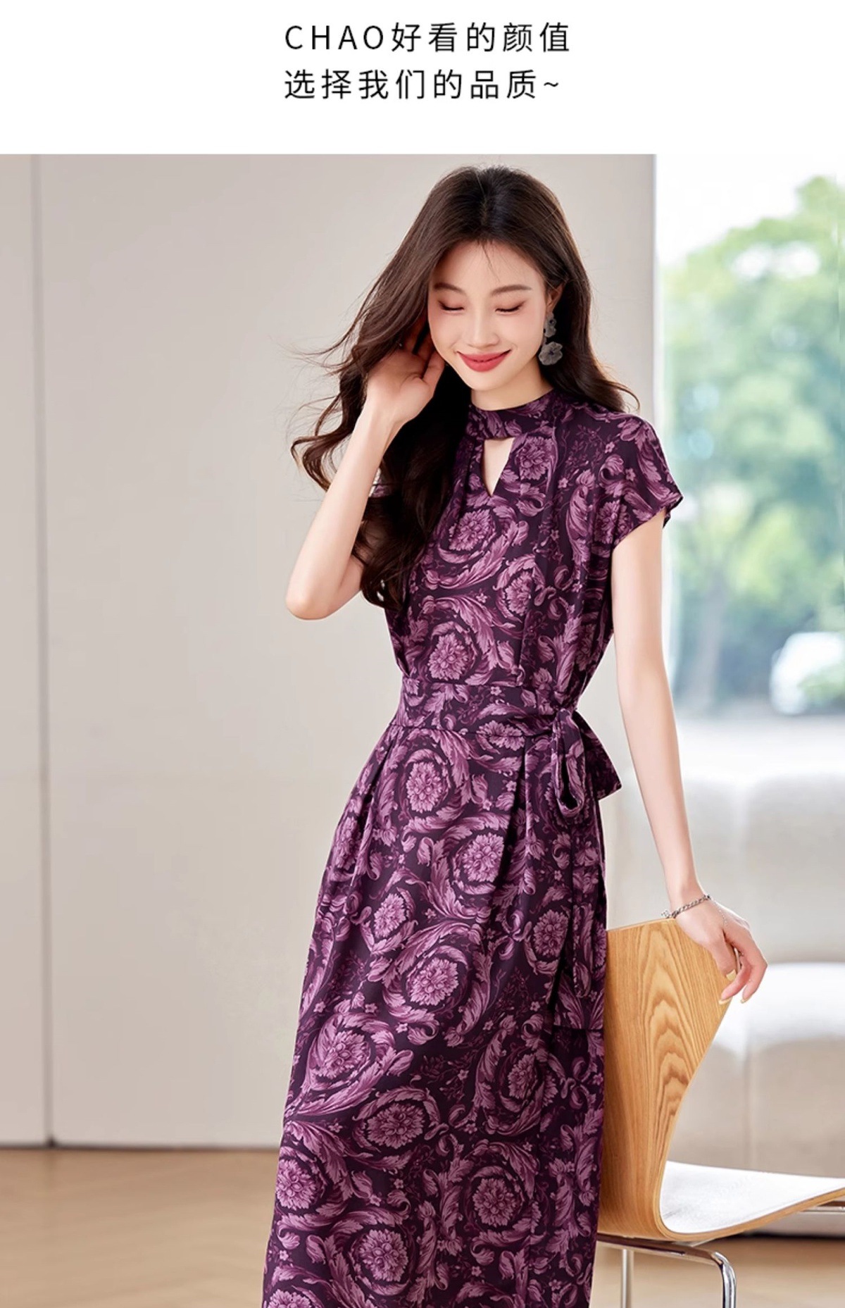 气质碎花连衣裙,翻领收腰显瘦妈妈印花裙子HR-LMYS8847A