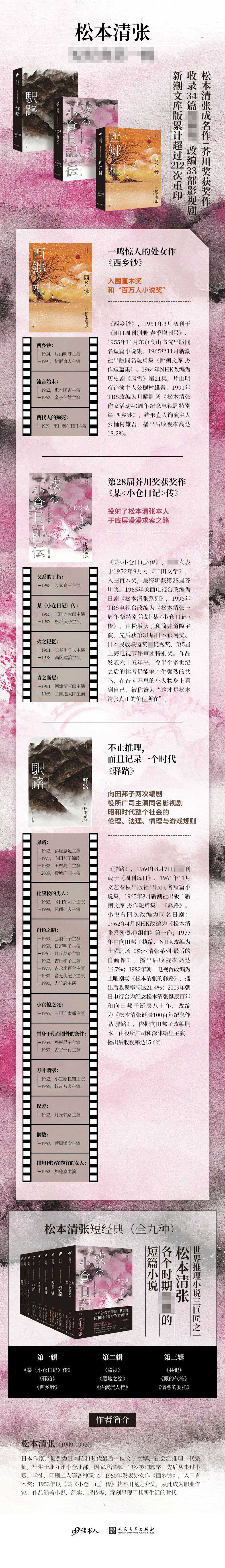 松本清张生于昭和前,死于昭和后。他八十三岁的生命,经历了昭和时代完整的六十三年,因此他的推理小说不止推理,而且记录了一个时代,生活于其中的人们的苦恼和矛盾、欲望与挣扎,都与整个社会的伦理、法理、情理、风气、游戏规则等,息息相关。