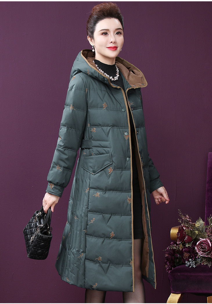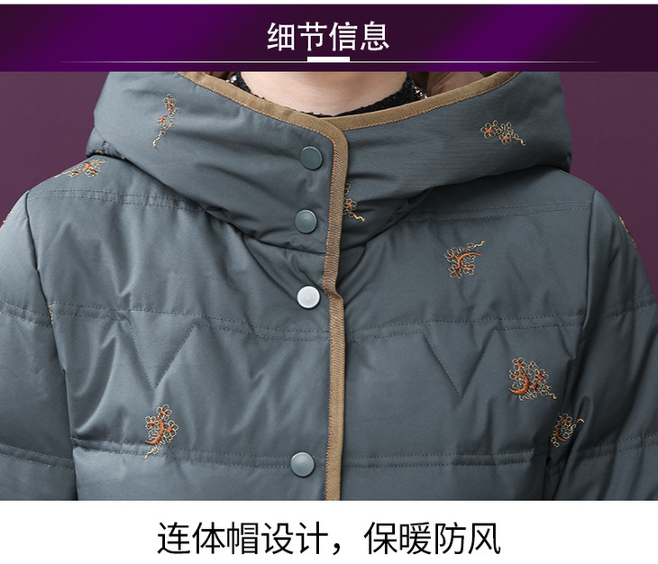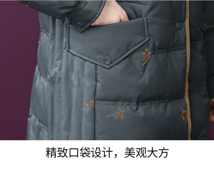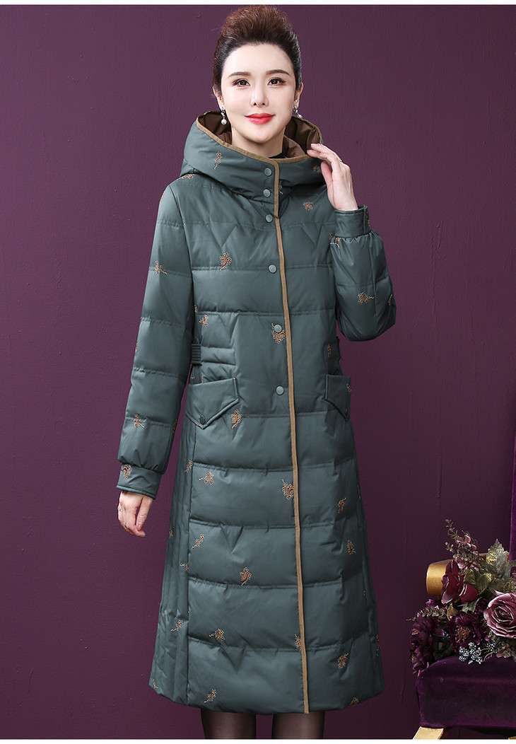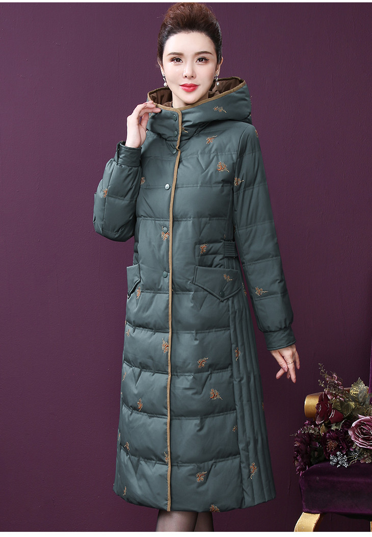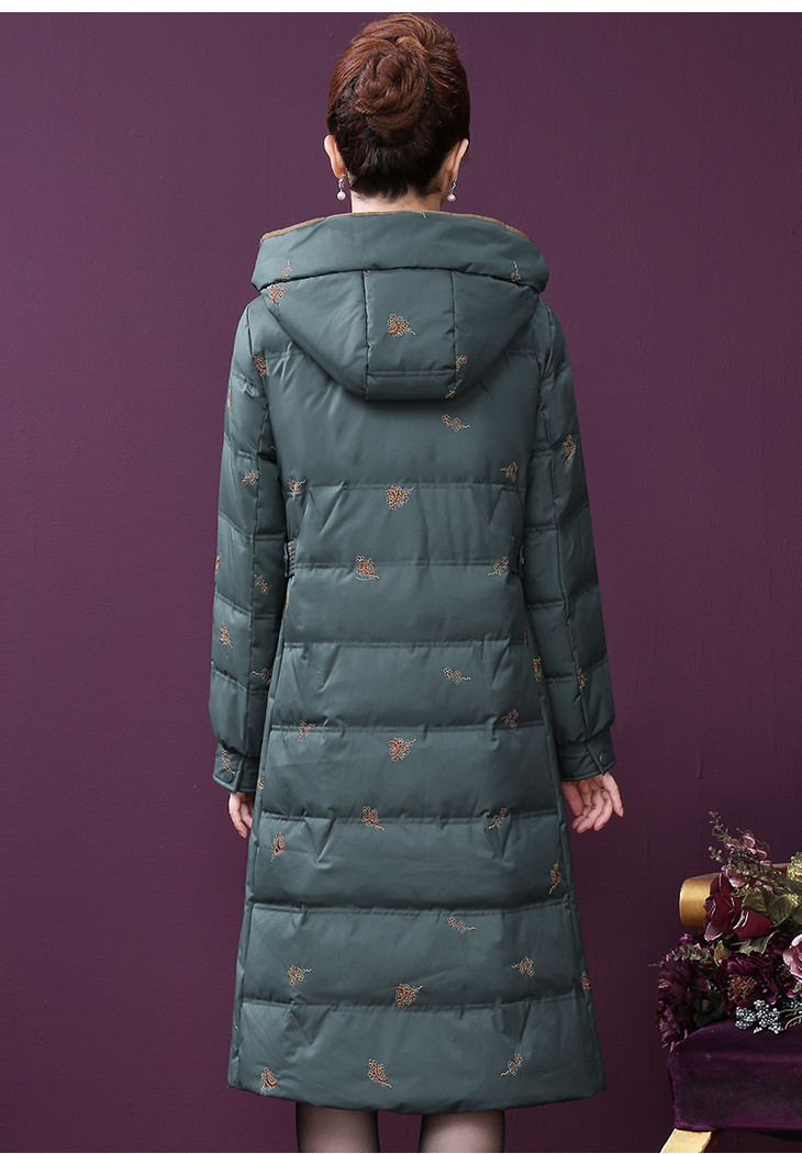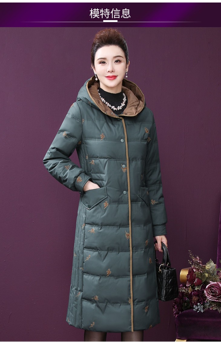 WXY-冬季羽绒服中长款外套女连帽白鹅绒高贵刺绣妈妈装