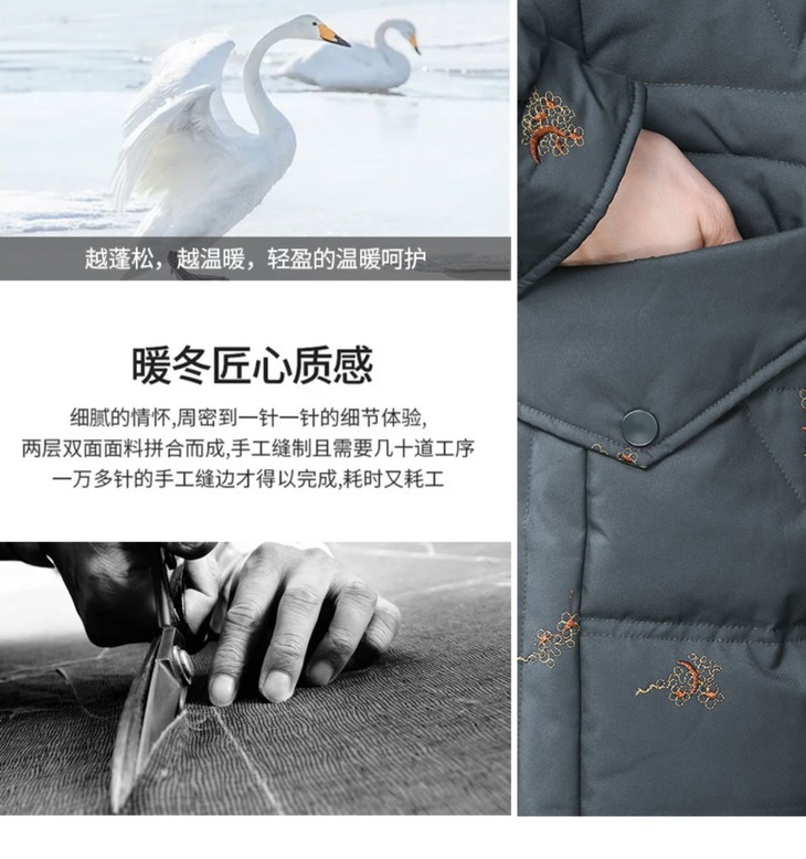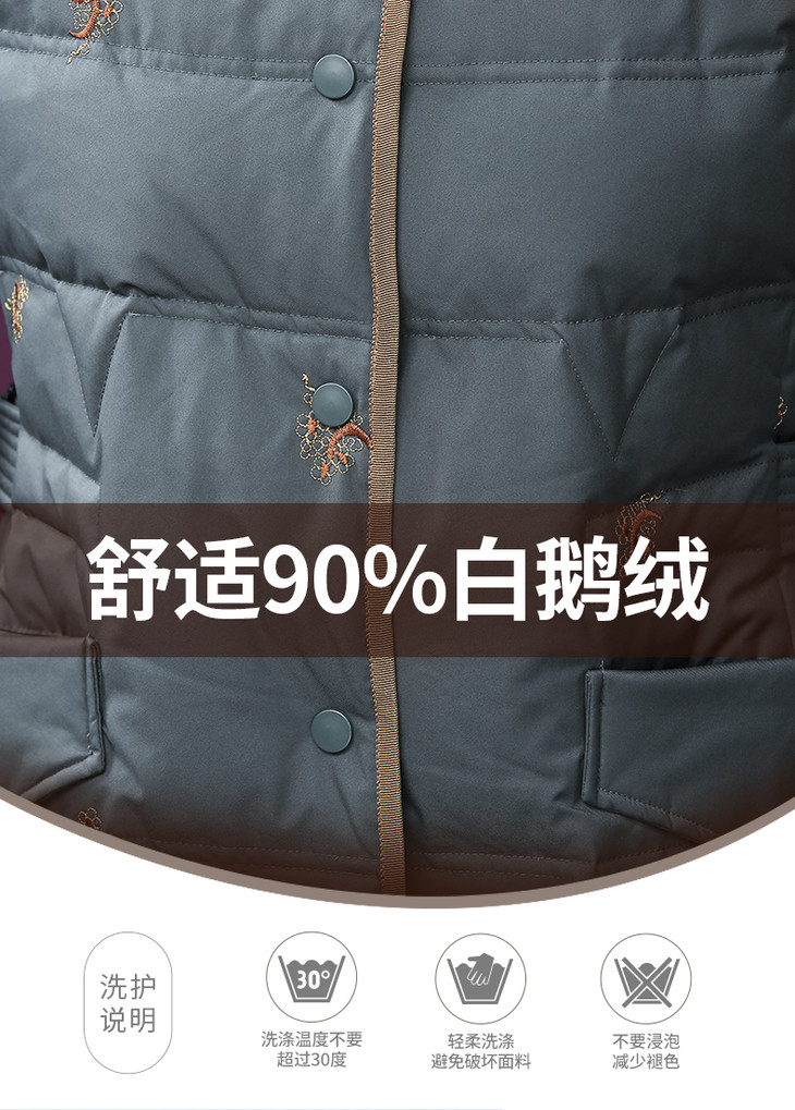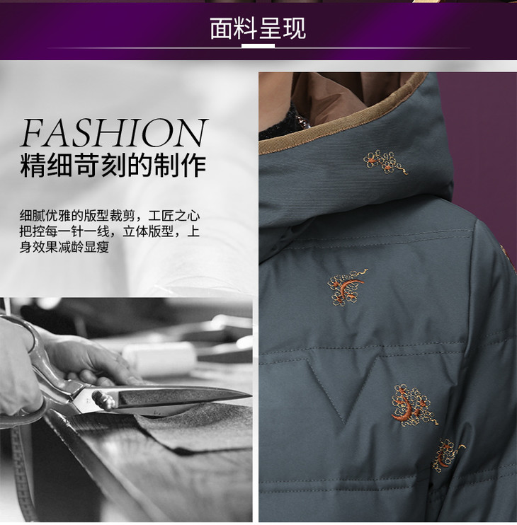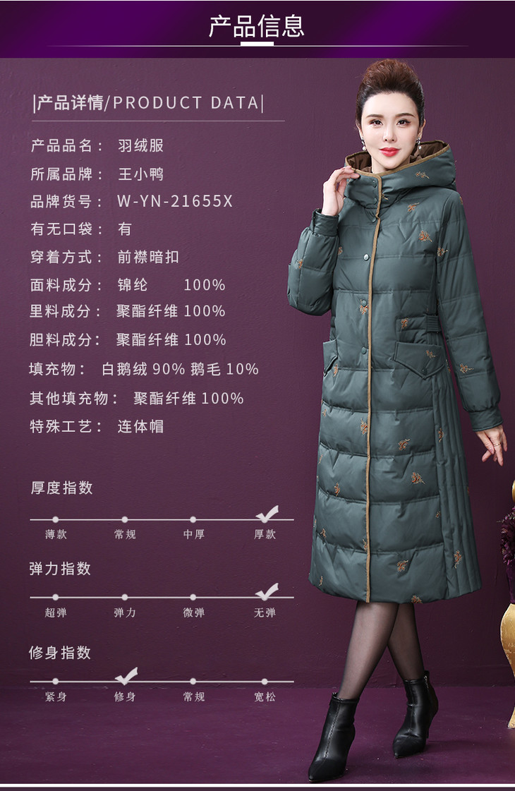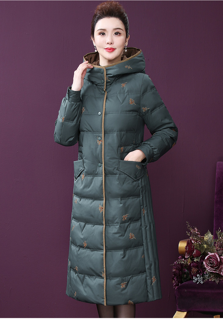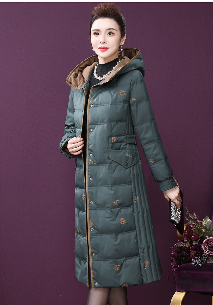 WXY-冬季羽绒服中长款外套女连帽白鹅绒高贵刺绣妈妈装