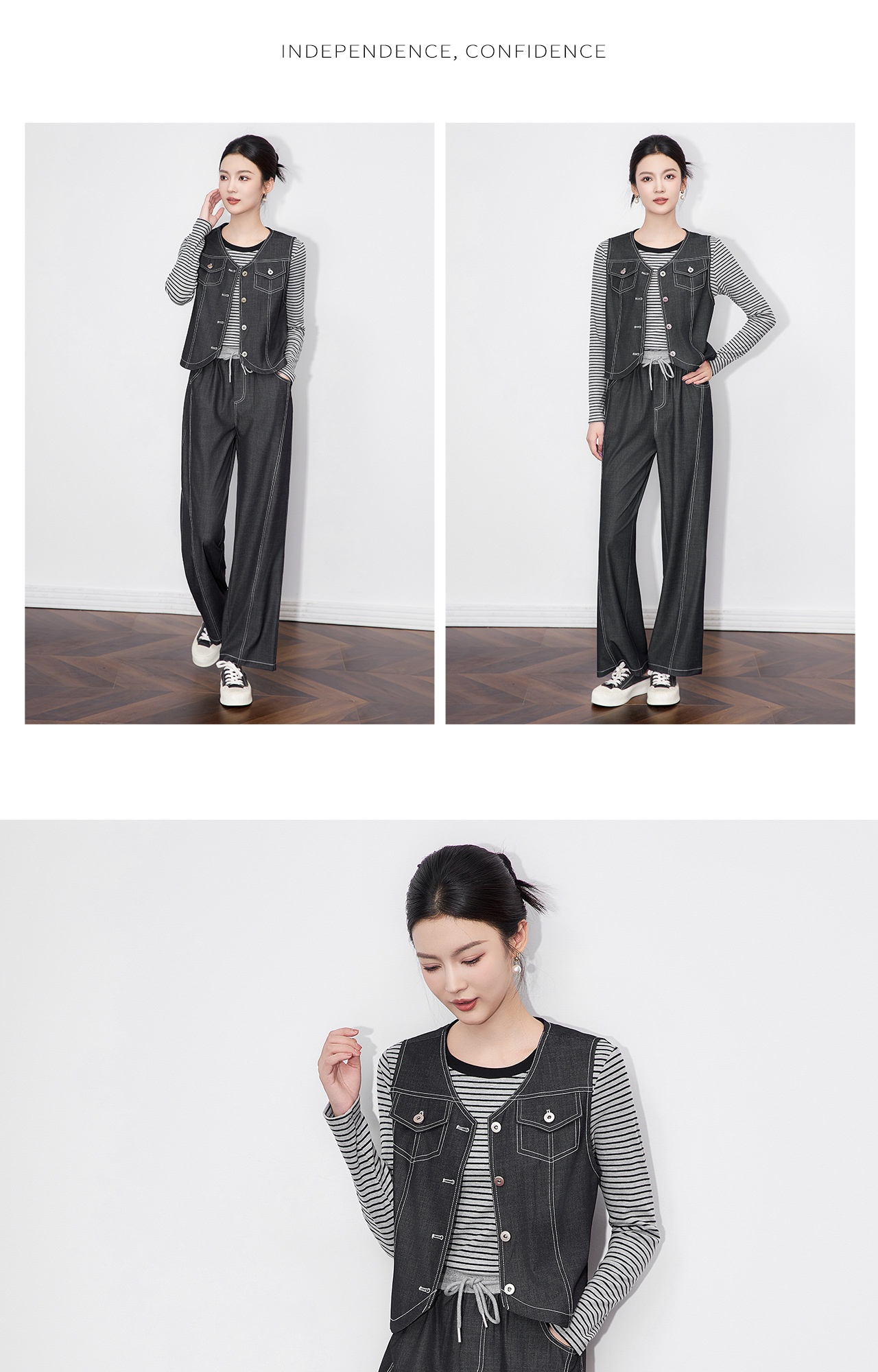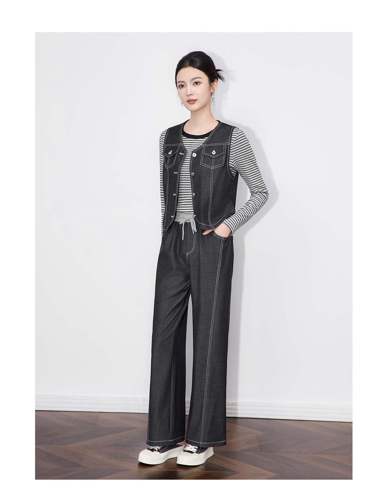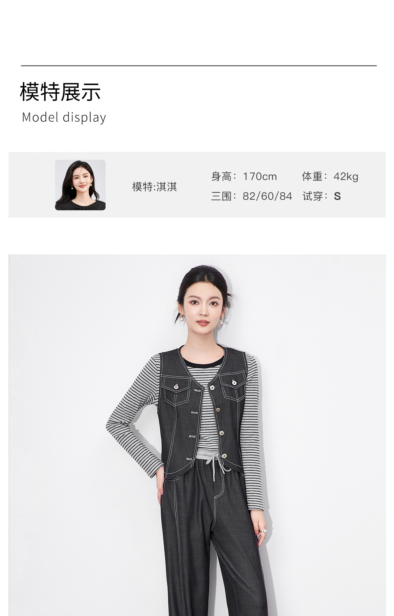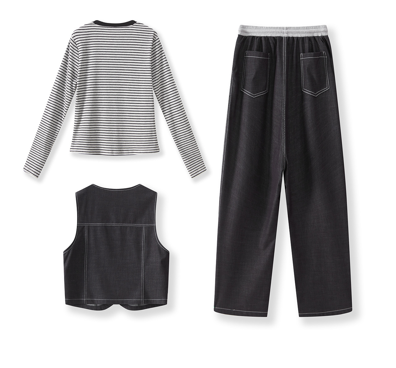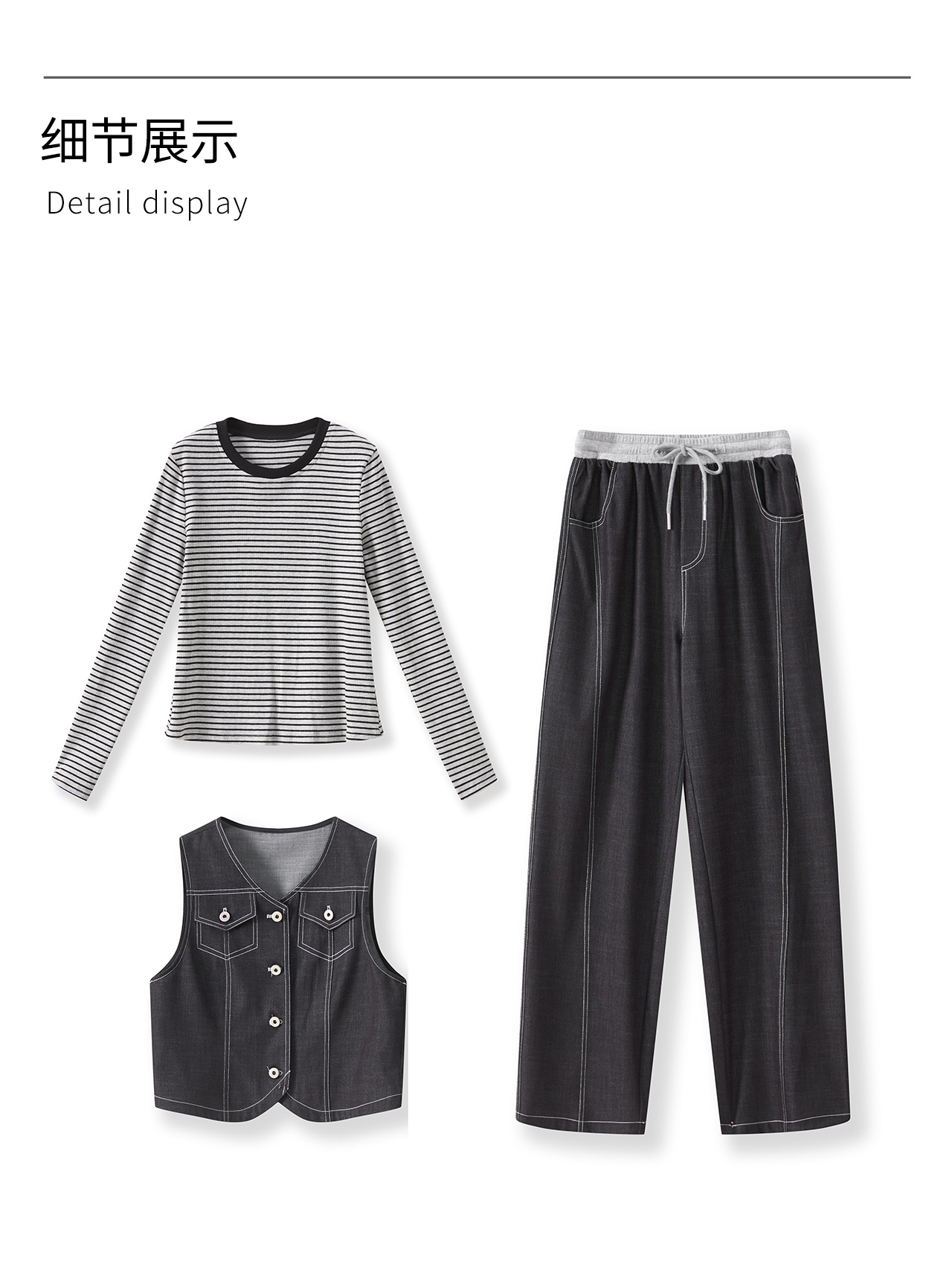 「高货wl」全新升级【铂金会员404/天猫549/差价145】(99828)洛诗琳休闲时髦松弛牛仔马甲条纹长袖T恤阔腿长裤三件套