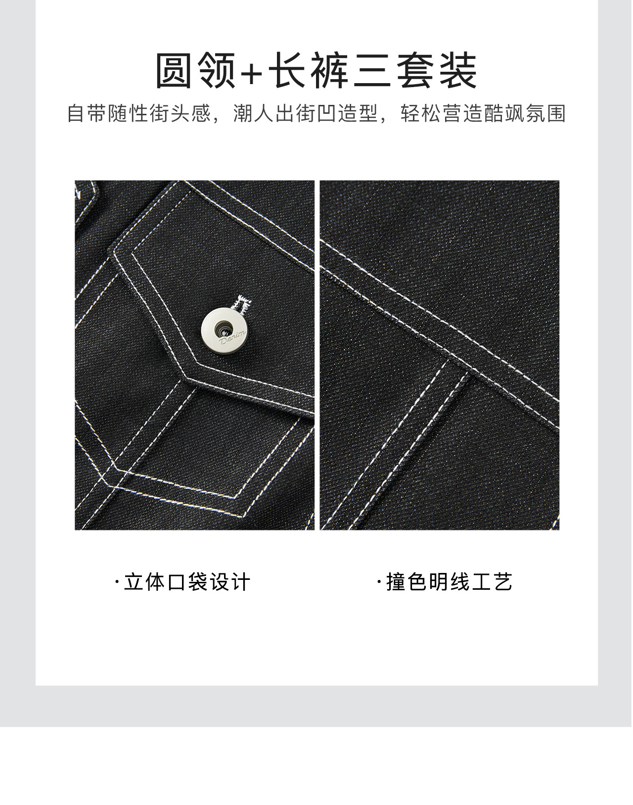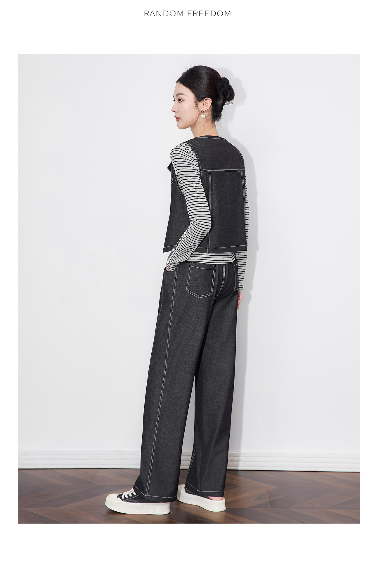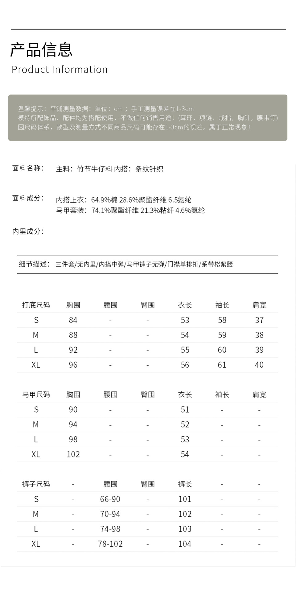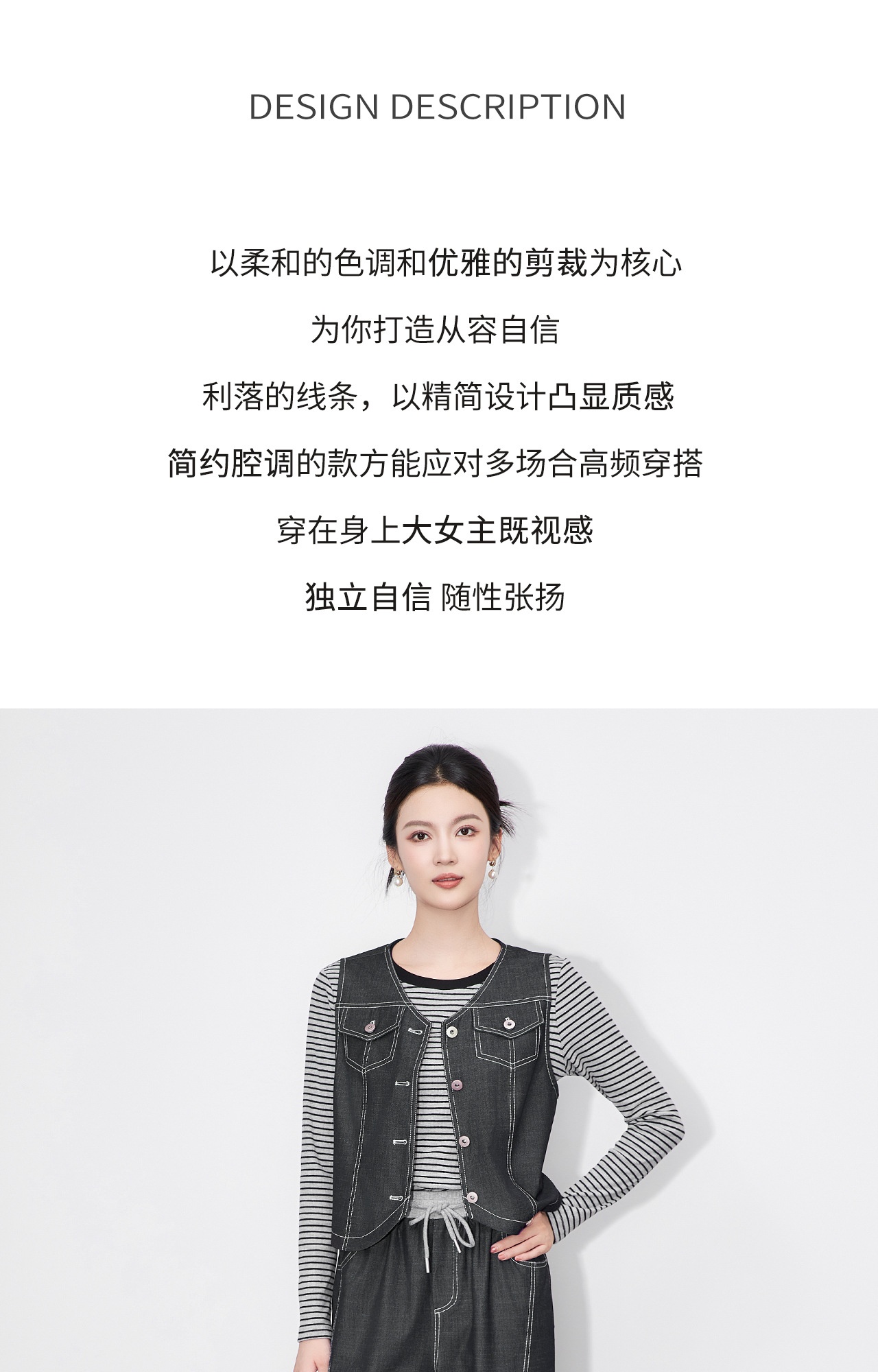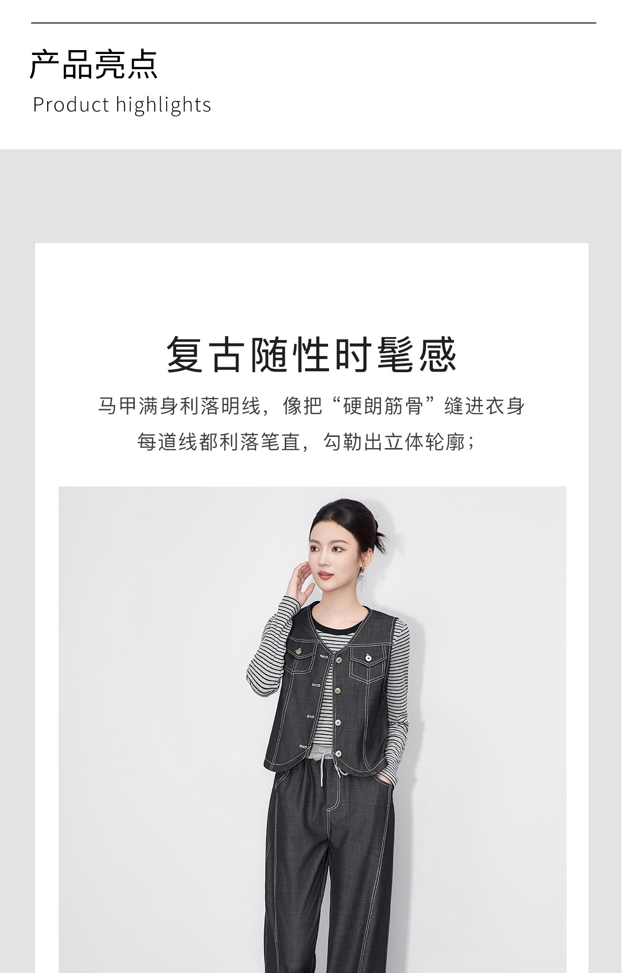 「高货wl」全新升级【铂金会员404/天猫549/差价145】(99828)洛诗琳休闲时髦松弛牛仔马甲条纹长袖T恤阔腿长裤三件套