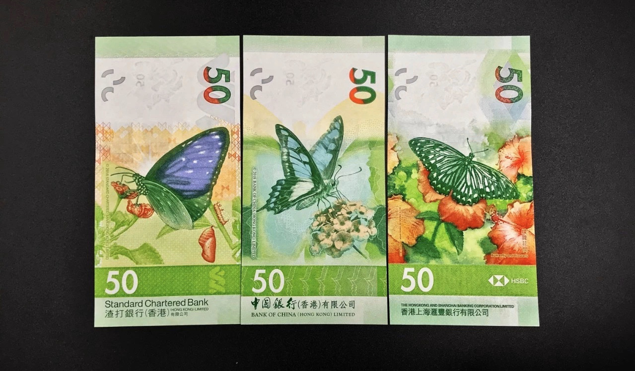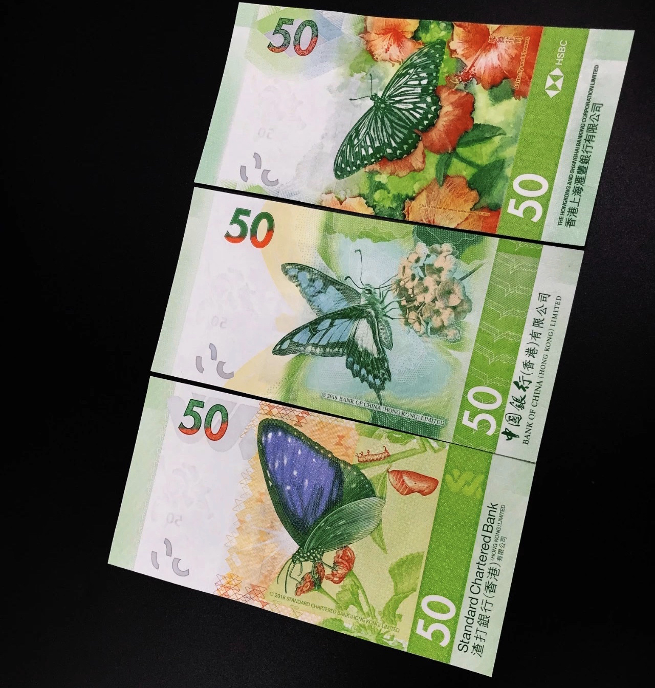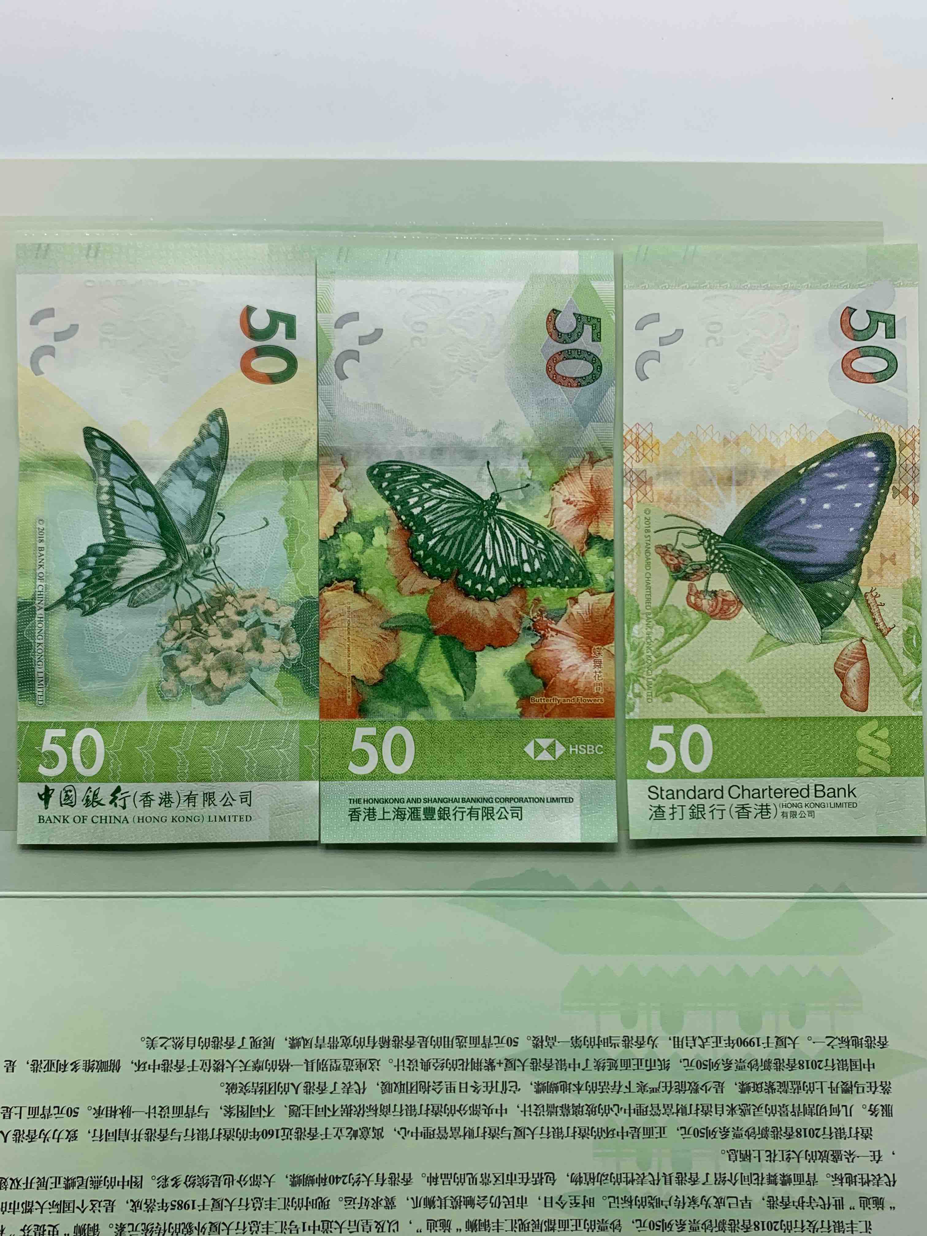 (中国银行(中银香港)、渣打银行、汇丰银行)新发行:中国银行(香港)新发行的50港币新钞、汇丰银行(香港)新发行的50港币新钞、渣打银行(香港)新发行50港币新钞,共计三张新钞。
