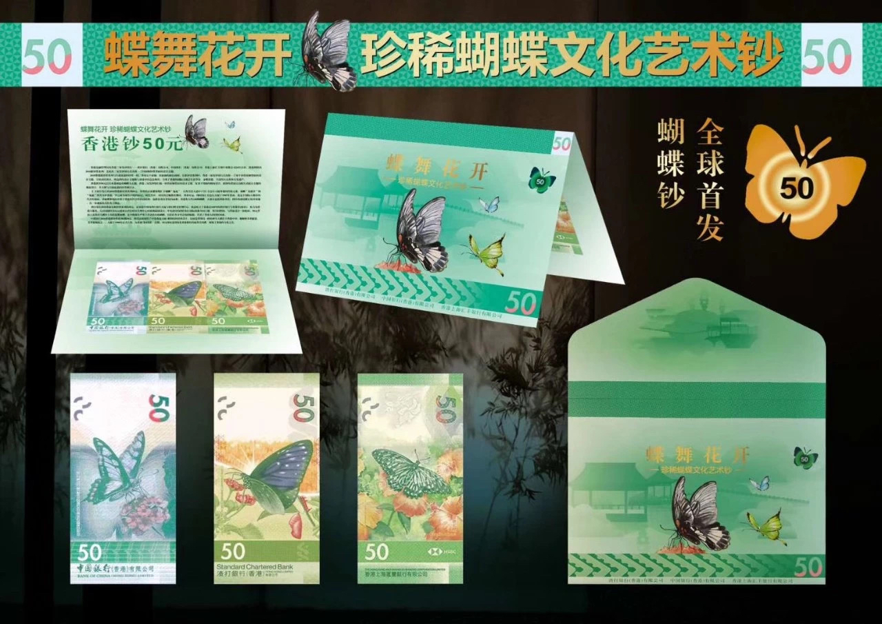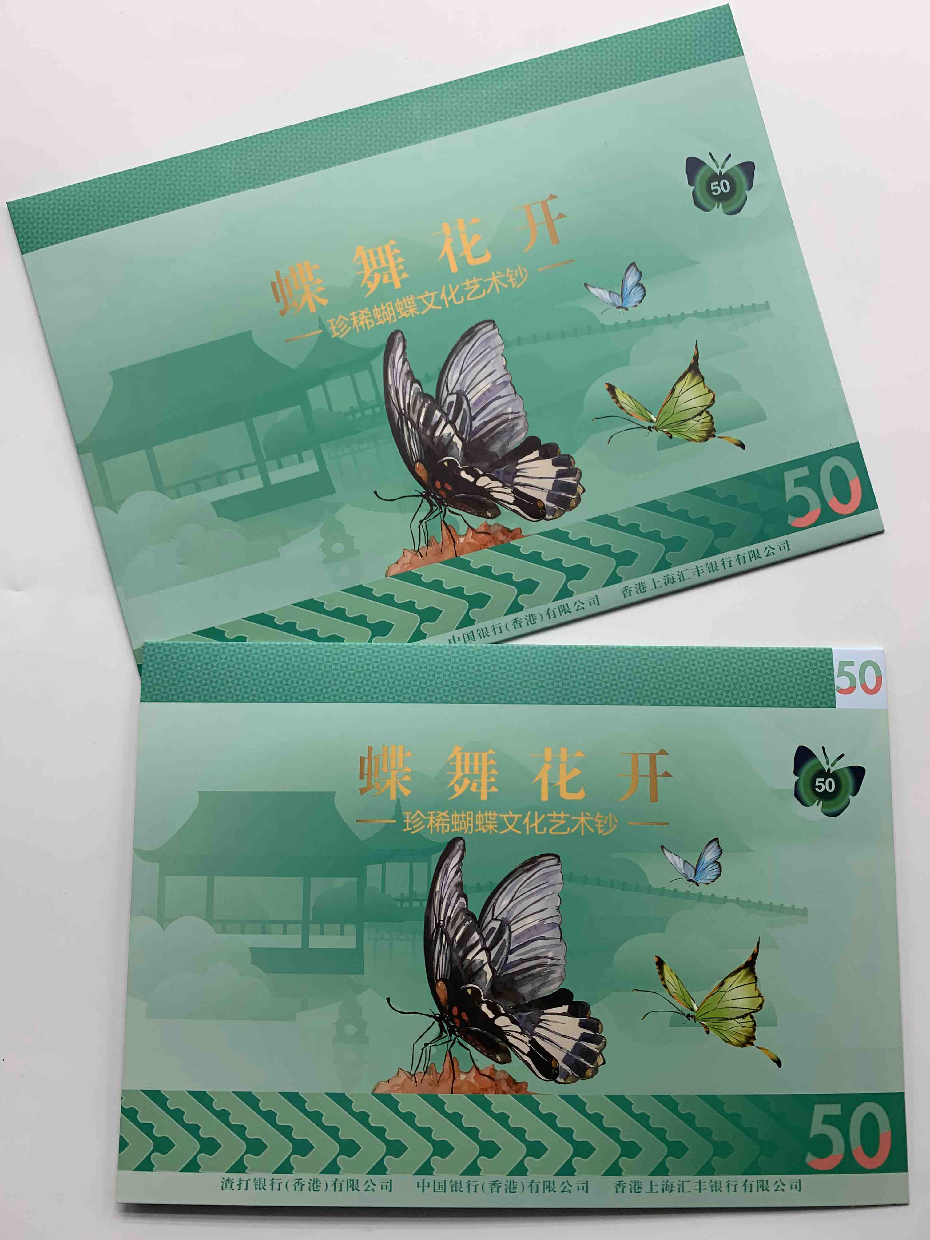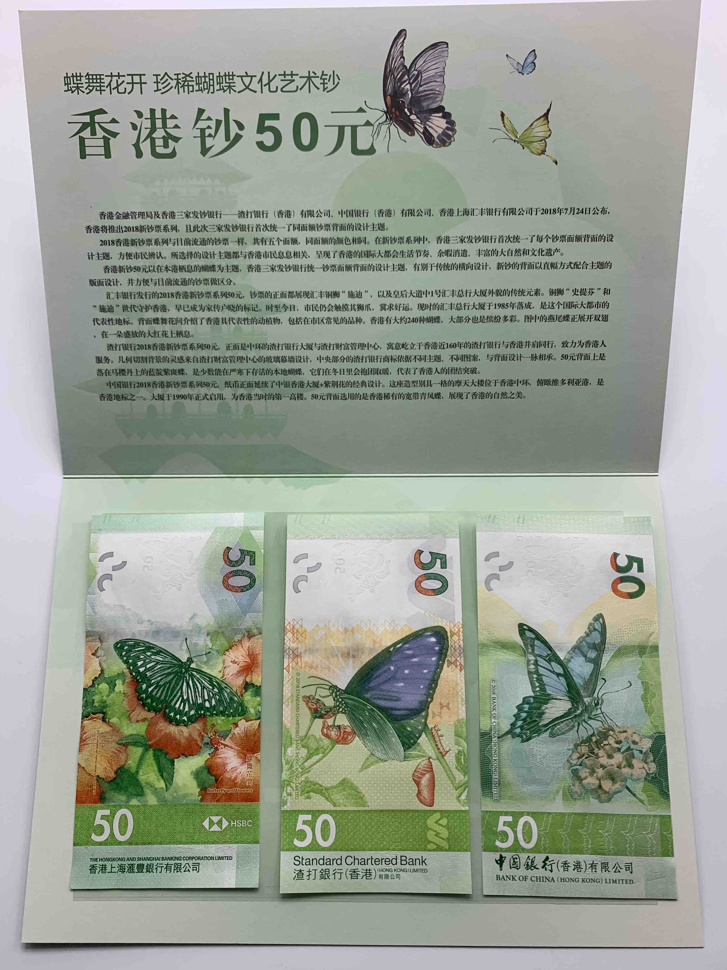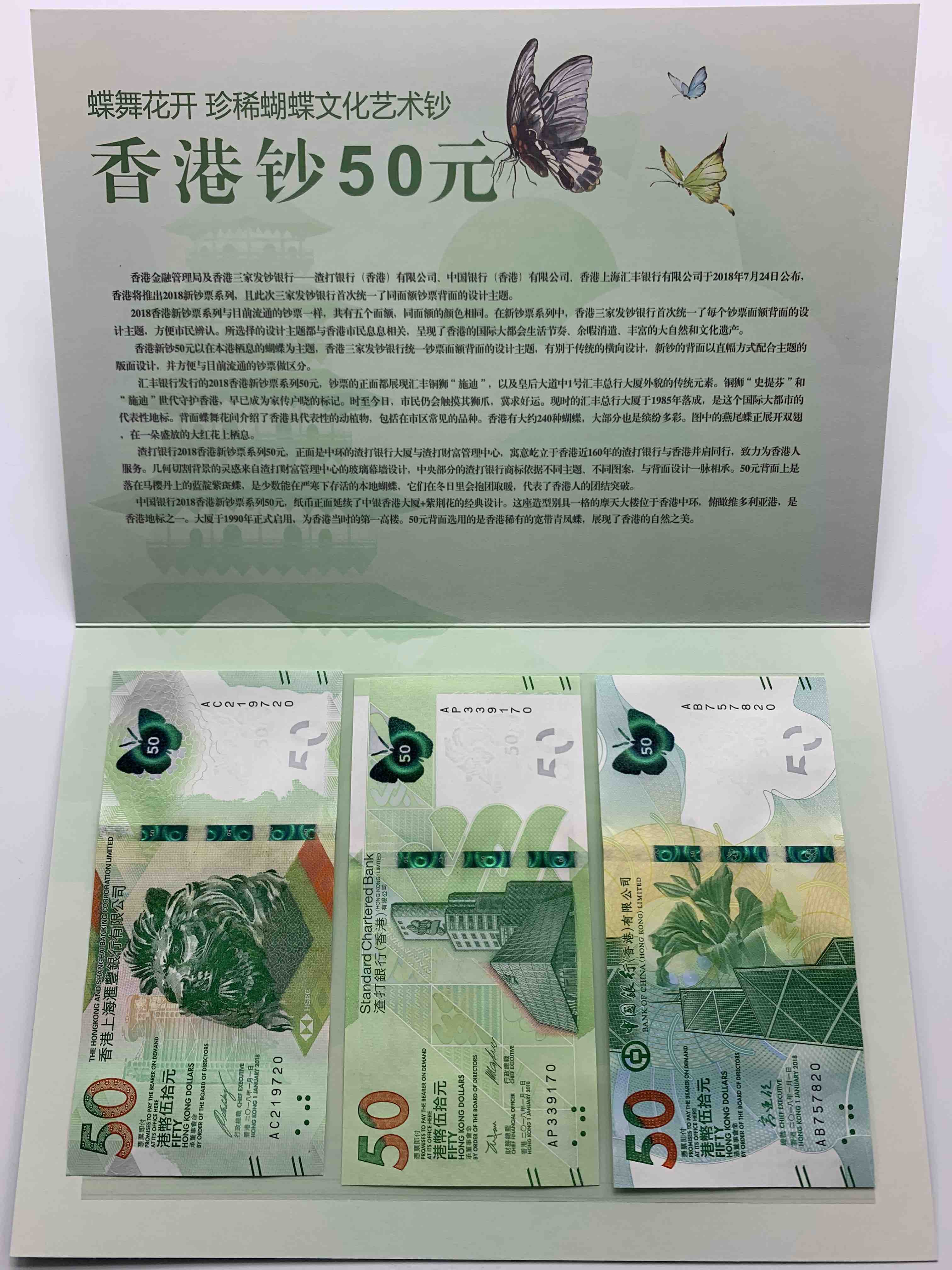 蝶舞花开 香港蝴蝶文化艺术钞一册三张(新版香港50元钞:中国银行香港、渣打银行、汇丰银行)