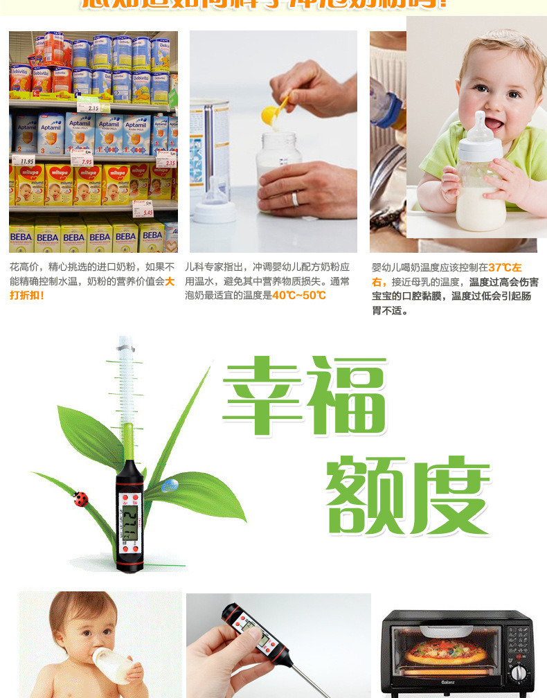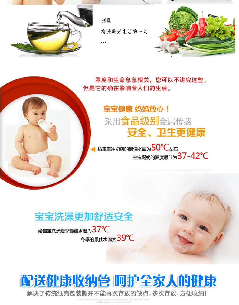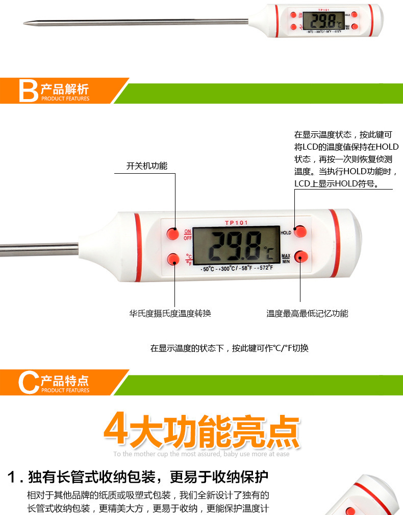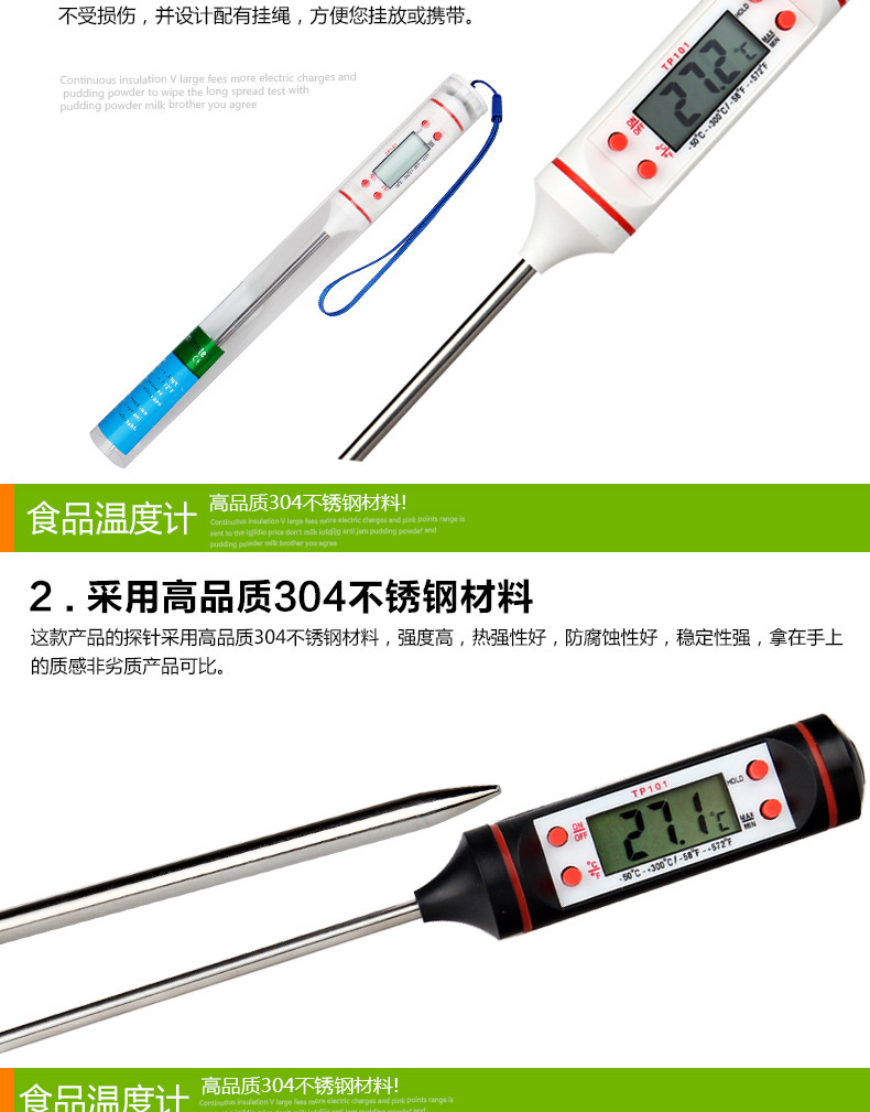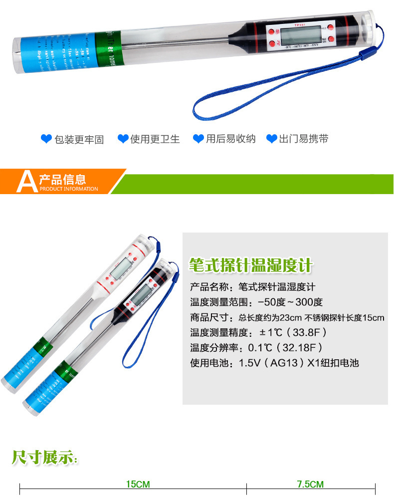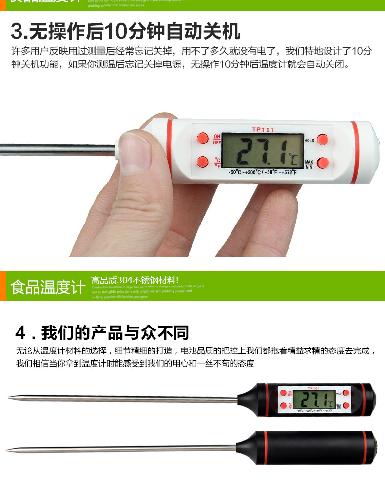厨房油温计 烧烤 烘焙测温 电子食品温度计液体温度笔 TP101黑白 型号:TP101食品温度计 单件: 45.6克 一箱:200个 尺寸:58*33*23CM 探针采用不锈钢材料 产品清单:温度计一个,电池一节, 说明书一份 测量范围:水温、食品、液体、膏体、油温、奶温、茶、汤类、啤酒等等 温度测量范围:-50℃~300℃(-58℉~+572℉)宽范围测量 功能特点: 笔型结构,不锈钢探头,直测量,便于携带。测量范围宽。适用于制冷、制热、食品加工,橡塑加工等多个领域。 按纽功能说明:1,ON/OFF:开关功能 2,C/F:摄氏/华氏转换 3,HOLD:温度锁定功能,按下此按纽,当时的温度被锁定,再按下锁定功能解除。 4,MAX/MIN:高温度和低温度记忆,按下此按纽显示前次的高温度,再按显示前次的低温度,再按恢复测温状态。 技术数据: 测温范围:-50℃~+300℃ (-58℉~+572) 分 辩 率:0.1℃ 精 确 度:±1℃(-20℃~+80℃) ±2℃(其他范围) 节电模式:10分钟自动关机省电功能 电 源: AG13纽扣电池1个 整机长度:225mm 探杆净长度:145mm 显示尺寸:21mm×8mm