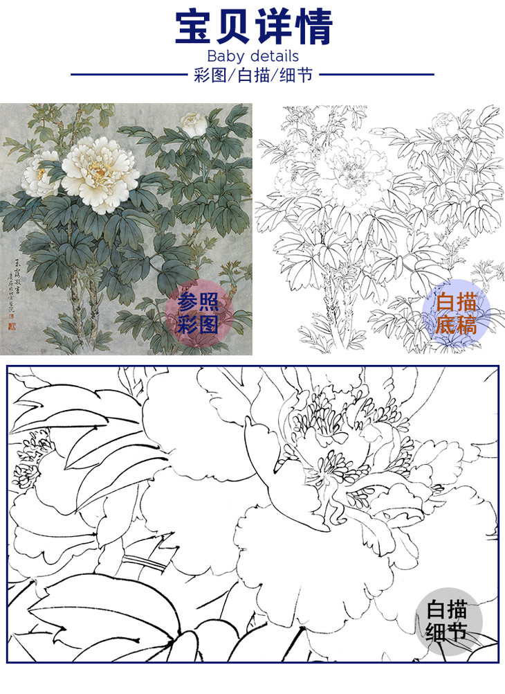 工笔花鸟白描底稿-牡丹-王庆升《雨露凝香》斗方小品册页-多种白描尺寸可选-QB16