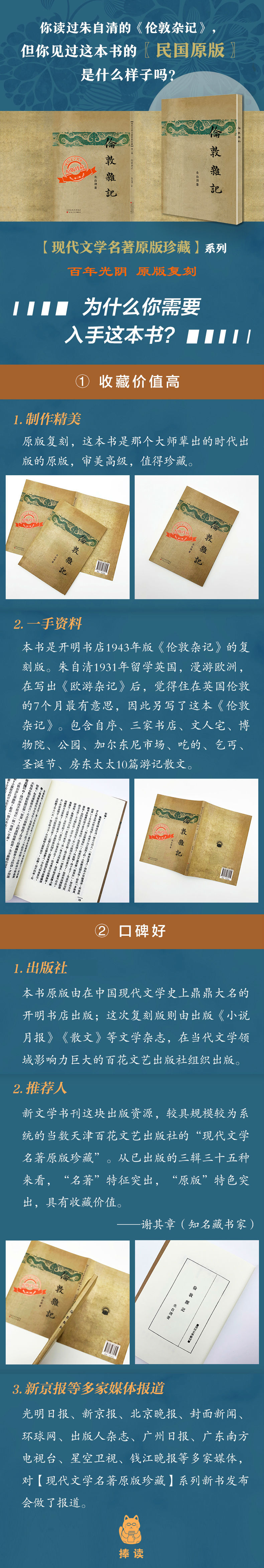 本书是开明书店1943年版《伦敦杂记》的复刻版。朱自清1931年留学英国,漫游欧洲,在写出《欧游杂记》后,觉得住在英国伦敦的7个月很有意思,因此另写了这本《伦敦杂记》。包含自序、三家书店、文人宅、博物院、公园、加尔东尼市场、吃的、乞丐、圣诞节、房东太太10篇游记散文。