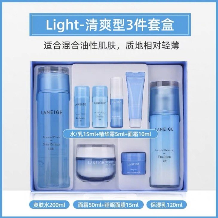 Laneige兰芝面霜三件套#清爽型👍兰芝的水乳套装含有多种蛋白质复合物和矿物质,配合新加入的黑科技保湿技术💦,是缺水肌肤的“小水库”,护理调理一步到位。☑️#LIGHT清爽型适合油皮或者混合型肌肤,矿物质离子水为暗哑肌肤补水,烟酰胺清理污垢改善角质♻,同时特备添加吸收油脂的硅石帮助调节分泌过剩的油脂,令肌肤清透明亮,提高含水量⬆。补水同时控油! *套盒包括:水200ml+乳120ml+睡眠面膜15ml+面霜50ml+水乳各15ml+精华露5ml+乳霜10ml