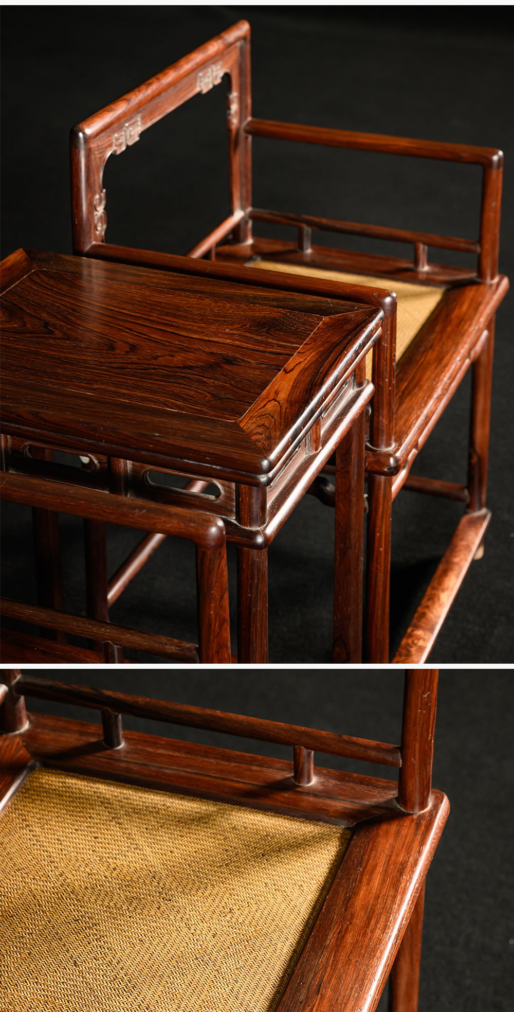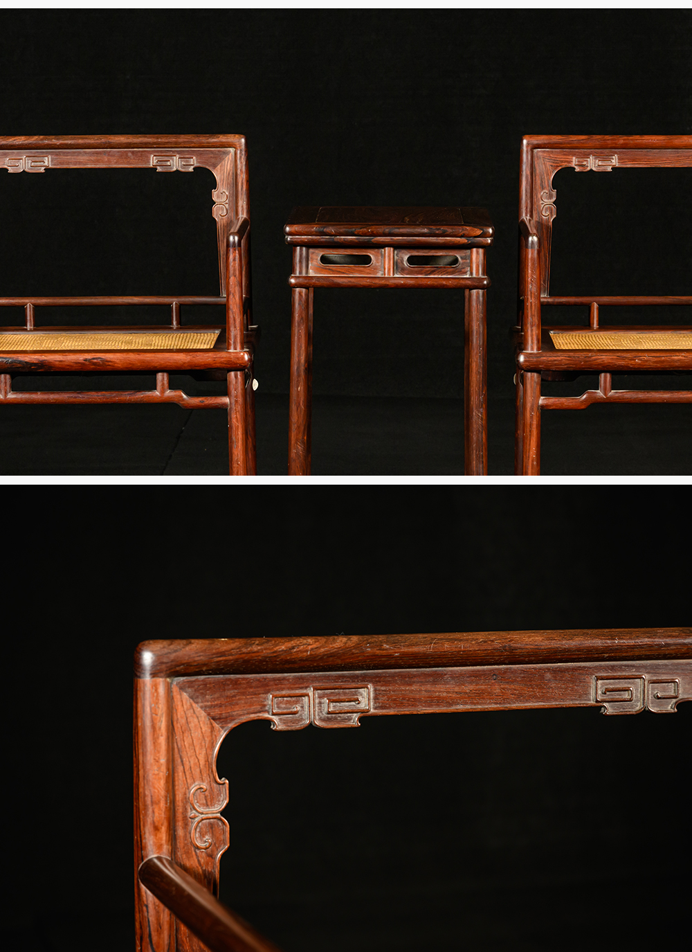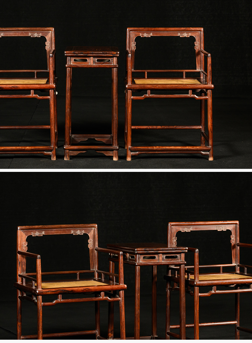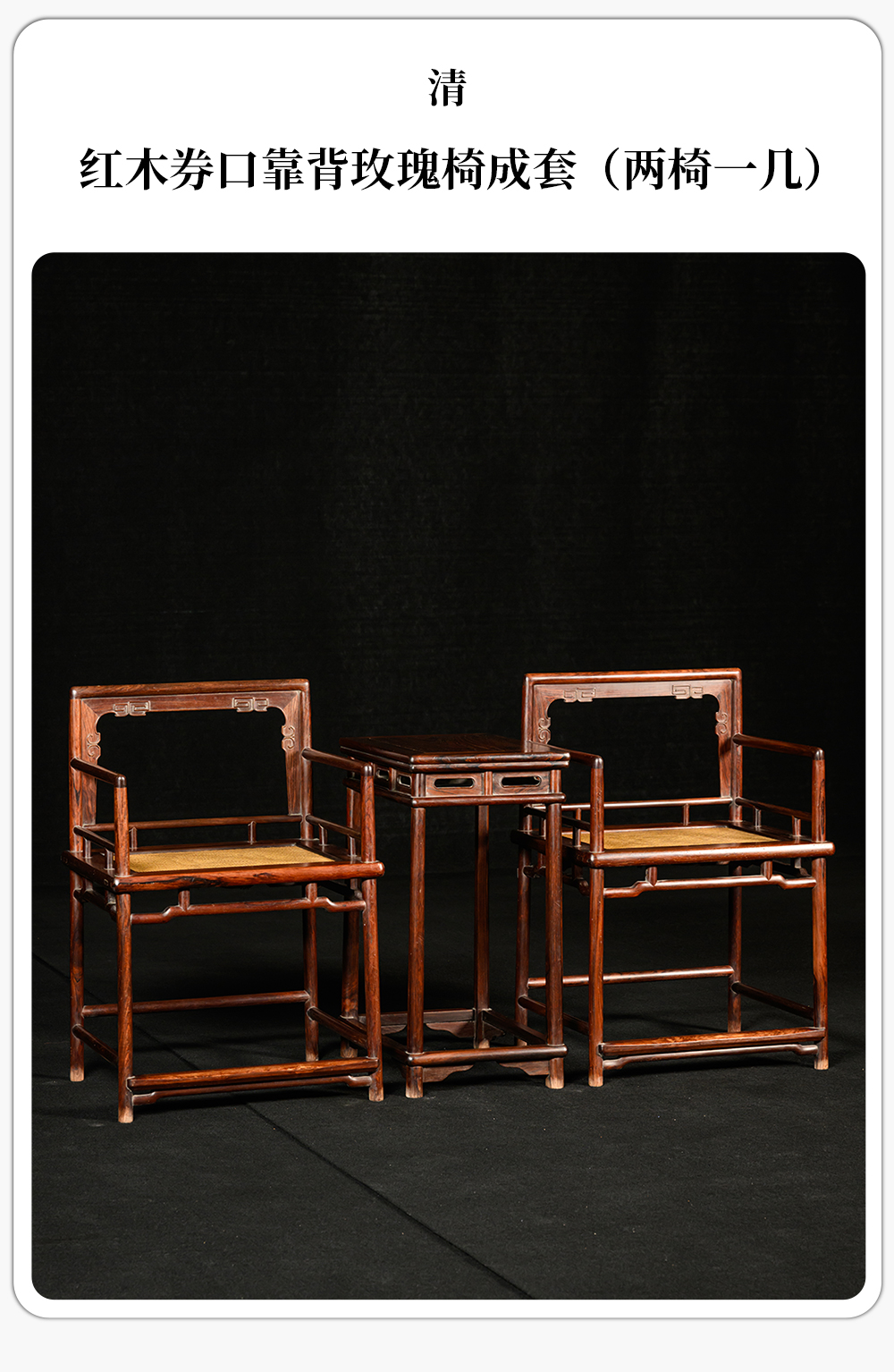 清 红木券口靠背玫瑰椅成套(两椅一几)