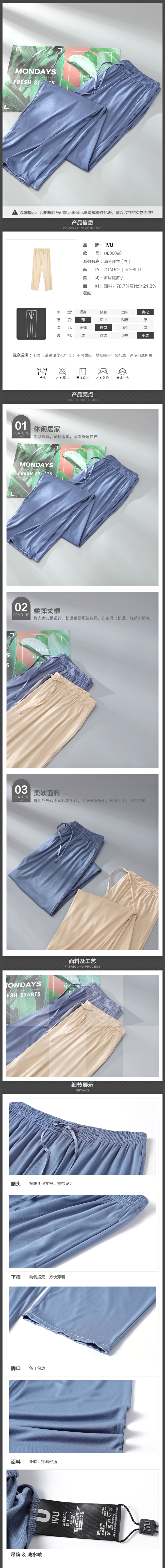 安莉芳旗下IVU男士薄款莫代尔长裤宽松系带休闲家居睡裤UL00098