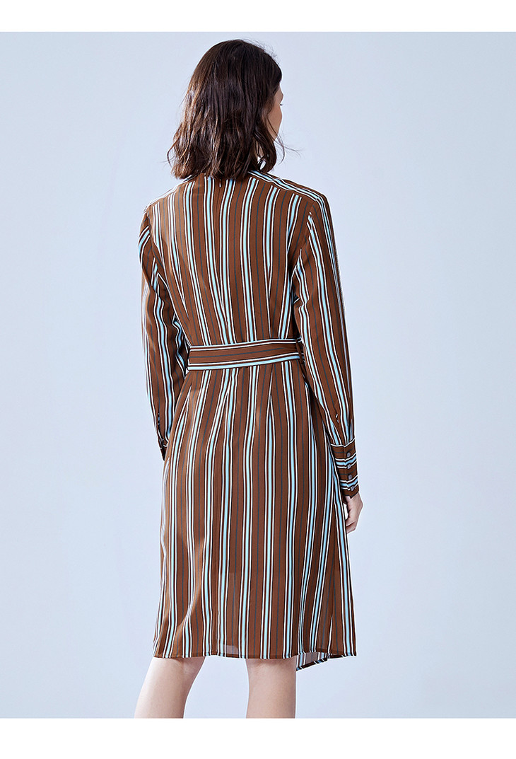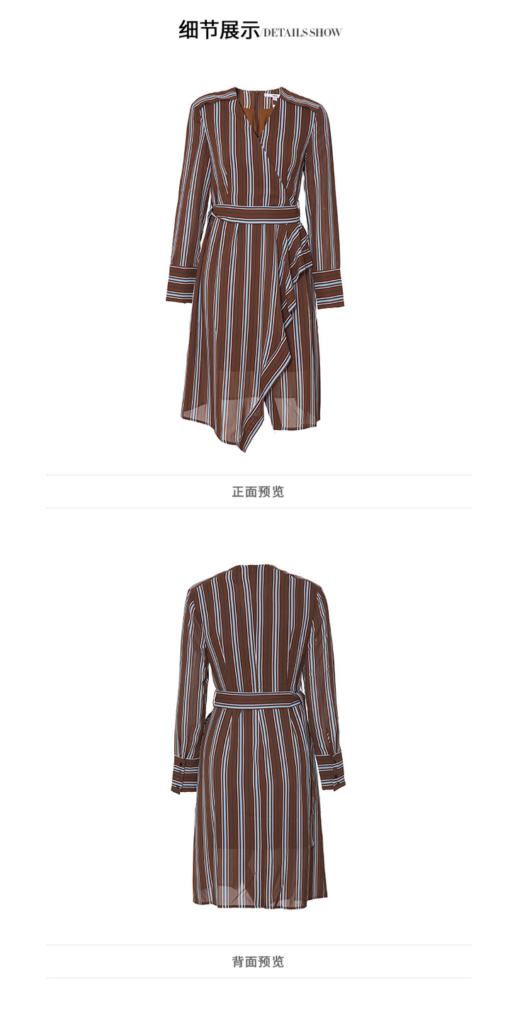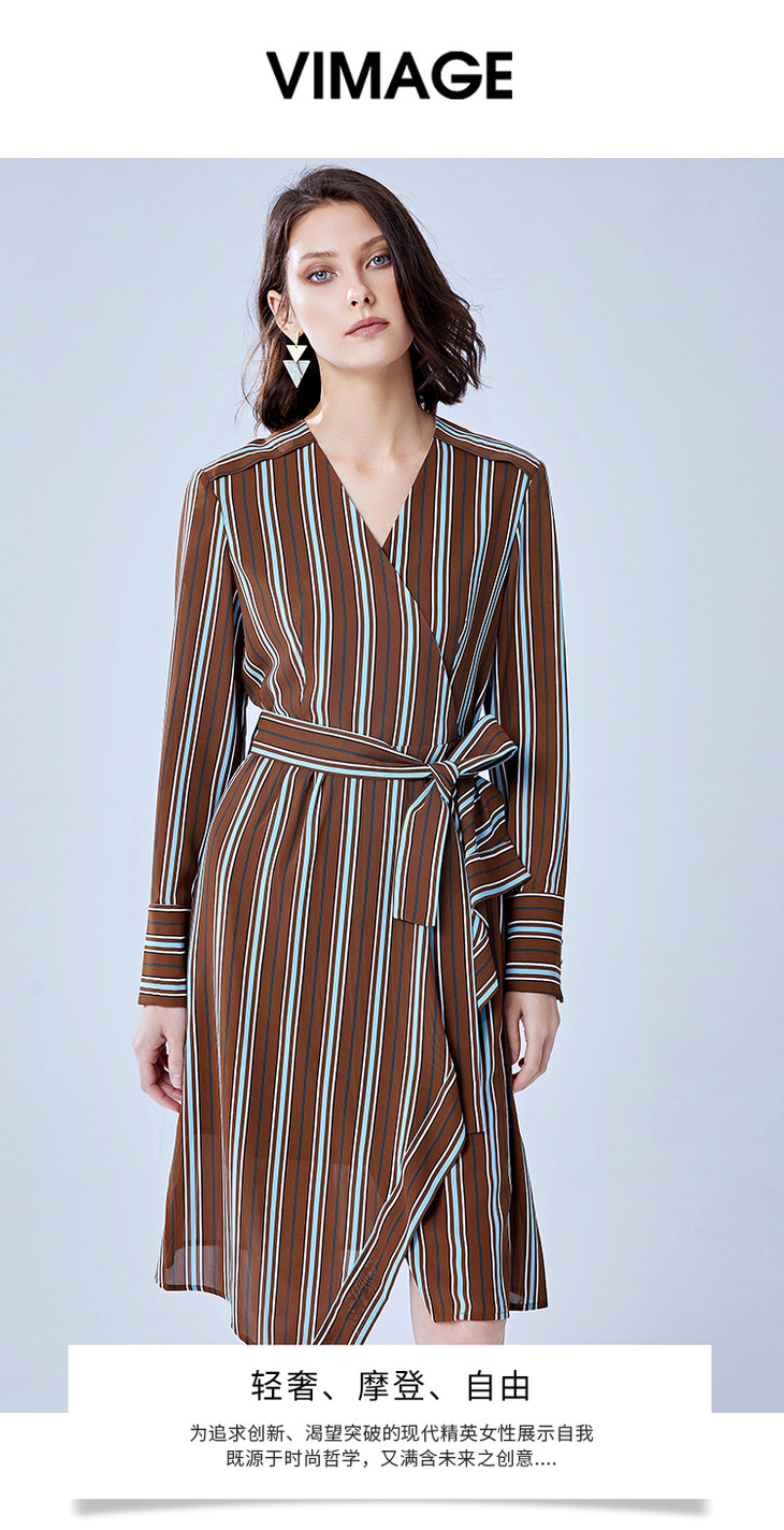 VIMAGE纬漫纪新款时尚不规则V领收腰显瘦条纹雪纺连衣裙V1307904