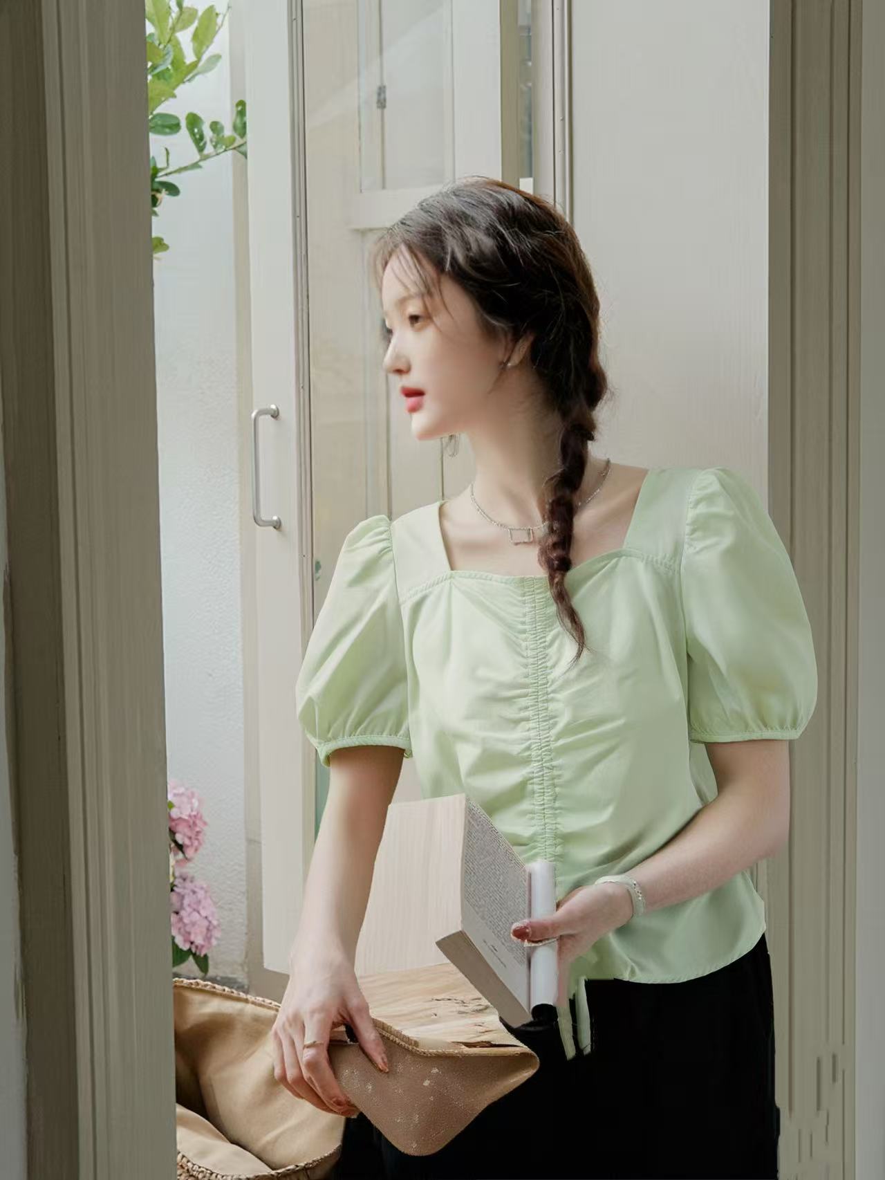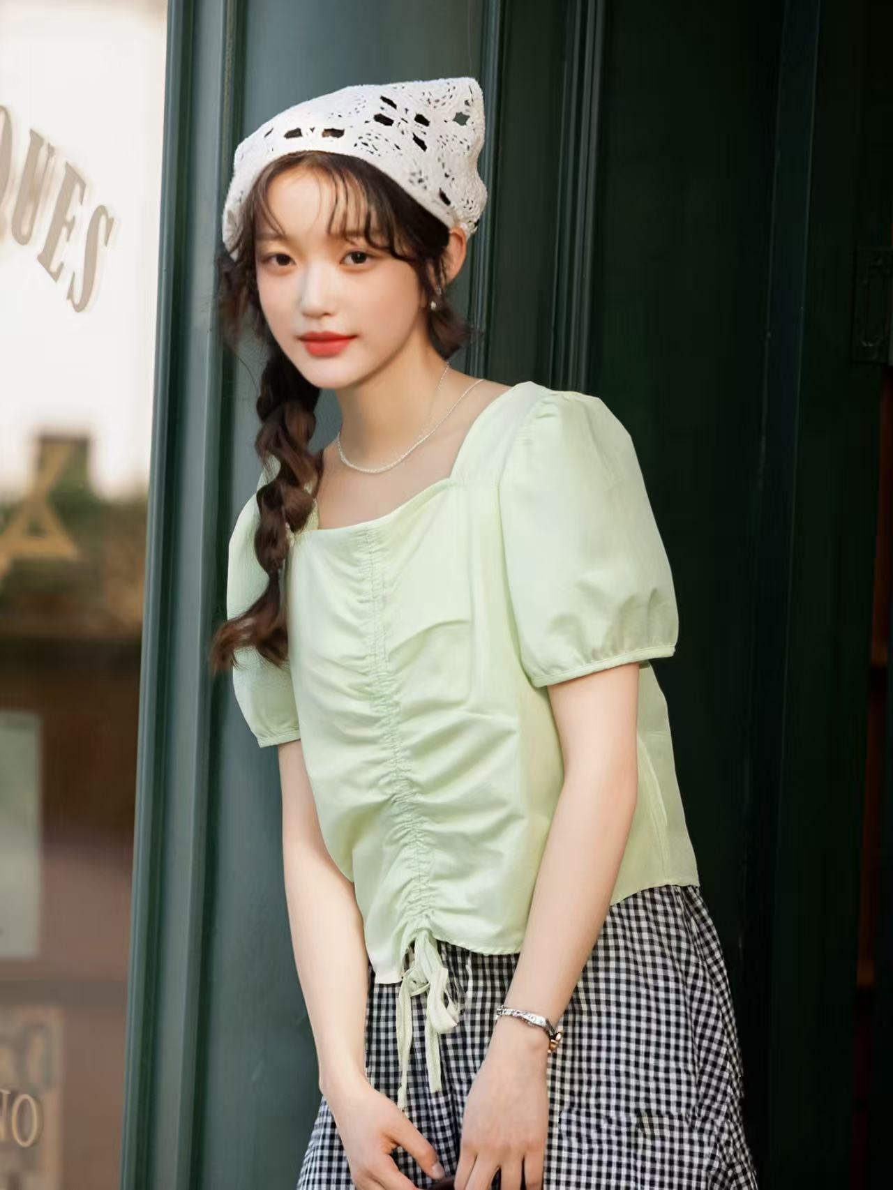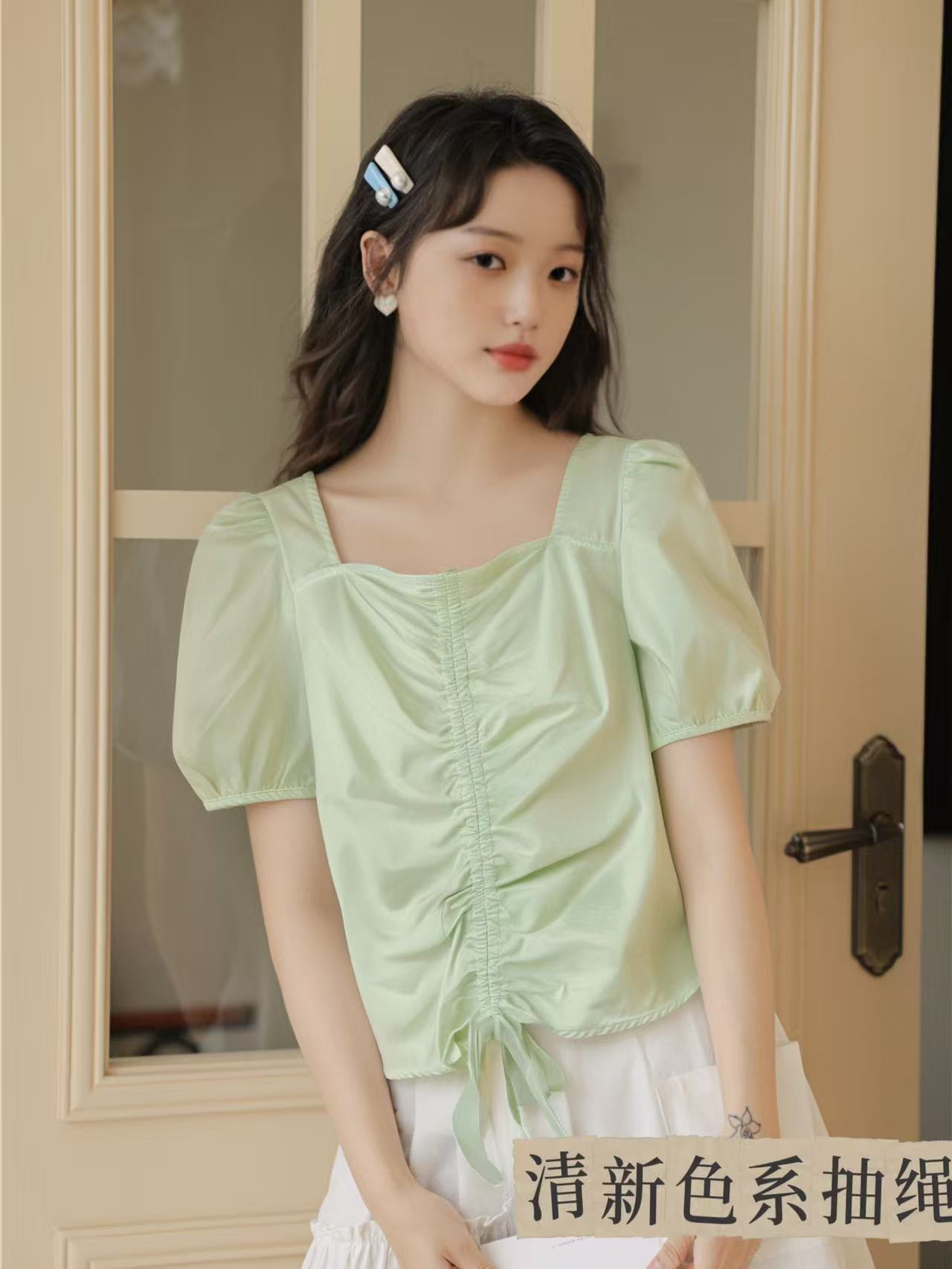 【限八一促】【韩系小衫】(微脏)C01清新绿抽绳褶皱短袖小衫-喜出