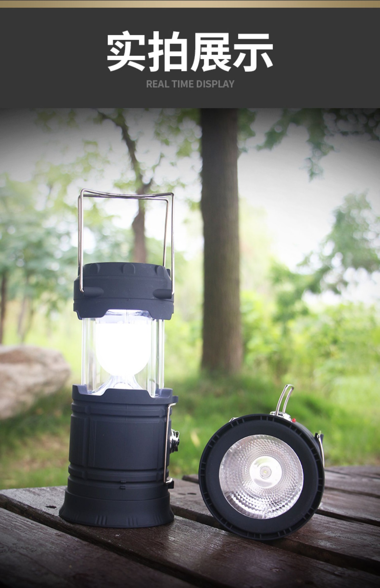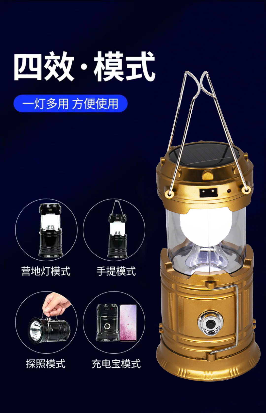 下单48小时广东发货 产品名称:多功能野营灯 产品颜色: 金色\蓝色\黑色 产品尺寸:不拉伸(直径9cm高13.5cm)拉伸(直径9cm高19cm) 产品型号: 5800T 产品材质:PC材质 开关档位:一档按钮/拉伸开关 使用灯珠:6+1LED 产品包装:彩盒包装 续航时间:6-8个小时 产品毛重:350g 插 头:默认发扁插! 此款产品内置锂电池,发货配有一根充电线,充电时间6个小时左右,避免过充