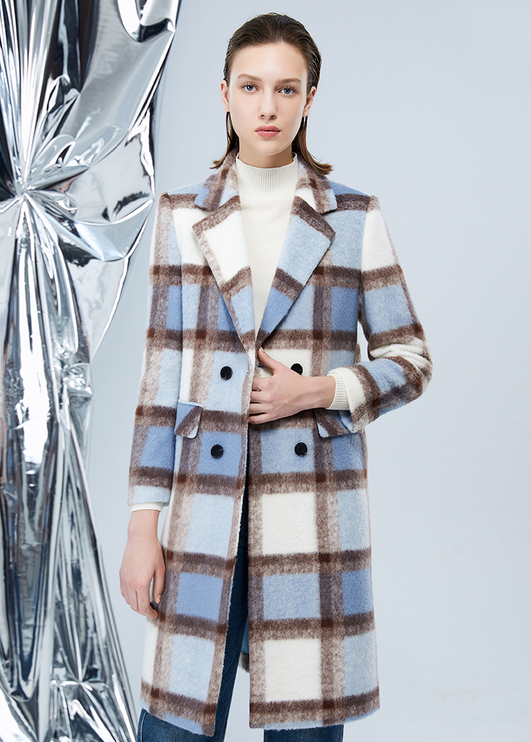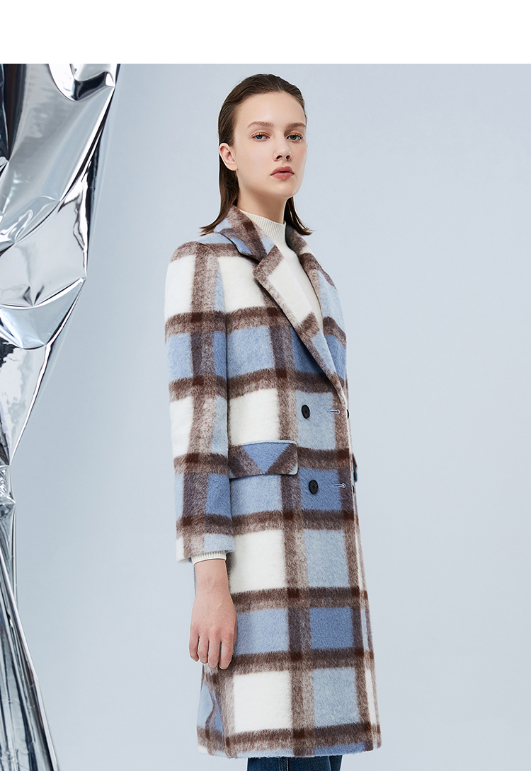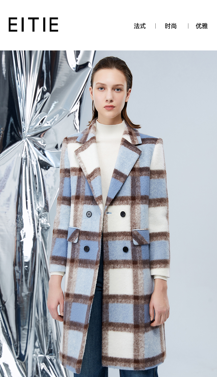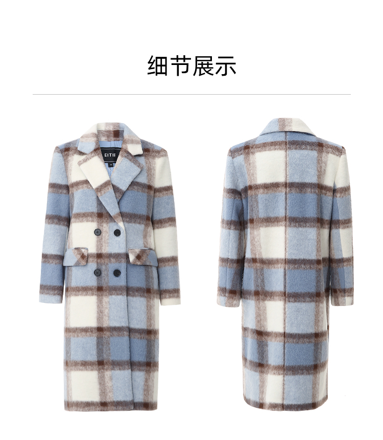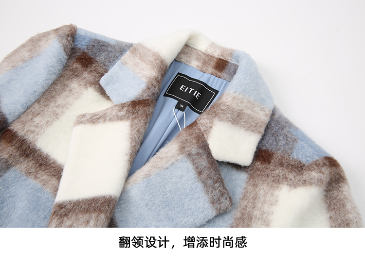 EITIE爱特爱冬季新款复古翻领撞色毛呢格子大衣长款外套7614329