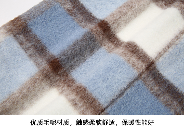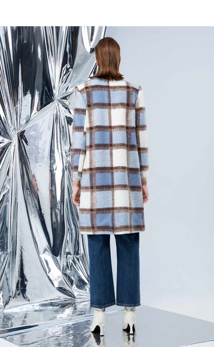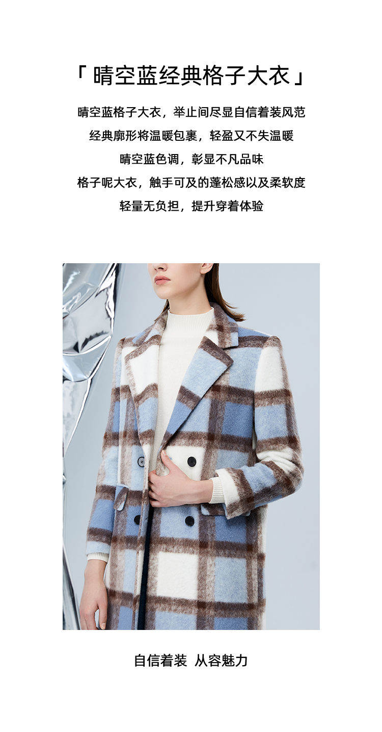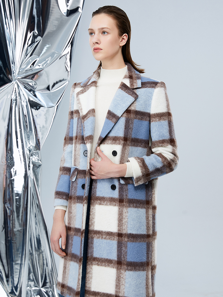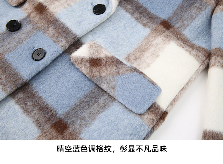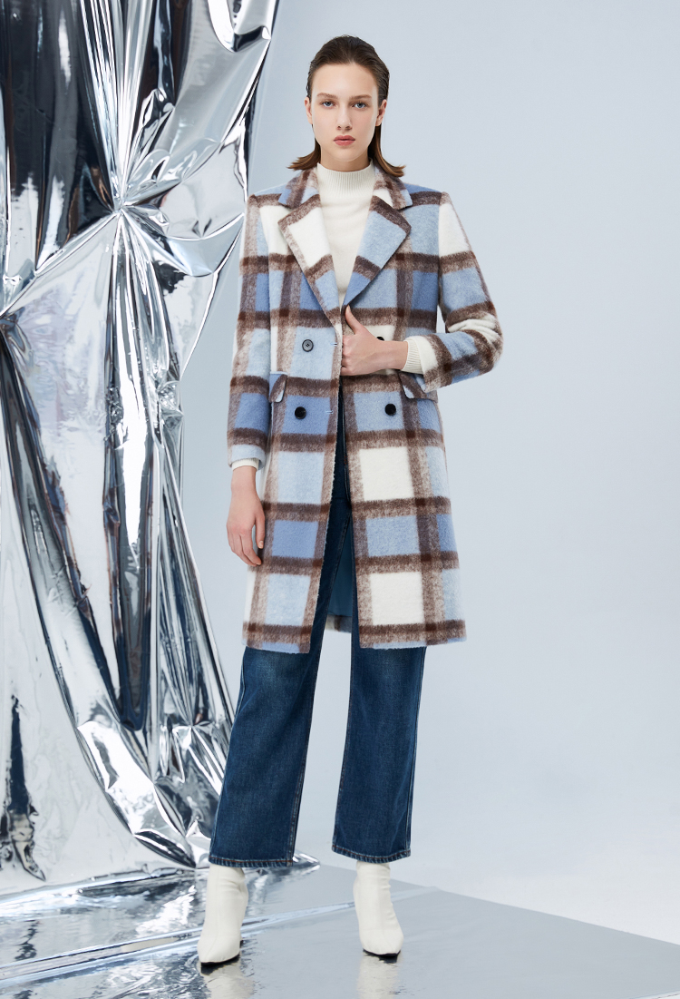 EITIE爱特爱冬季新款复古翻领撞色毛呢格子大衣长款外套7614329