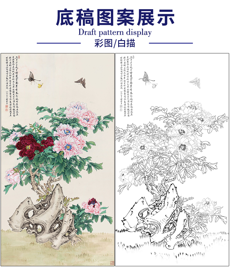 俞致贞花鸟工笔画白描底稿竖幅《庆云牡丹图》临摹勾线高清打印稿ZZ30