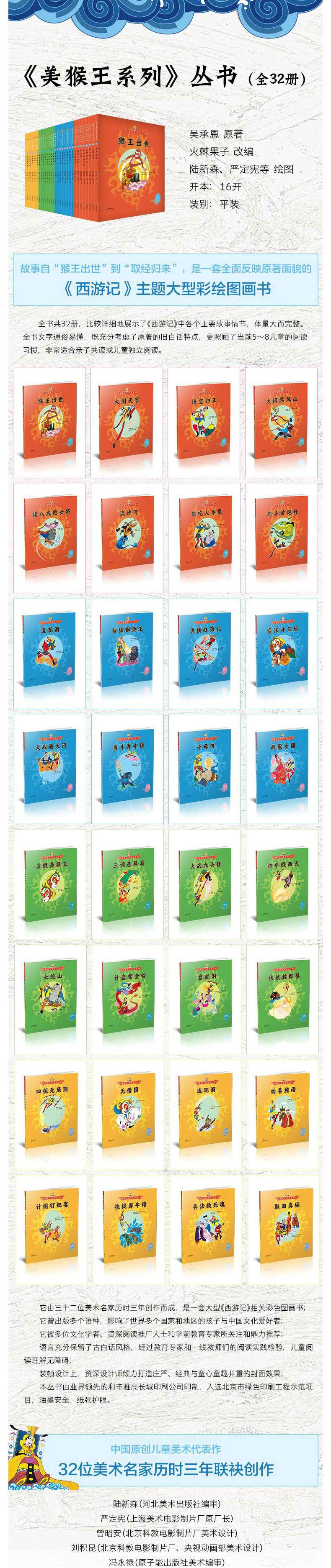 这是一套难以复制和逾越的中国原创儿童美术作品,主要面向5-8岁少儿读者。本书根据吴承恩著中国古典小说《西游记》改编,由陆新森、严定宪等三十二位美术名家联袂绘制,是一套《西游记》主题的大型彩色图画书。本书曾翻译成多种语言向全世界发行,代表了中国当代儿童美术创作的水准,深受海内外读者喜爱。