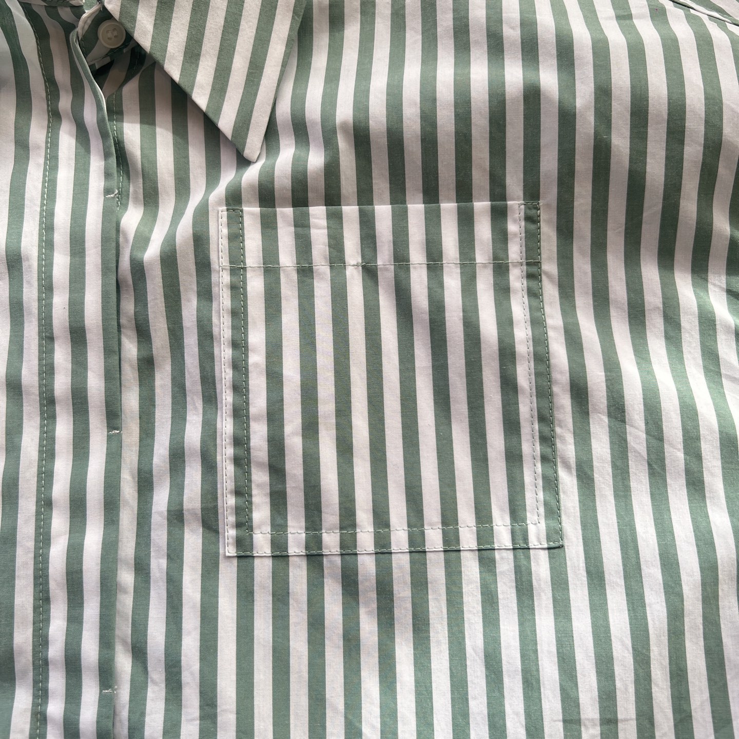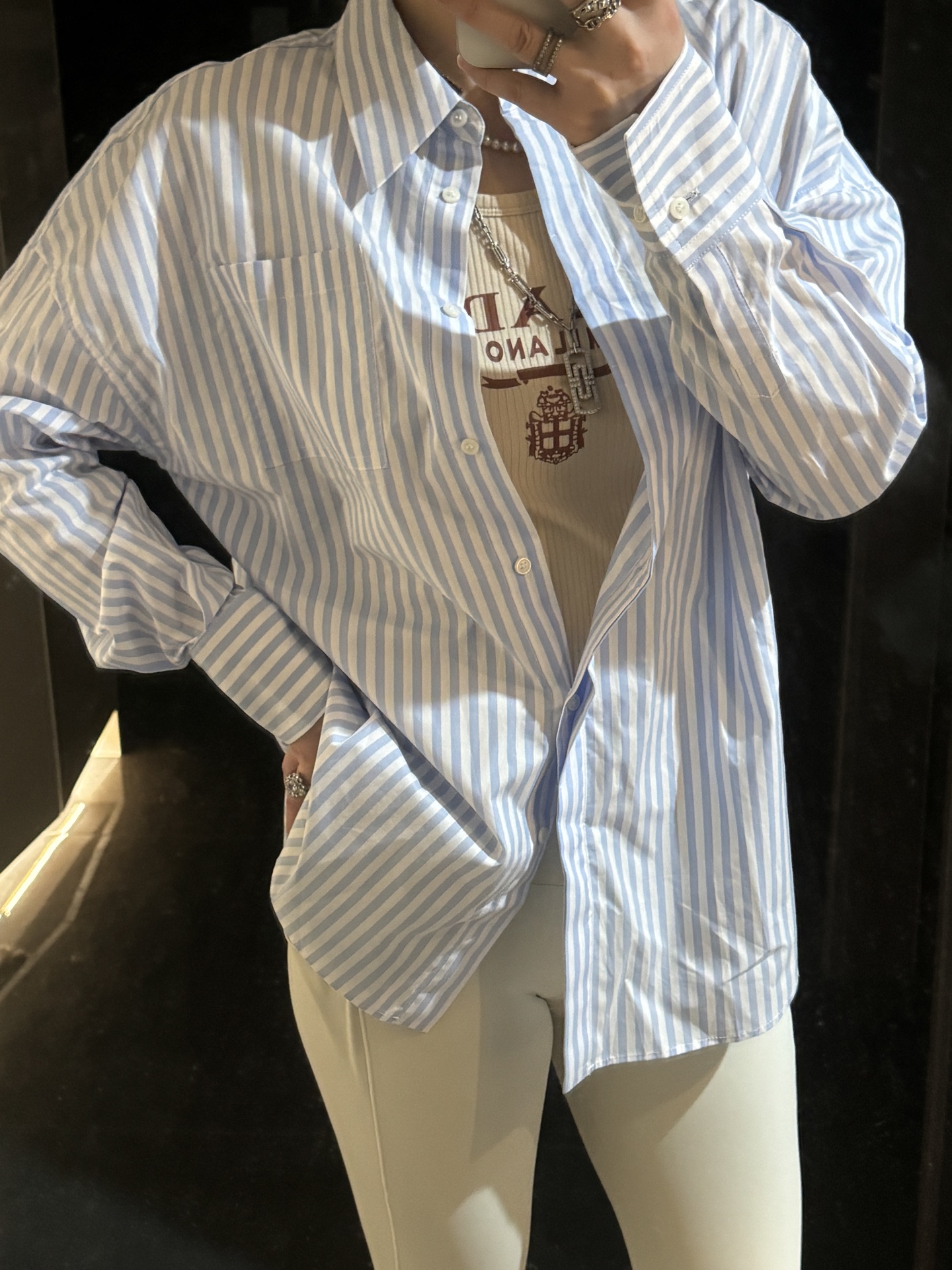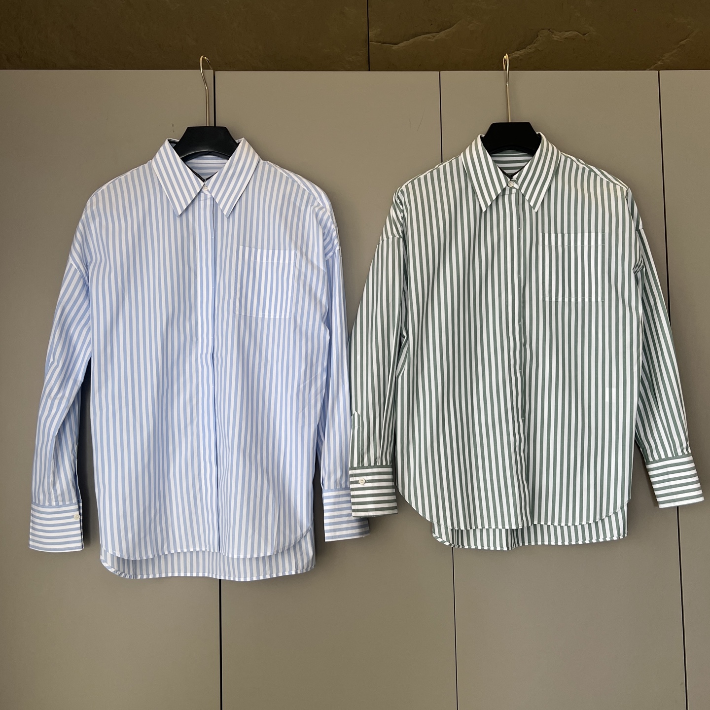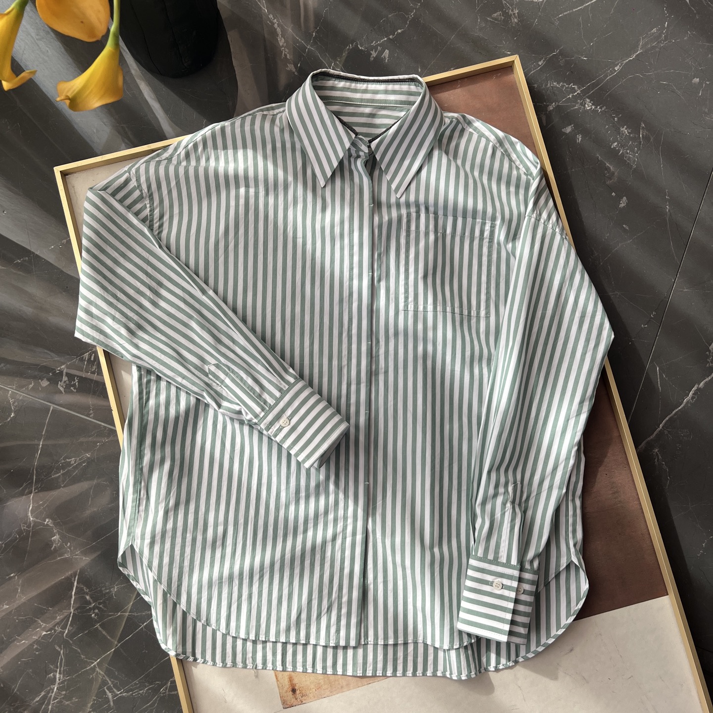 深圳南油高定经典条纹成‼️!设计款条纹衬衫!这细节真的会谢✨ 💚蓝白+绿白两个配色直接戳中春夏审美,拿到手质感直接惊了——标签100%棉,摸起来是那种软乎乎但又有挺括感的棉料,不会软塌塌贴在身上,通勤/休闲穿都撑得起气质~😌 先夸细节!领口内侧藏了黑色小珠链装饰,图片放大看!低调又有点小精致,不是那种烂大街的基础款;袖口是双纽扣设计,想松想紧都能调,对胳膊粗的姐妹超友好! 最绝的是门襟的隐形扣设计!扣好之后完全看不到纽扣痕迹,正面看就是干净利落的竖条纹,强迫症狂喜!后背还有拼接剪裁,不会像普通衬衫那样贴背显壮,微宽松的版型刚好藏住小肚腩,梨形身材套个牛仔裤就很绝~👖 两个颜色都很百搭:蓝白是清爽挂的,搭西装裤就是职场轻熟;绿白更温柔,配半裙或者牛仔裤都很减龄!洗了一次没怎么变形,全棉面料透气到夏天穿也不闷,能买到这质感真的血赚!40码110斤以内⚠️42码130斤以内⚠️女款哈!刚需搭配品