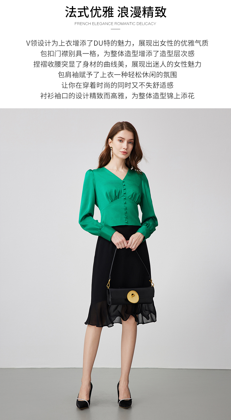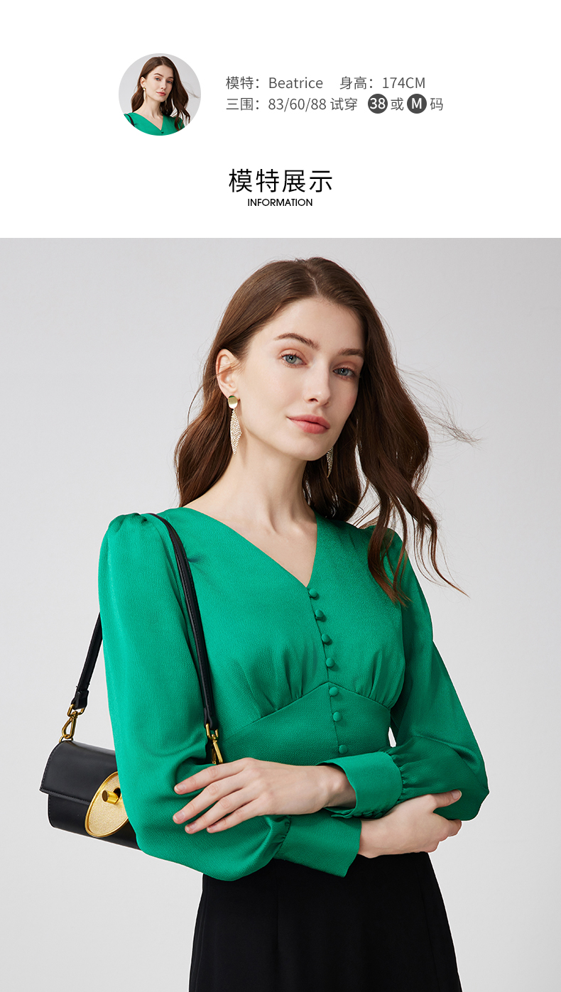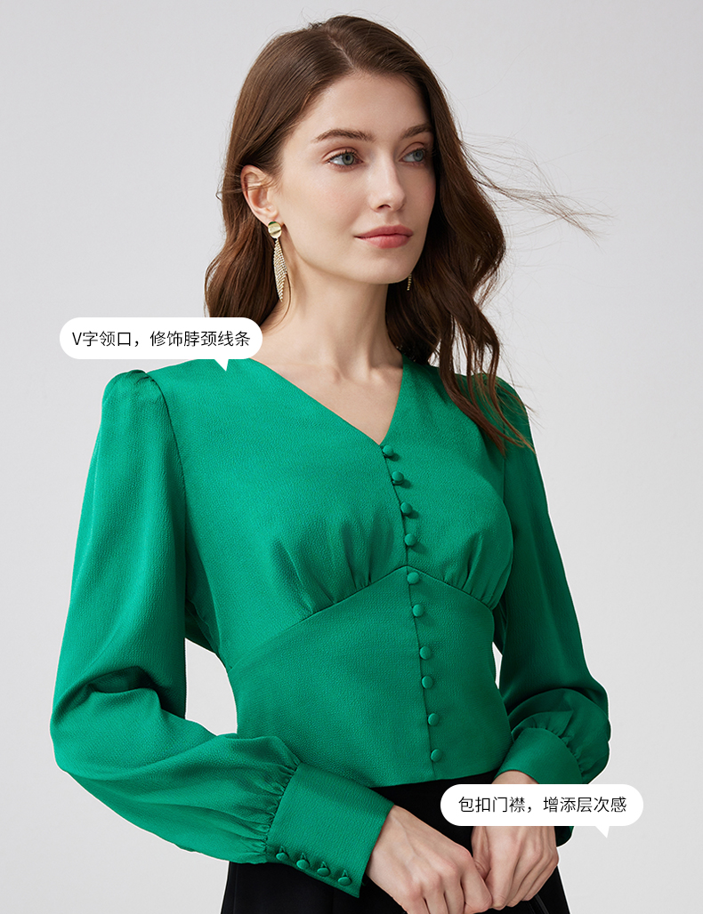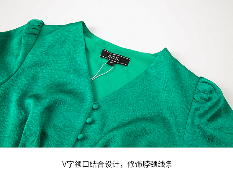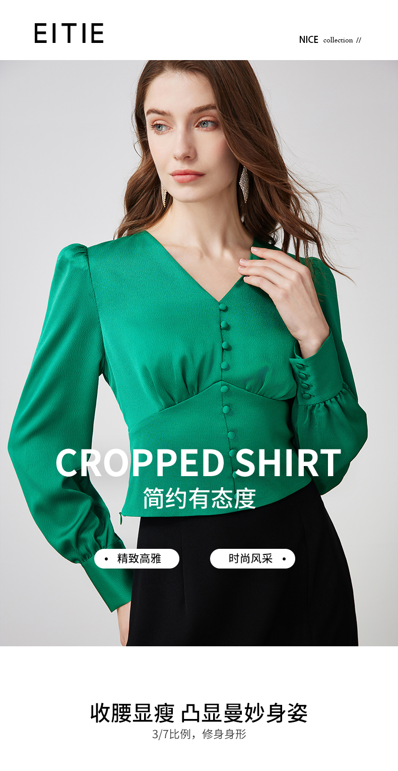 EITIE爱特爱复古宫廷风V领腰封设计绿色短款衬衫上衣24春季新款A2413309