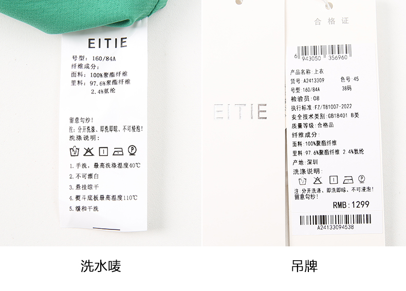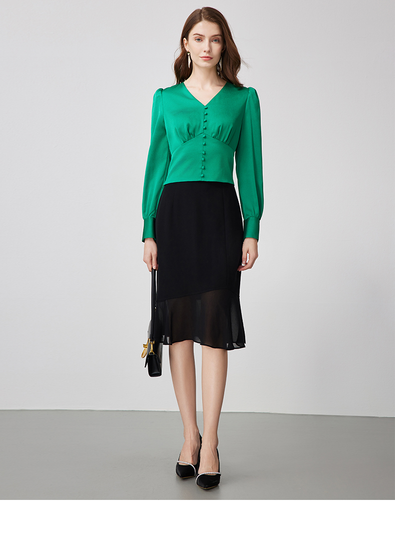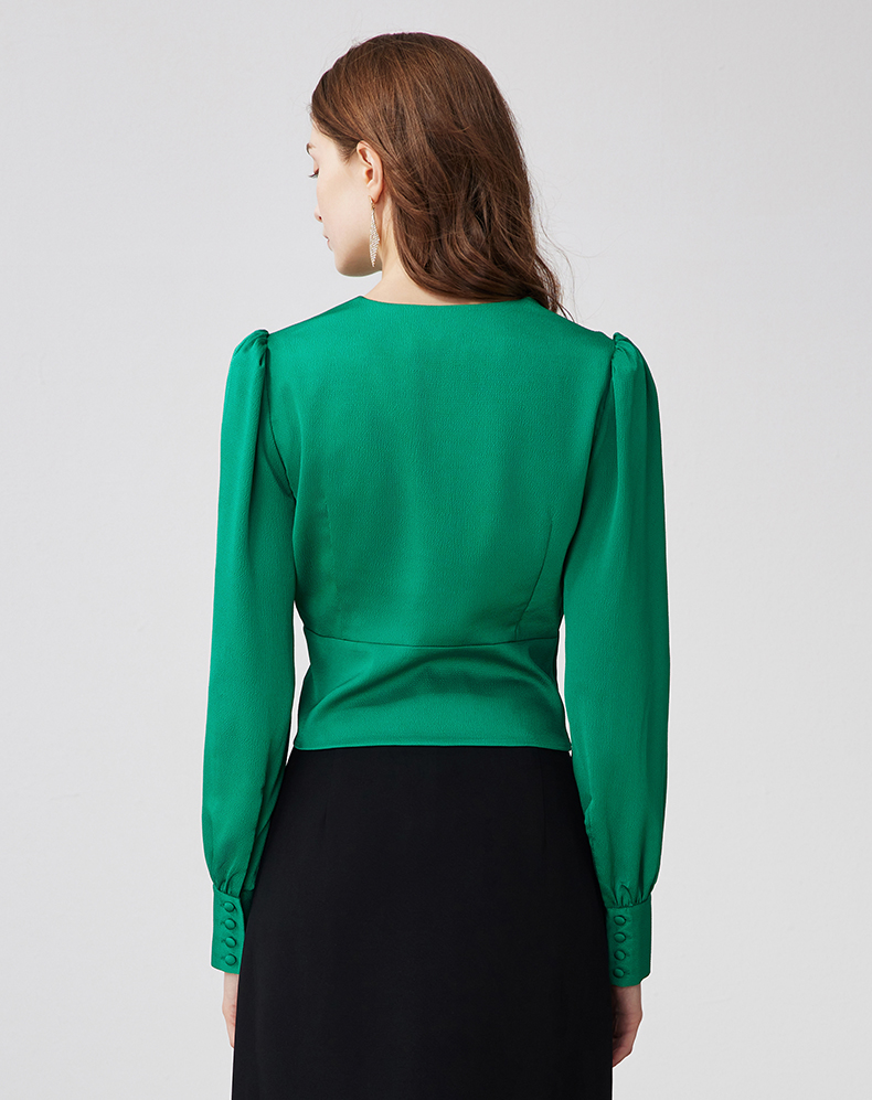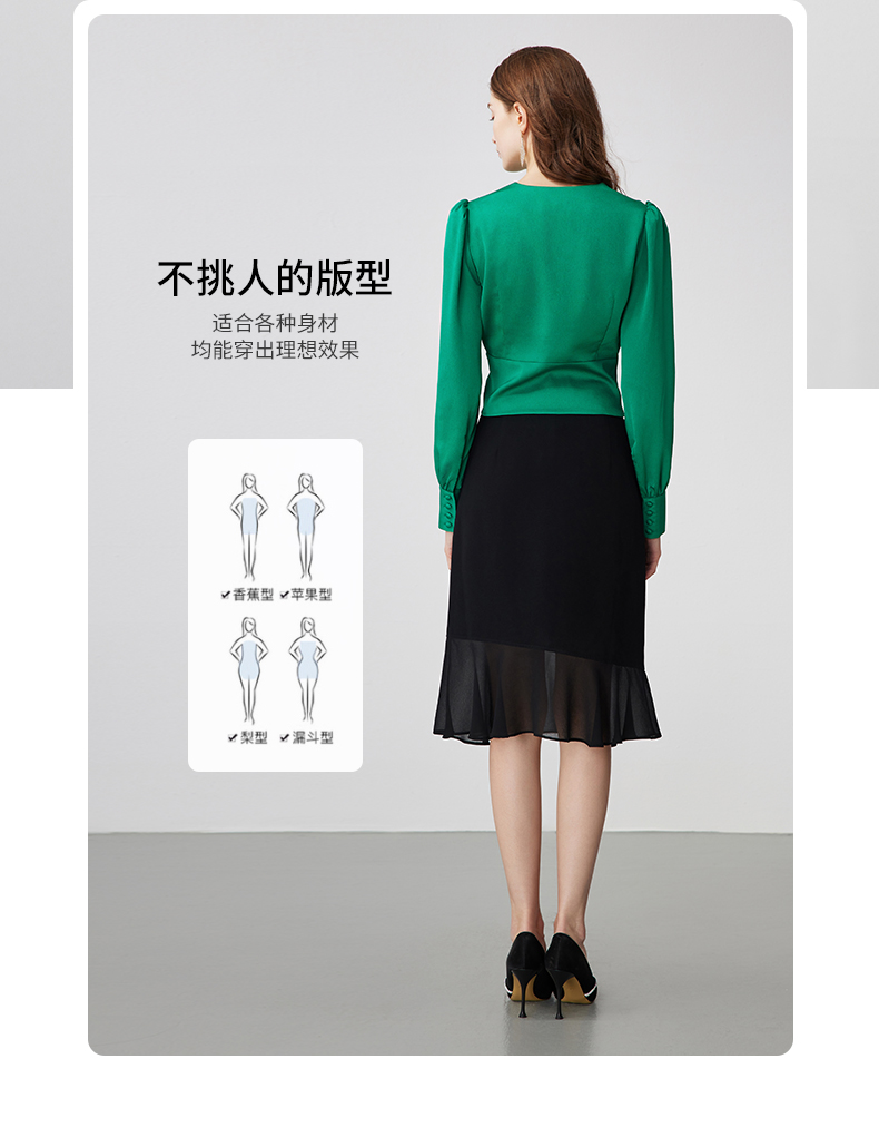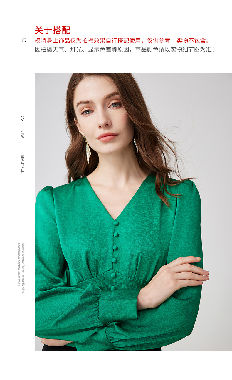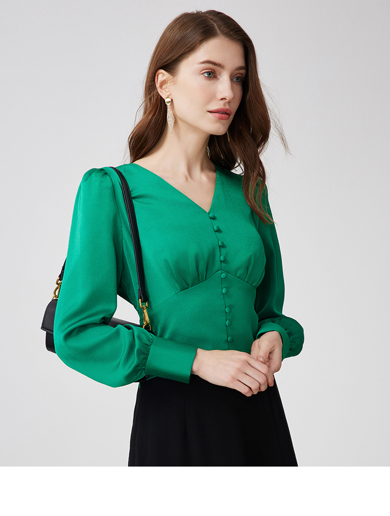 EITIE爱特爱复古宫廷风V领腰封设计绿色短款衬衫上衣24春季新款A2413309