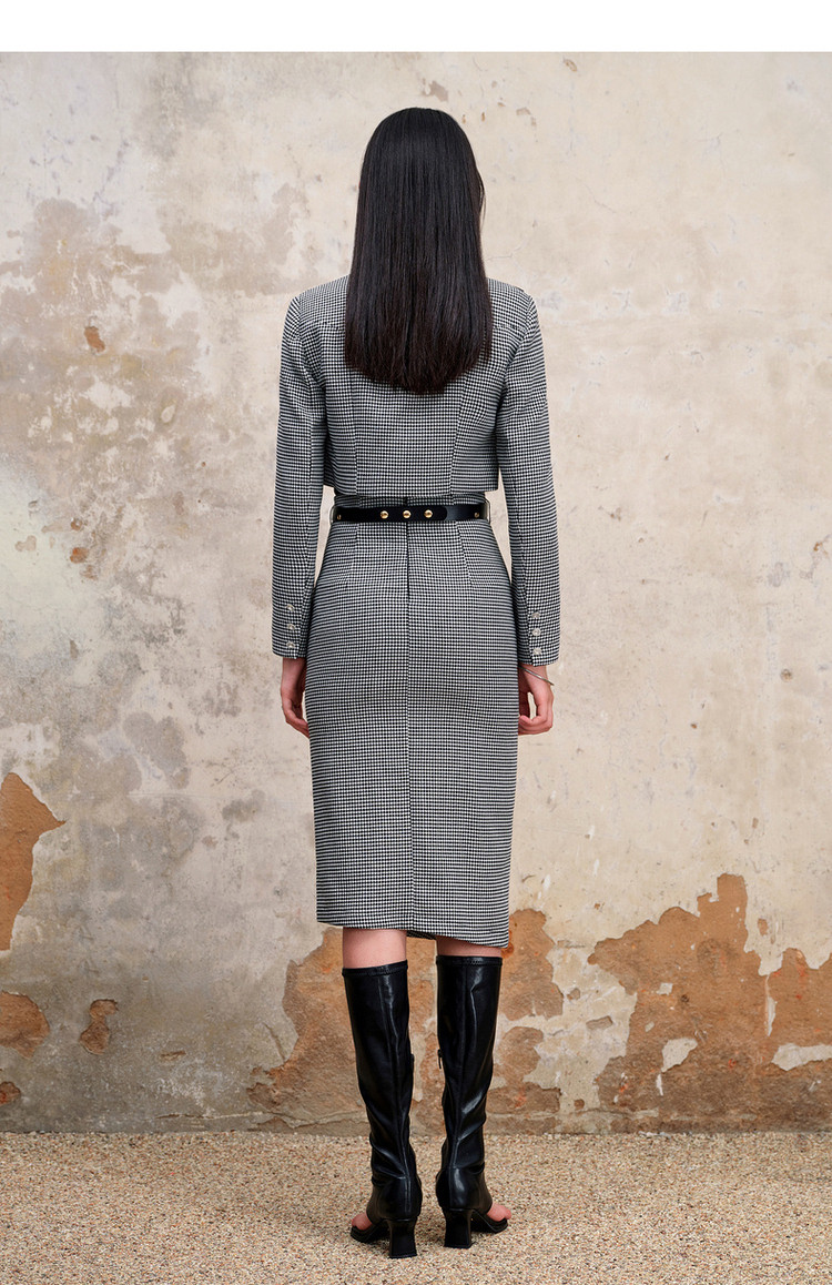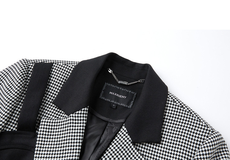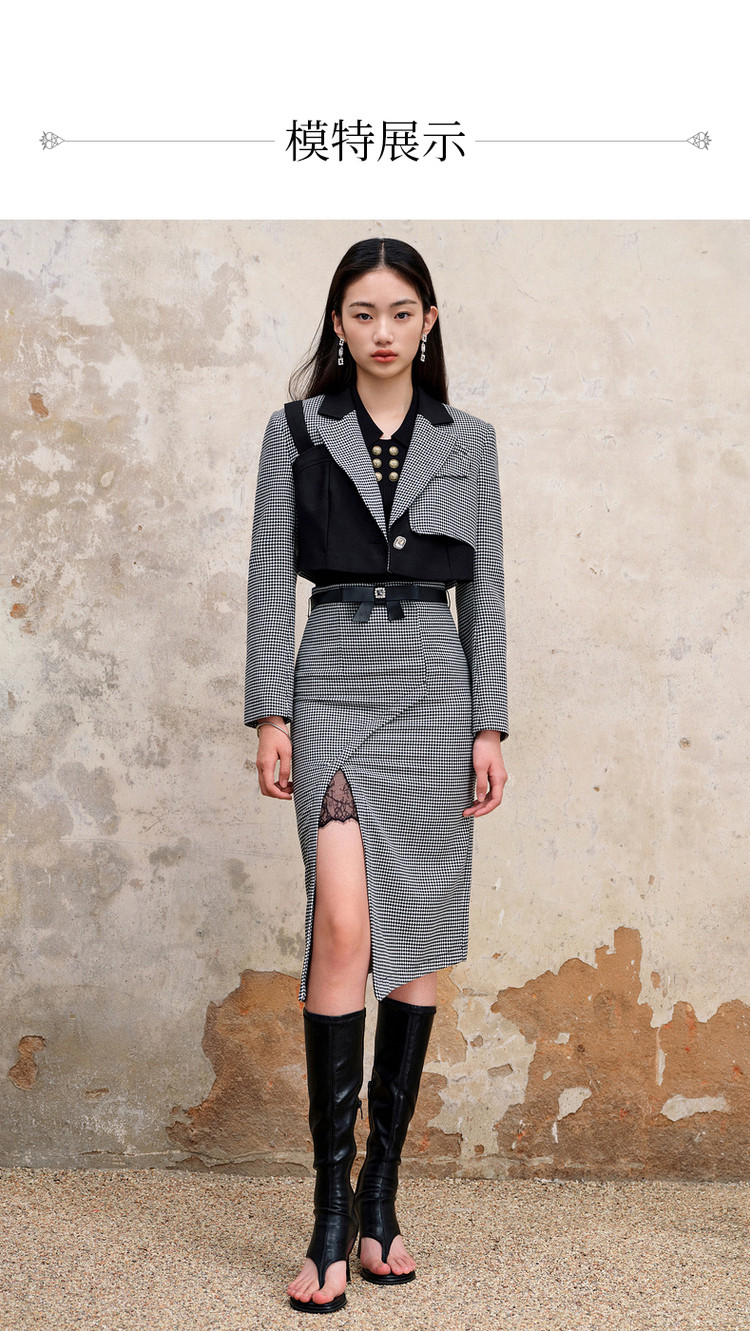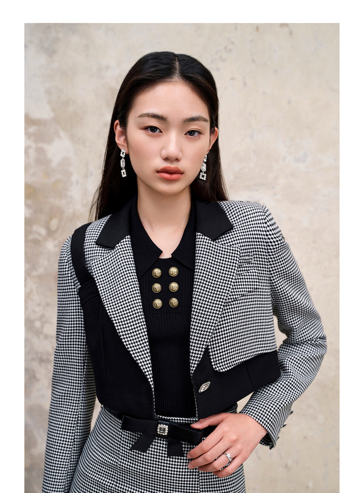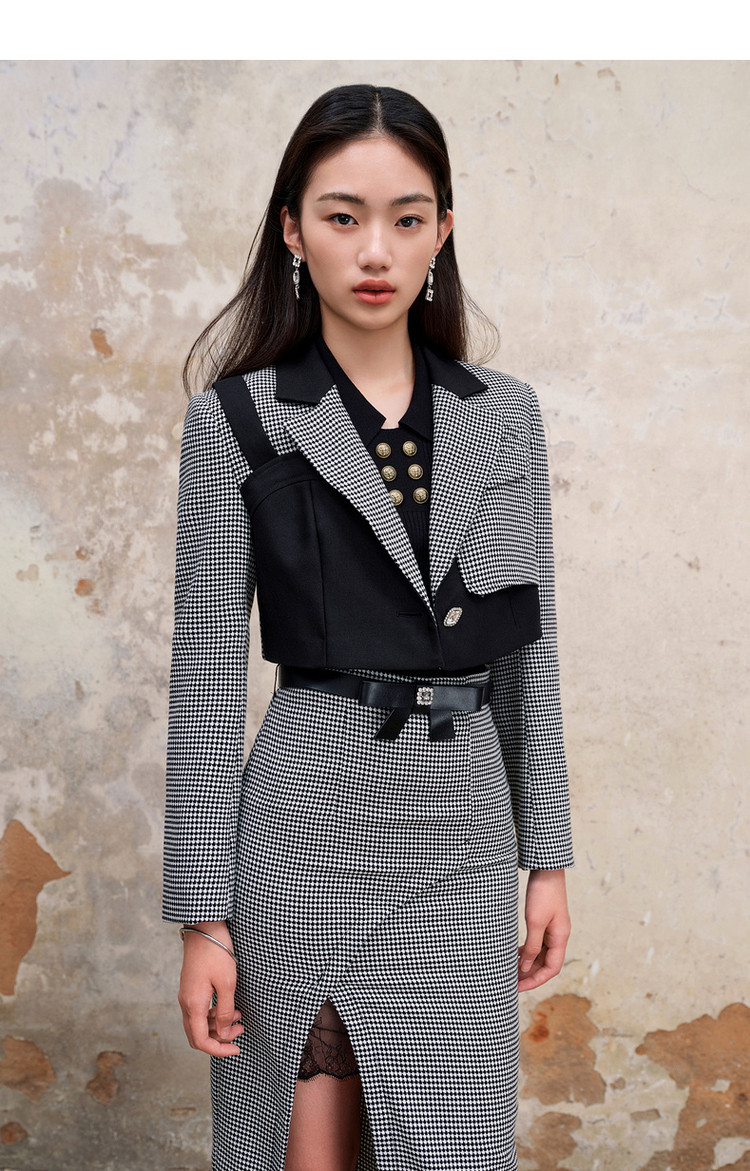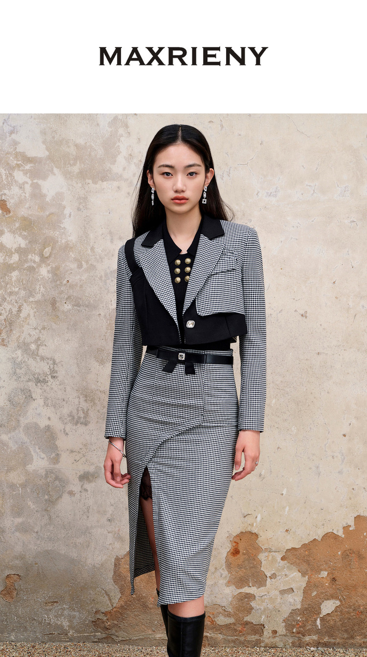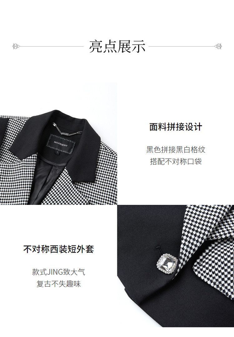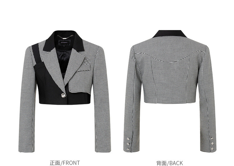 MAXRIENY通勤风黑白拼接格纹不对称西装截短款2023早秋短外套女MS88JA547Z00