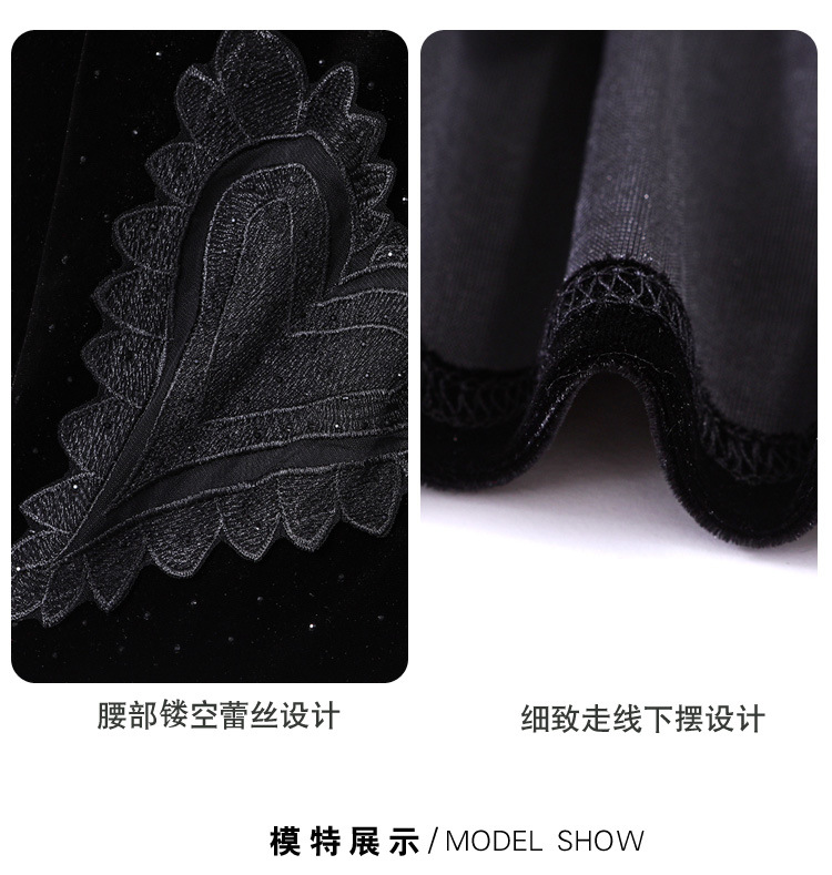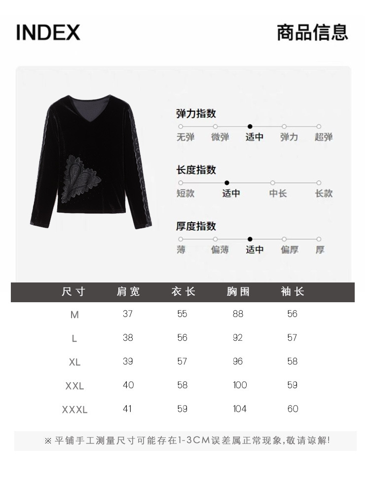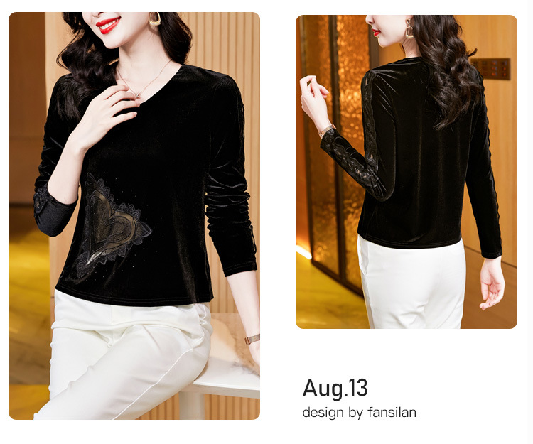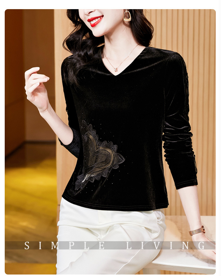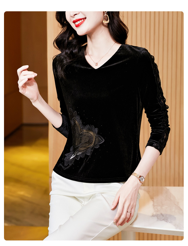 KQL E37M2917新款V领气质丝绒蕾丝拼接长袖打底小衫