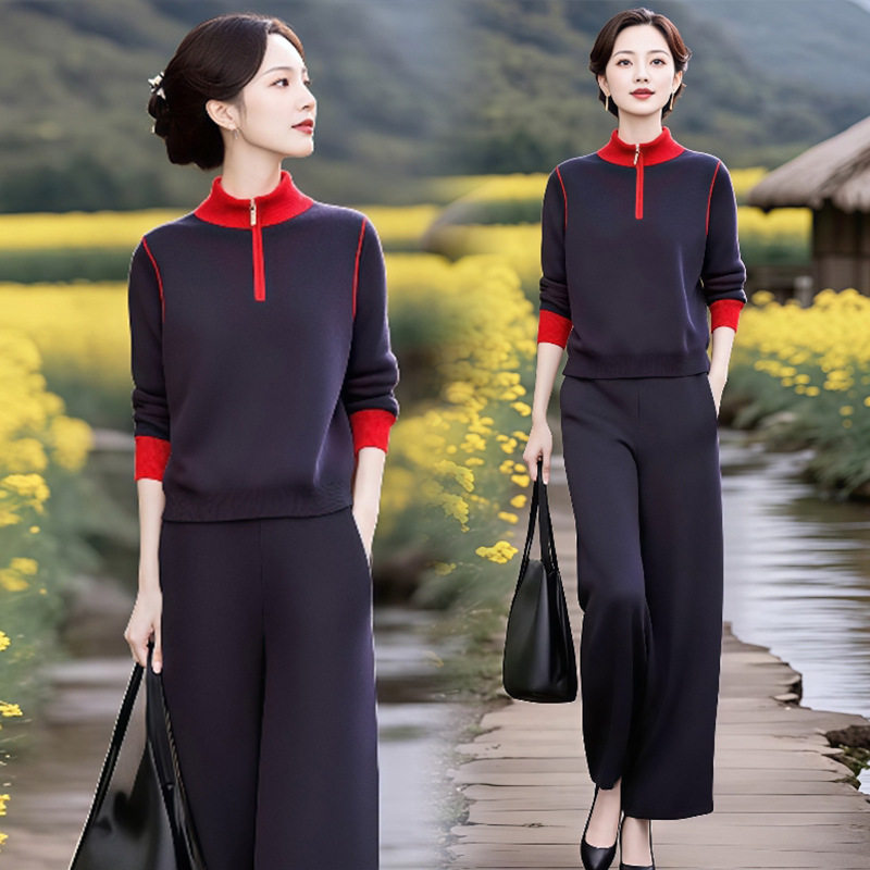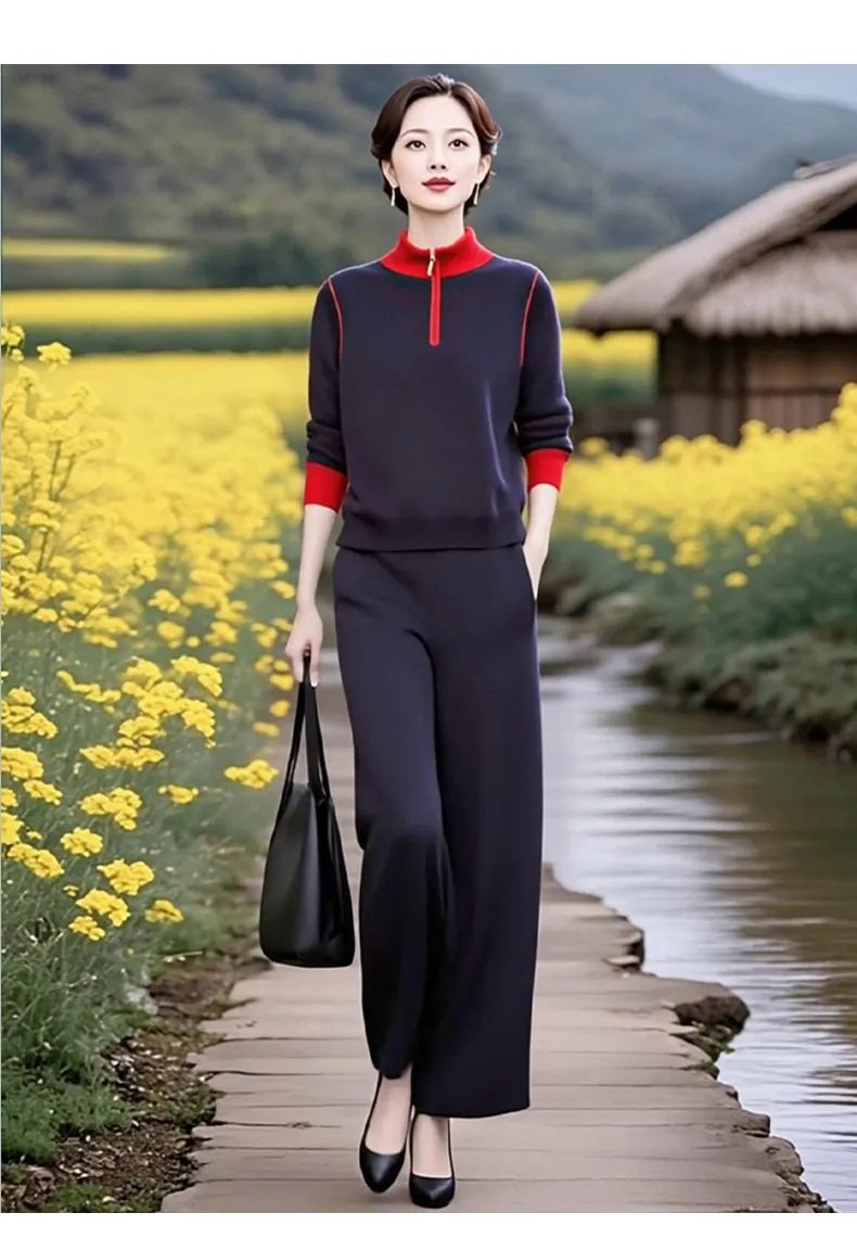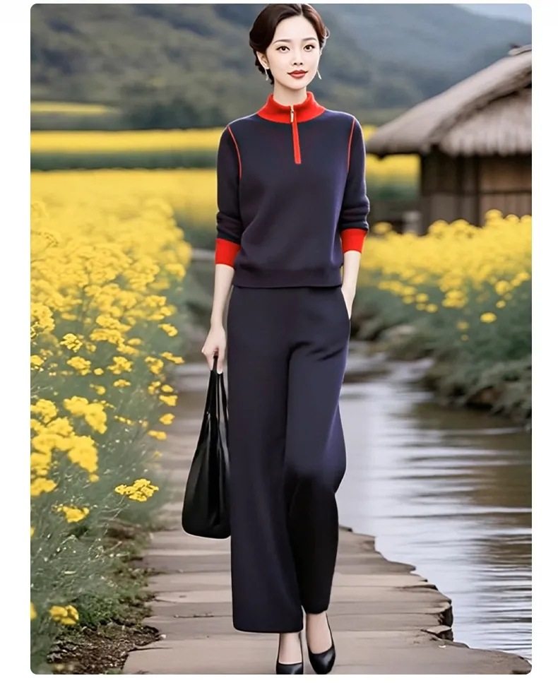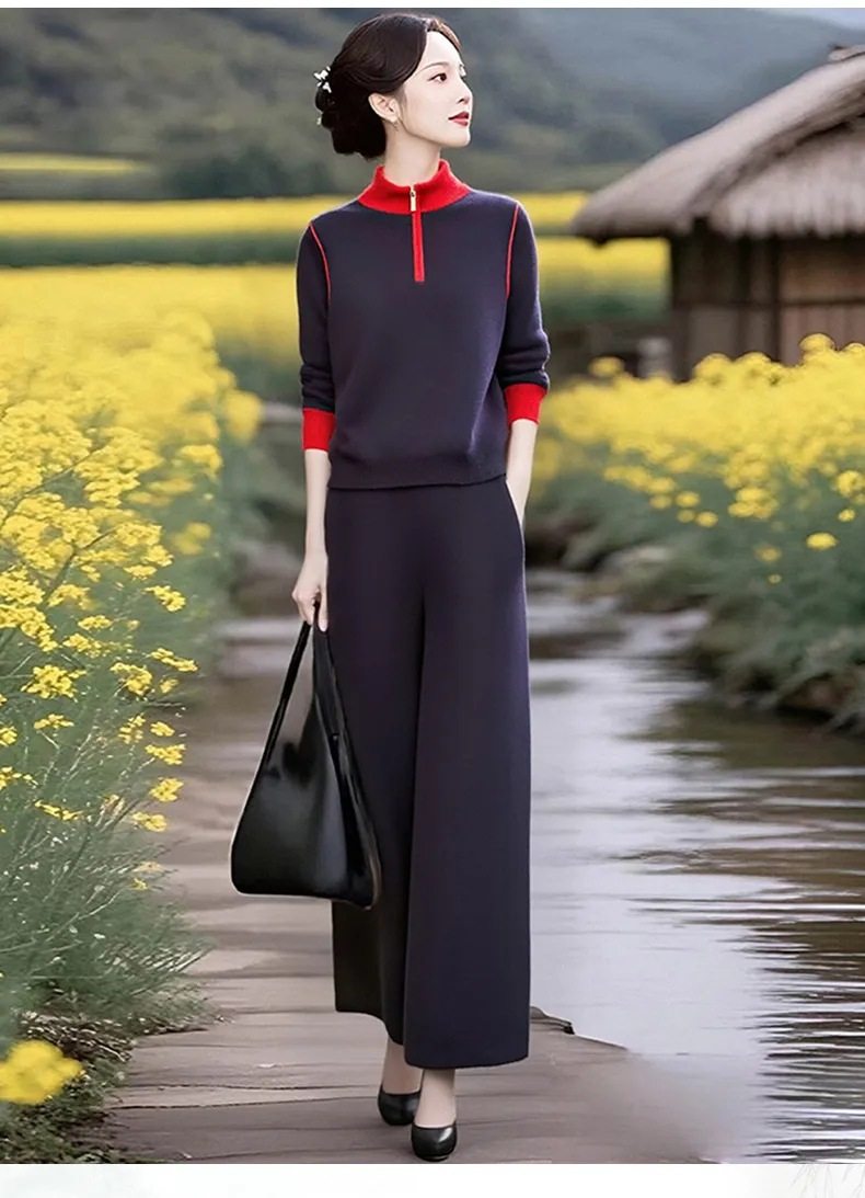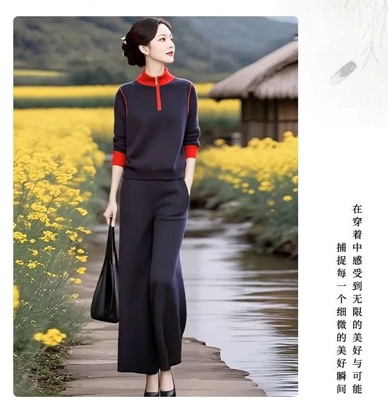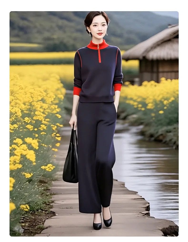 XMZ1290超火减龄2025秋季时尚拼色立领针织衫套装女秋季高腰直筒裤绵羊绒