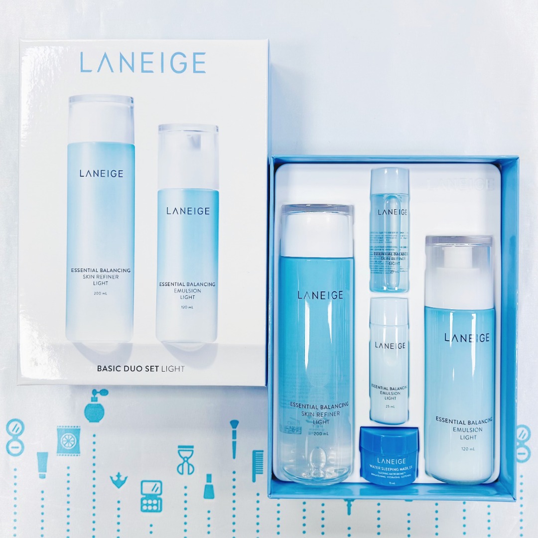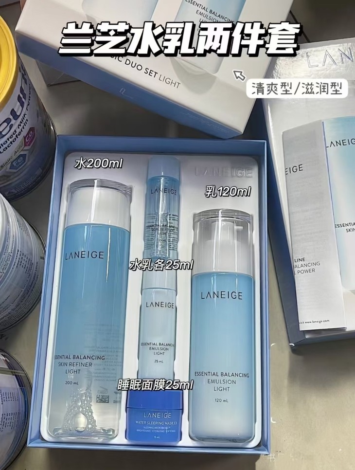 👑兰芝 清爽两件套 🌿成分:烟酰胺、维C、桦树汁等提取物✨。 🔥功效:基础补水保湿✔️、改善闭口✔️、强韧屏障✔️ 🤲清新水分感两件套,轻柔丝滑💧,不粘腻☁️。 💥适合:油性/混油皮 【套盒包括】:水200ml+乳120ml+水乳各25ml+睡眠面膜15ml