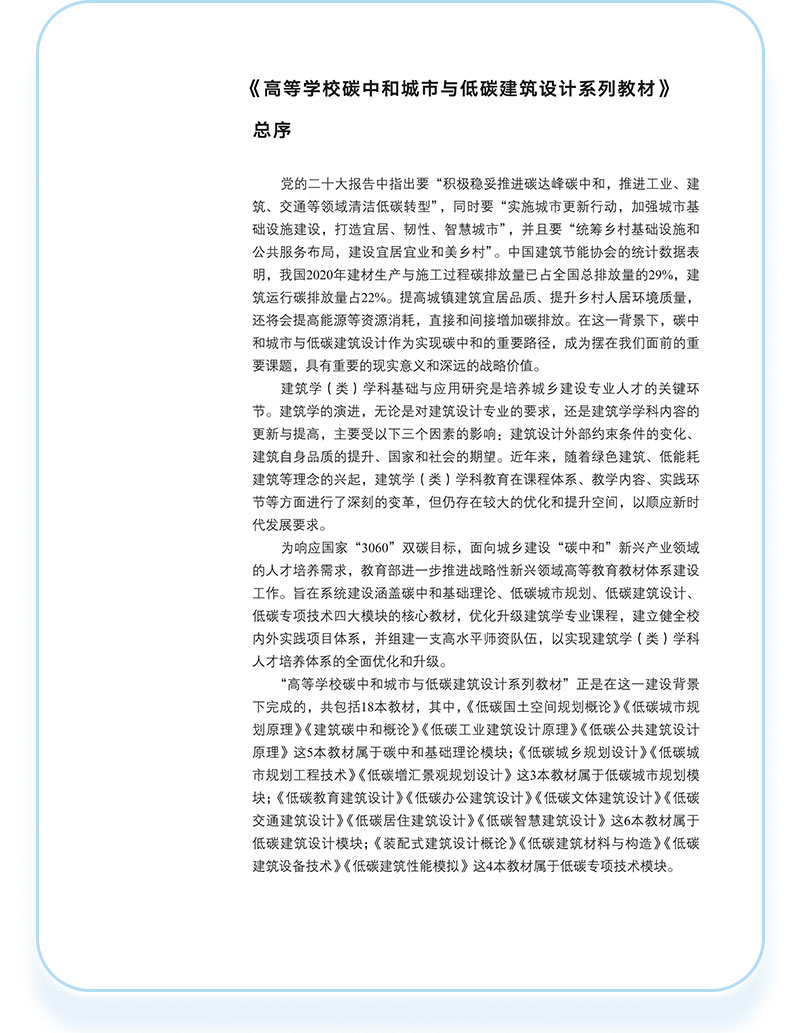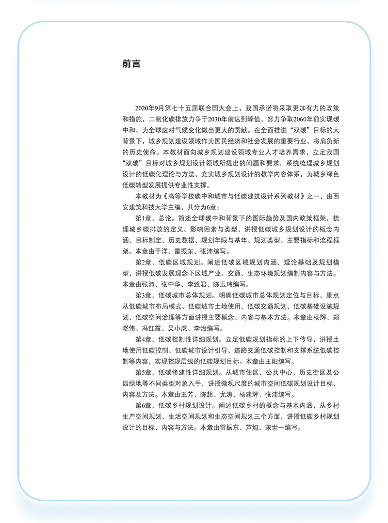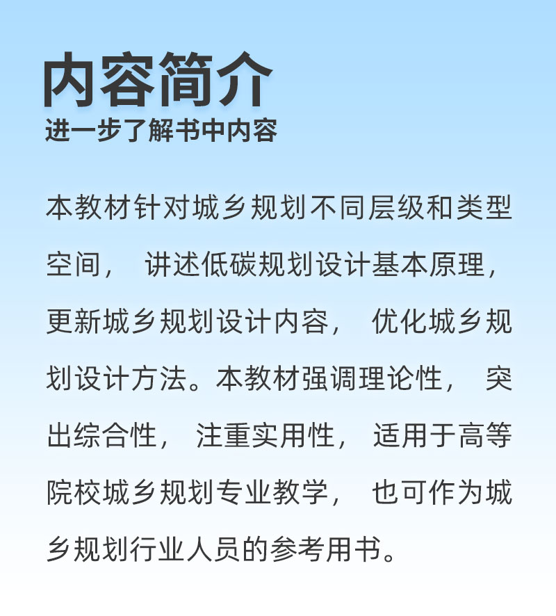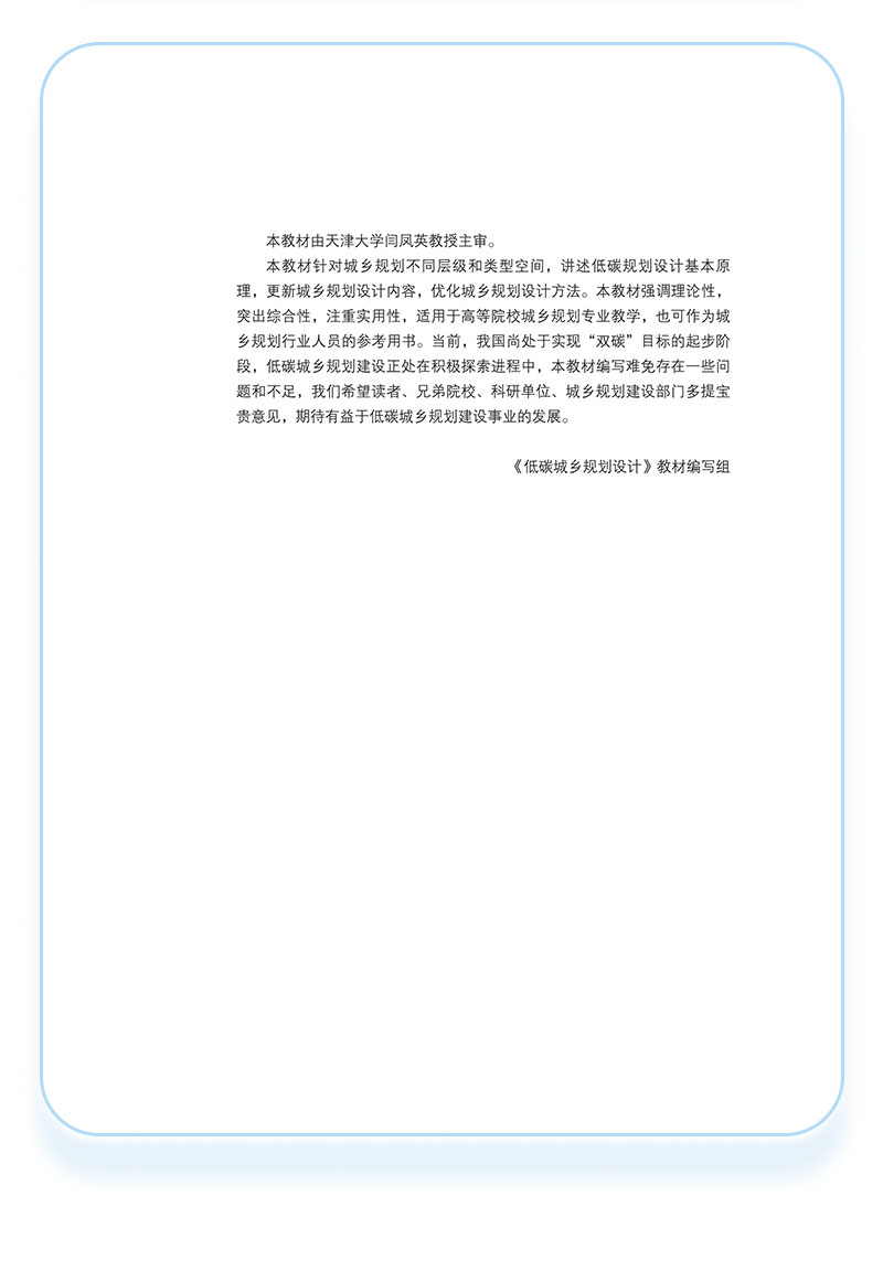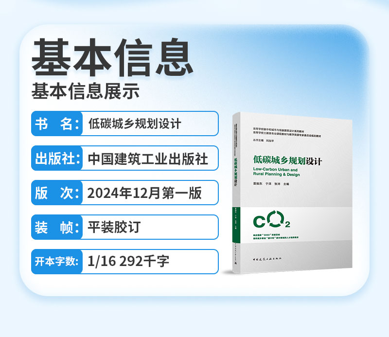 为应对中国城市低碳化发展面临的挑战,推动和传播低碳城市研究和城市规划 新技术编写本教材。教材内容源于编写团队成员近十年的国际合作项目和国家级科研项目在城市规划和低碳城市研究领域的丰富经历、理论技术成果和众多示范案例,内容翔实,数据真实,验证效果可靠。教材研究同时依托校内教学改革项目“规划设计虚拟仿真实验教学”与“城乡规划技术驱动型创新创业教学实践”等教改任务,教学改革创新目标明确,教改研发成果与教材拟完成时间同步。
