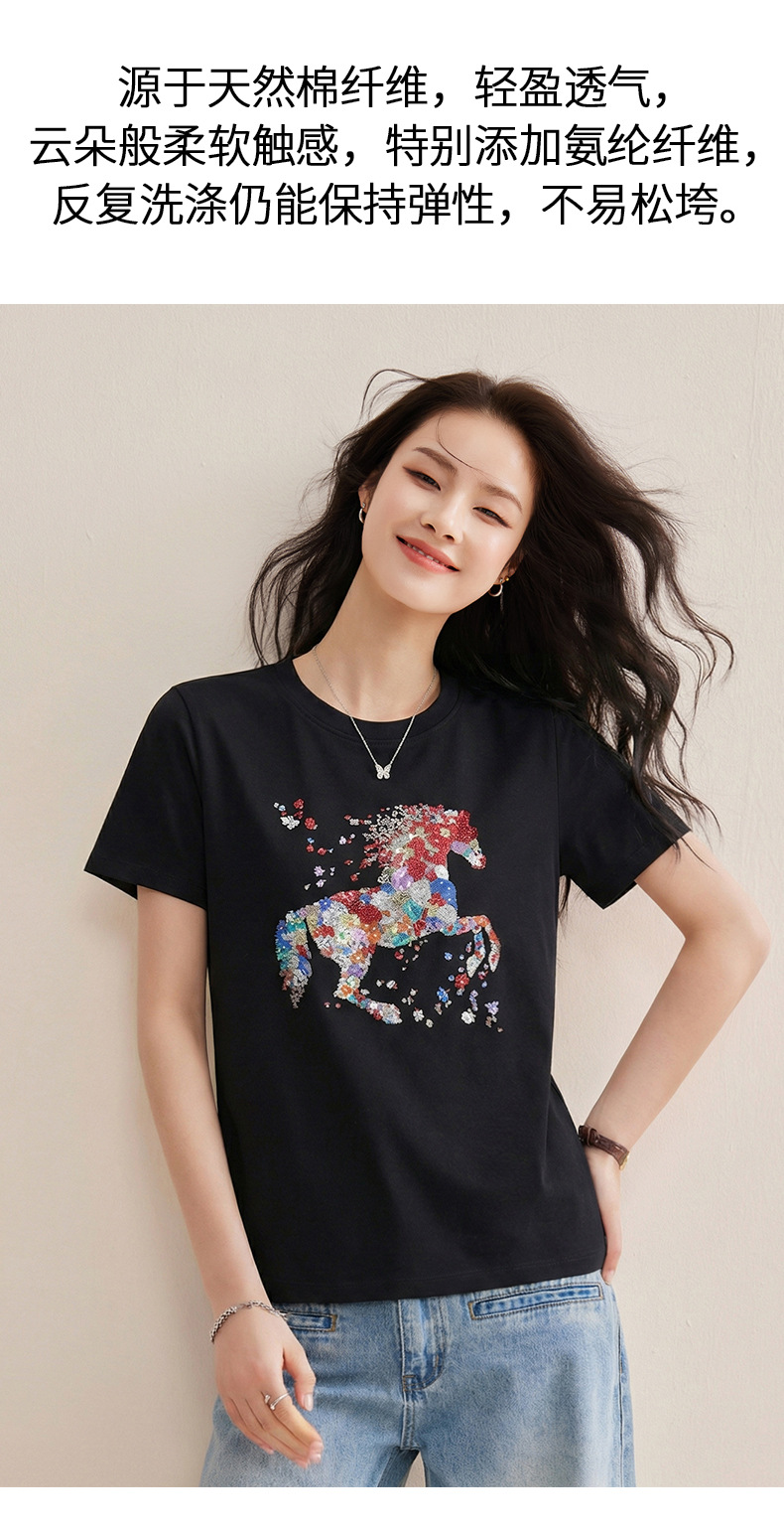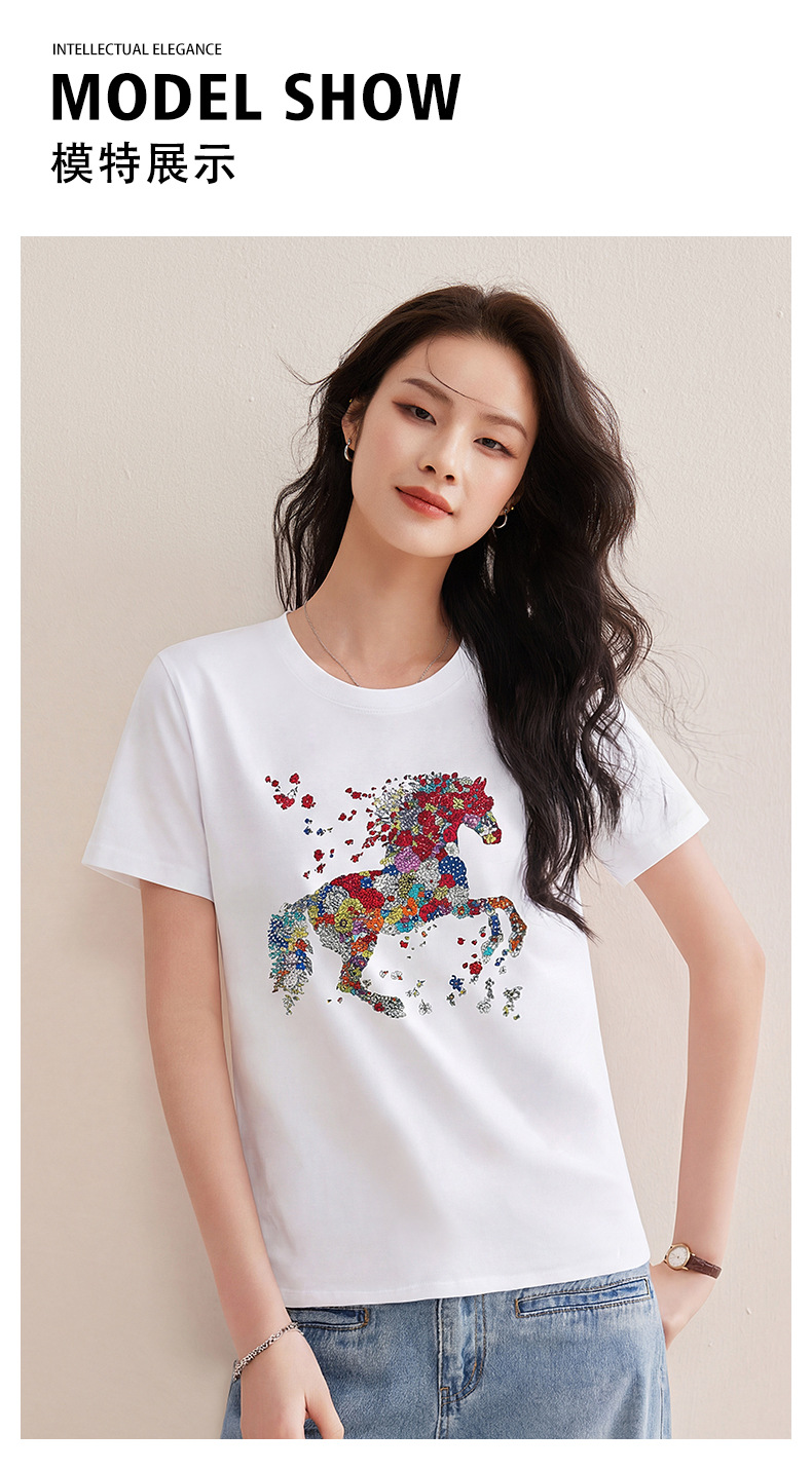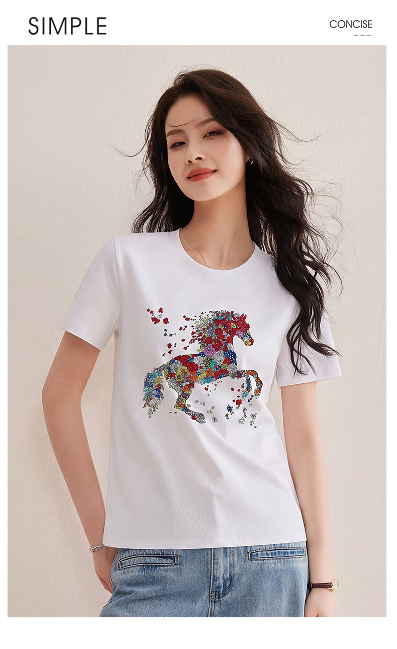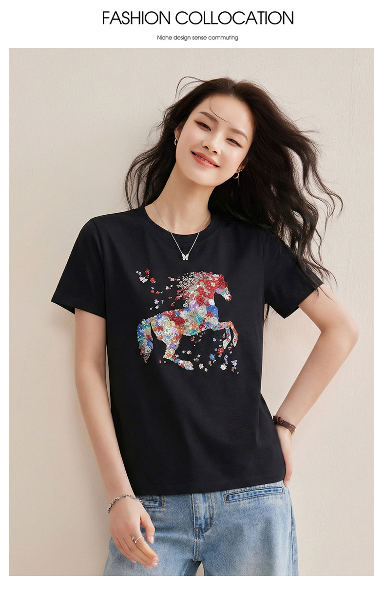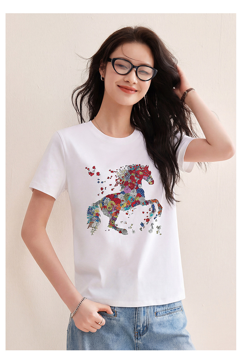 丁摩 【彩“财”马】春季新时尚亮钻圆领宽松百搭卡通印花短袖t恤5ZF-1193