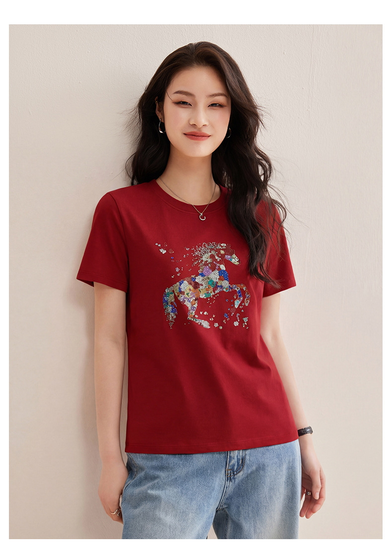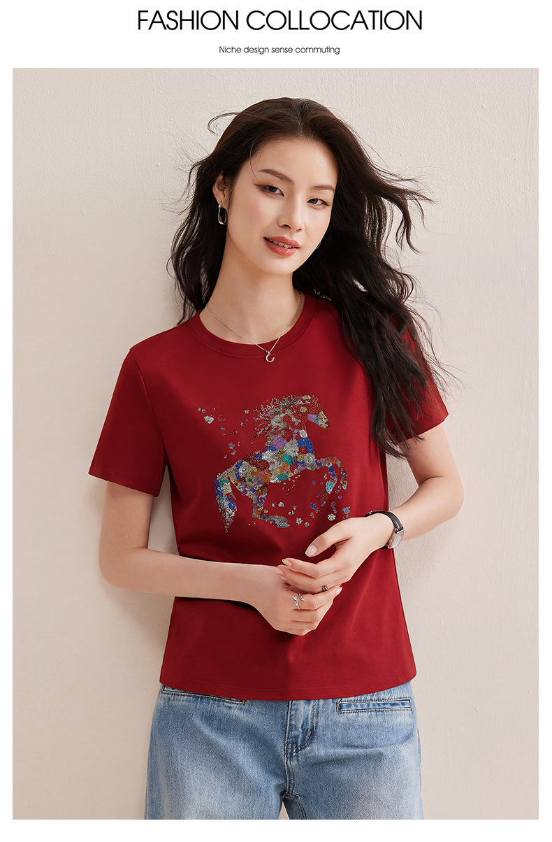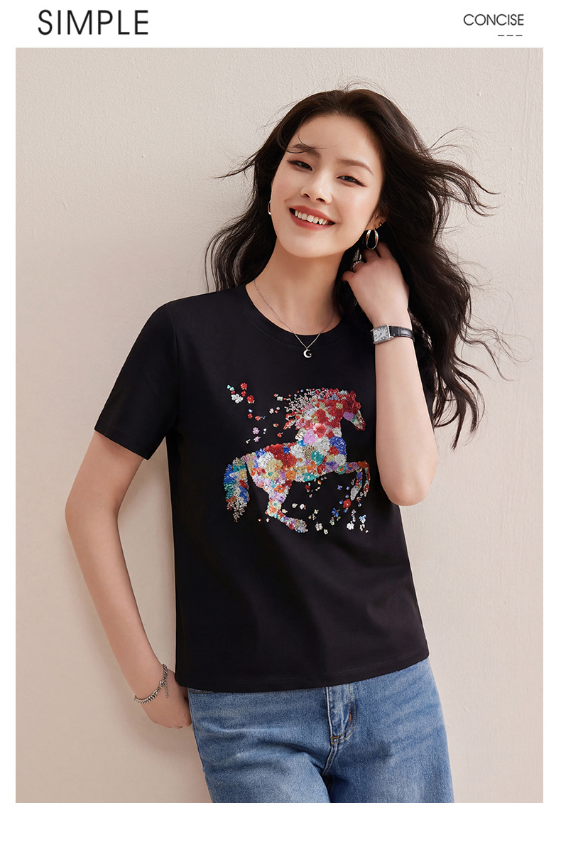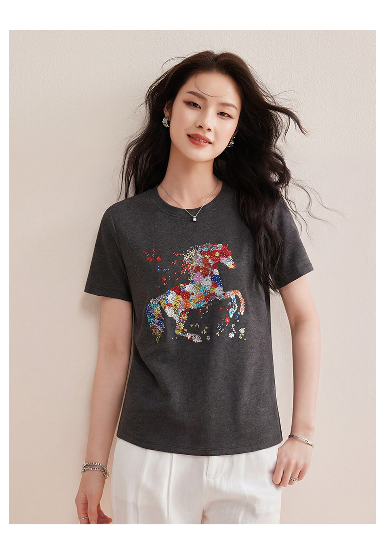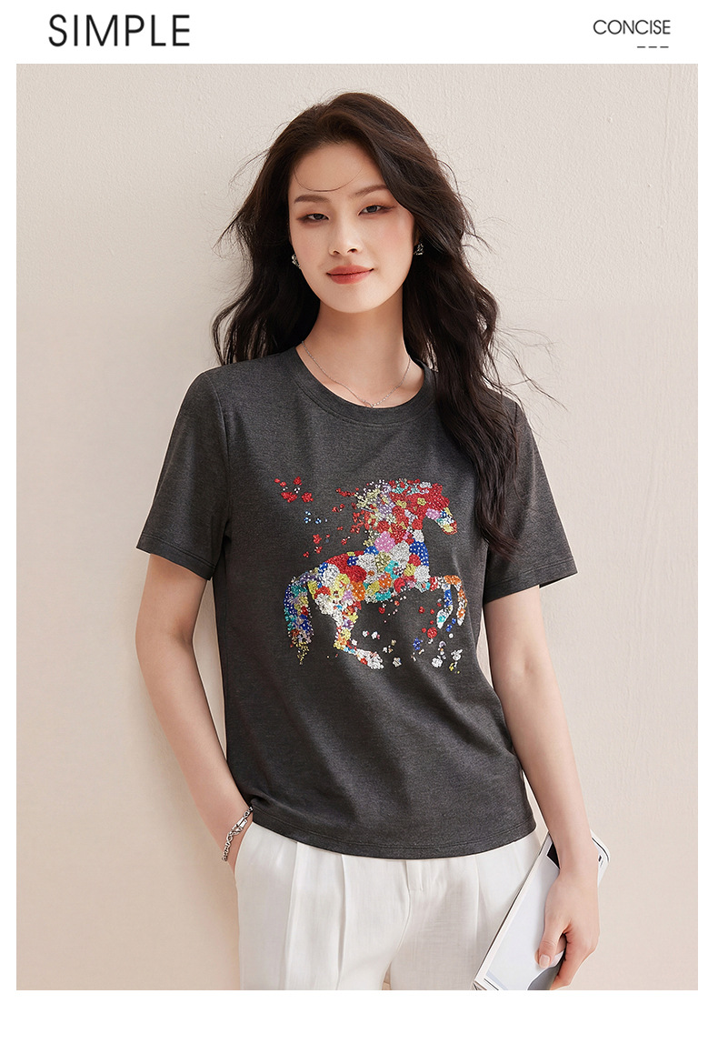 丁摩 【彩“财”马】春季新时尚亮钻圆领宽松百搭卡通印花短袖t恤5ZF-1193