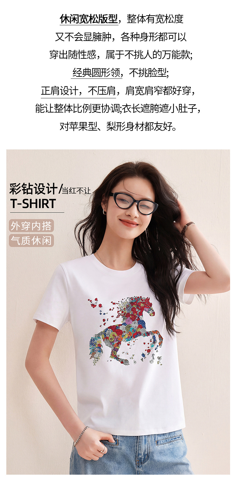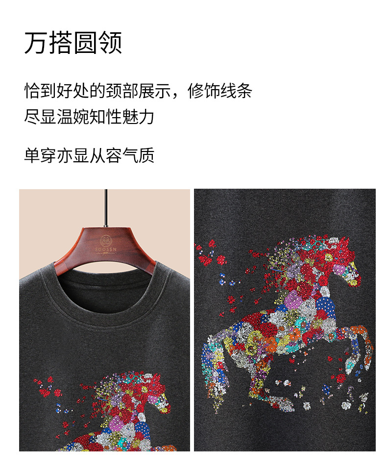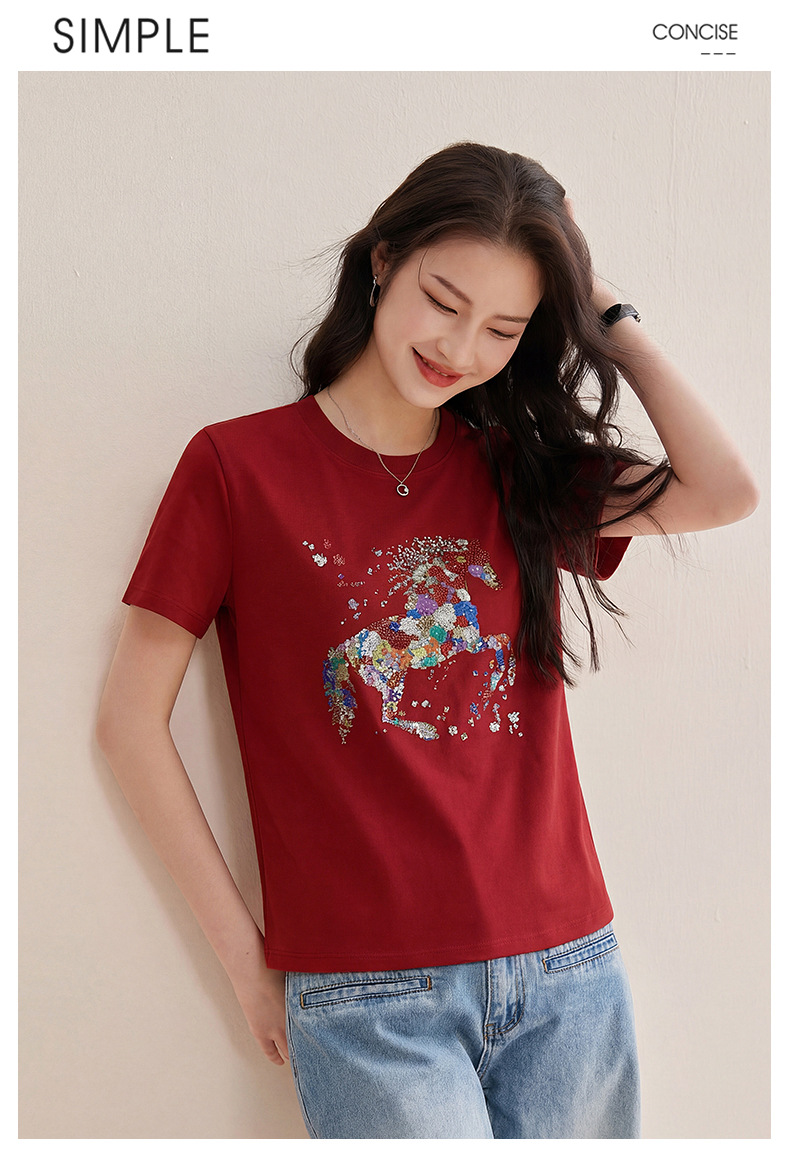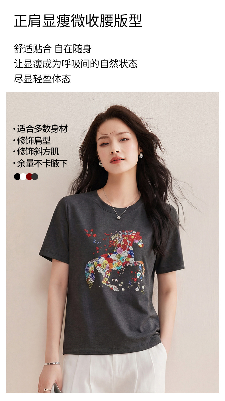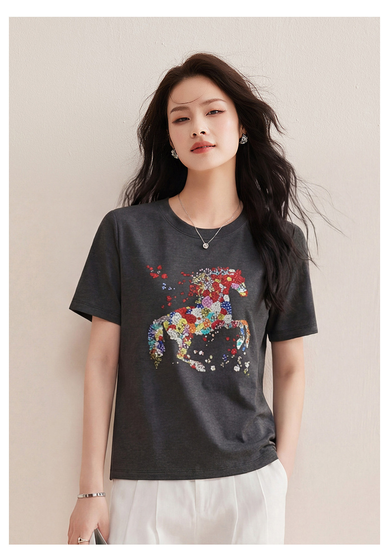 丁摩 【彩“财”马】春季新时尚亮钻圆领宽松百搭卡通印花短袖t恤5ZF-1193