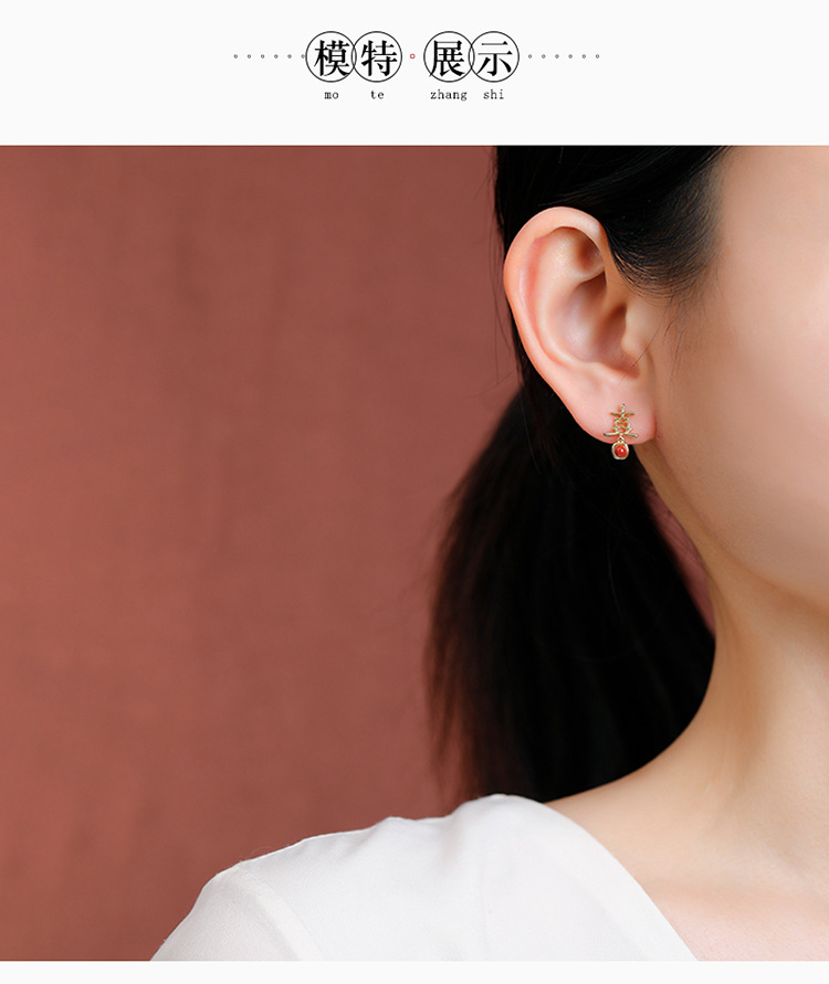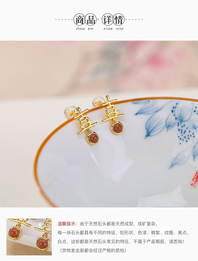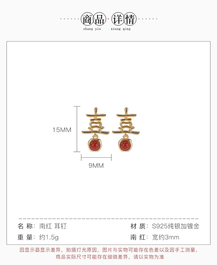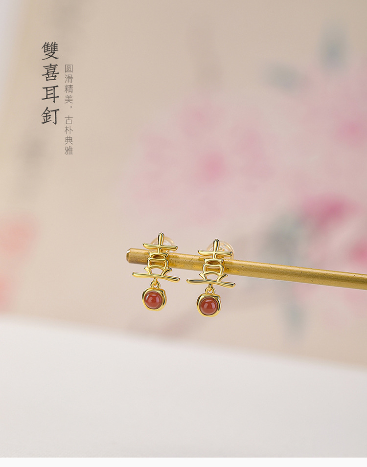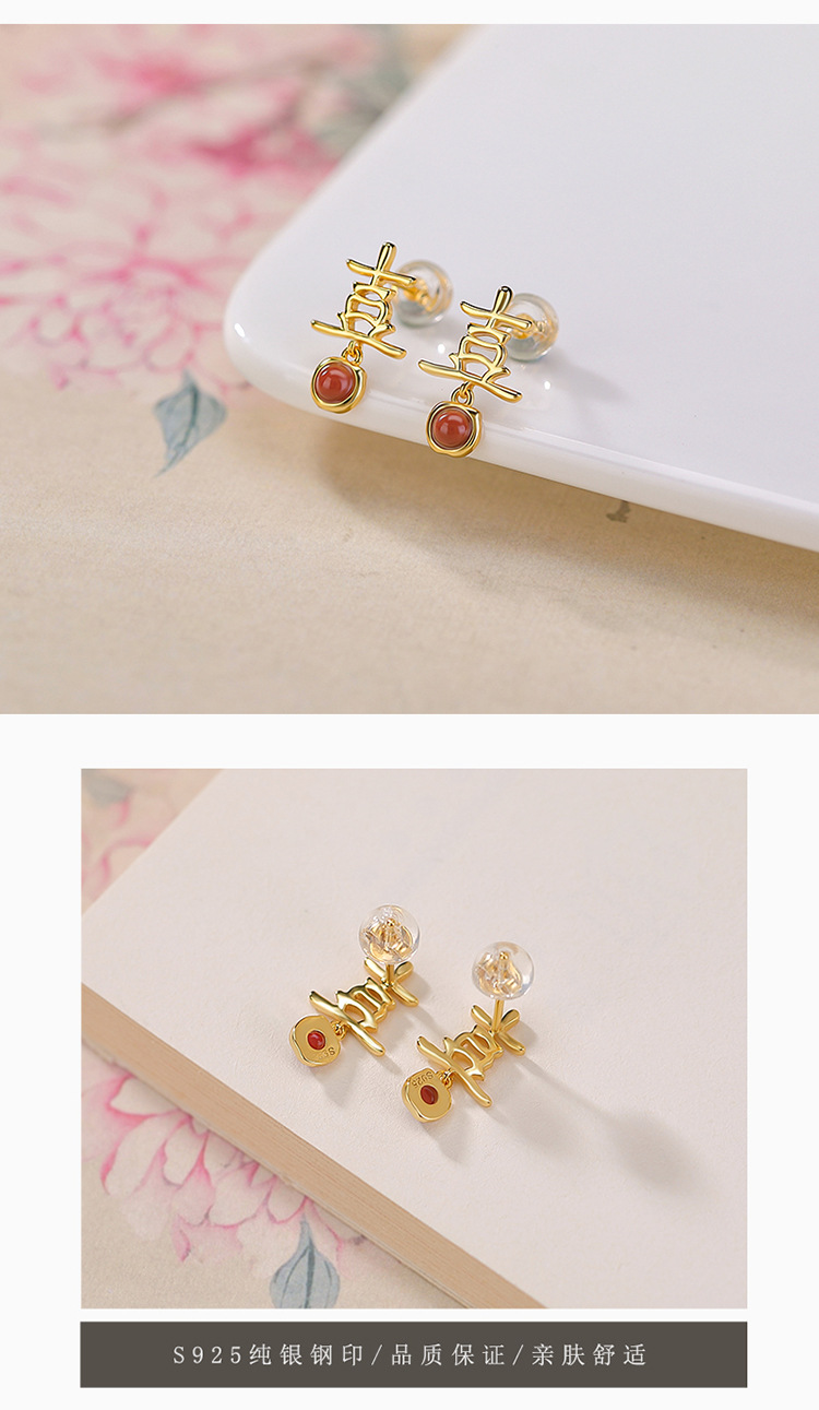 S925纯银南红玛瑙耳钉,复古新中式喜字双喜耳饰订婚CW-ED03982
