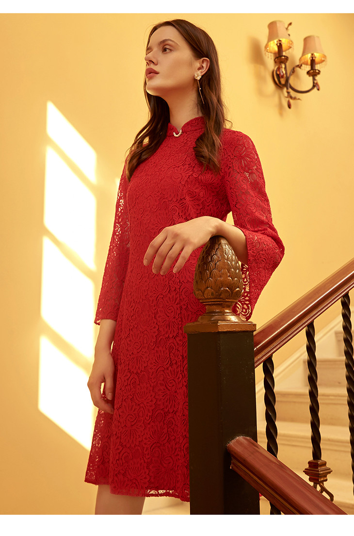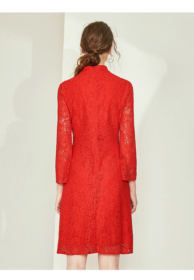 EITIE爱特爱女装秋季新钉珠开叉茶卡盐湖红色修身蕾丝连衣裙C1907304