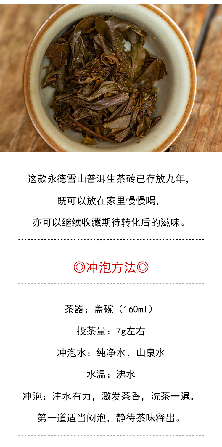 茶香记 永德雪山普洱生茶砖013 高山古树 春茶原料 内质丰富 香纯汤净