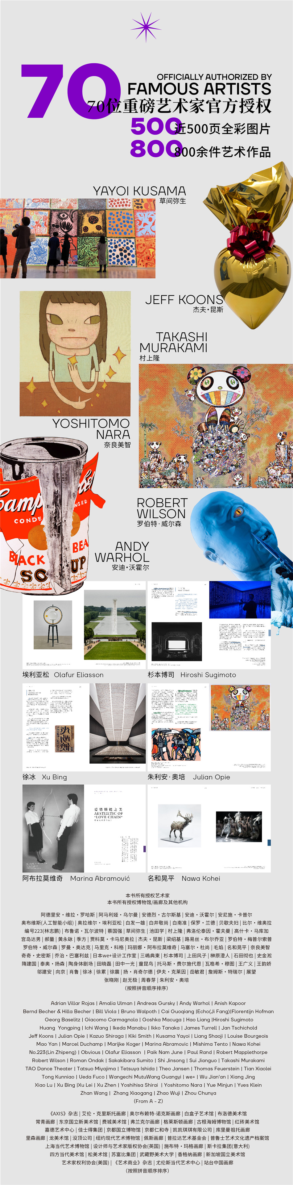本书由著名艺术家徐冰作序,并获得草间弥生、奈良美智、埃利亚松、杰夫·昆斯、阿布拉莫维奇、徐冰、比尔·维奥拉、杉本博司、安尼施·卡普尔、村上隆等国际重磅艺术家授权。