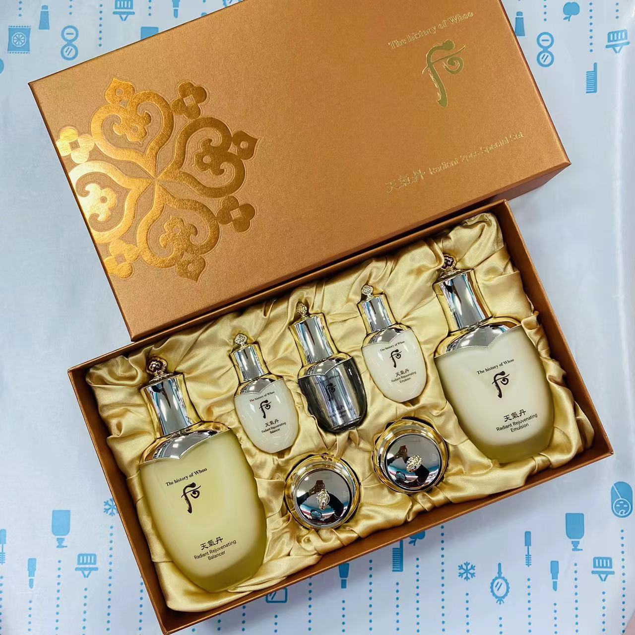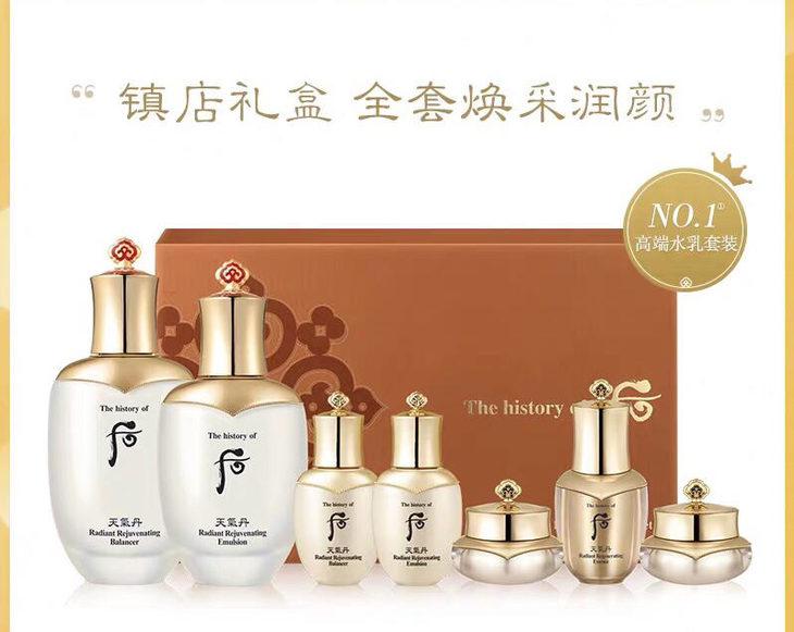 👑WHOO后天气丹水乳二件套(公司版) 👍提亮肤色、抗氧化、深層修復 🎏适合人群:任何肤质,有细纹松驰的肌膚 💃🏻功效:提亮肤色、抗老化,油水平衡🌰,皮肤再生 🍀深层修复调养,全效护理,抗氧化效果,💪🏻能从根本上解决肌肤的💋油水平衡问题, 💦促进肌肤细胞的迅速代谢和再生。這是女人“不老”的秘密㊙️ 【套盒包括】:水150ml+25ml、乳110ml+25ml、天氣丹精華8ml、天氣丹面霜10ml、天氣丹眼霜5ml✨