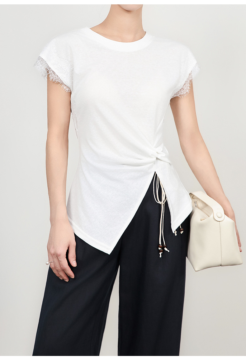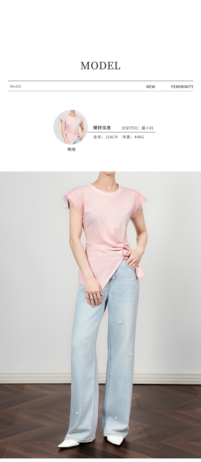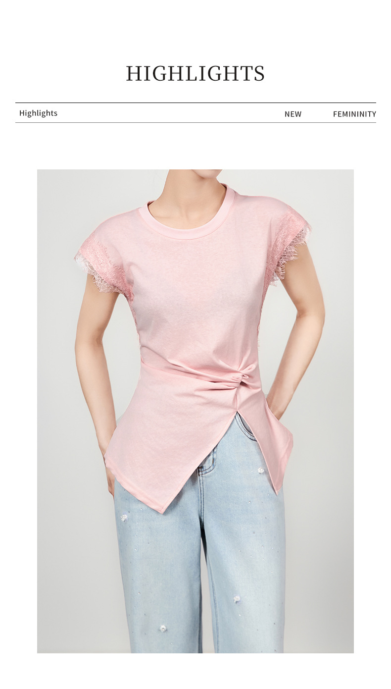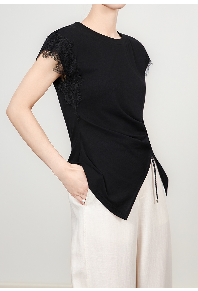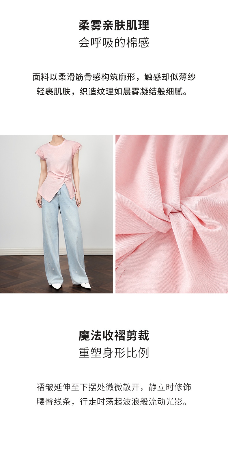 「高货wl」全新升级【铂金会员165/天猫219/差价54】(14459)洛诗琳夏季新款小众设计感蕾丝拼接褶皱收腰显瘦圆领T恤